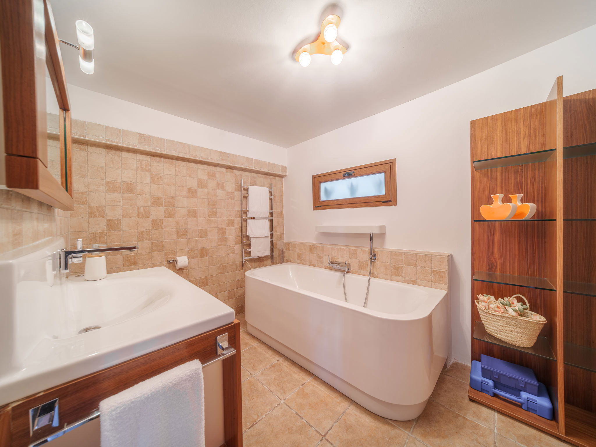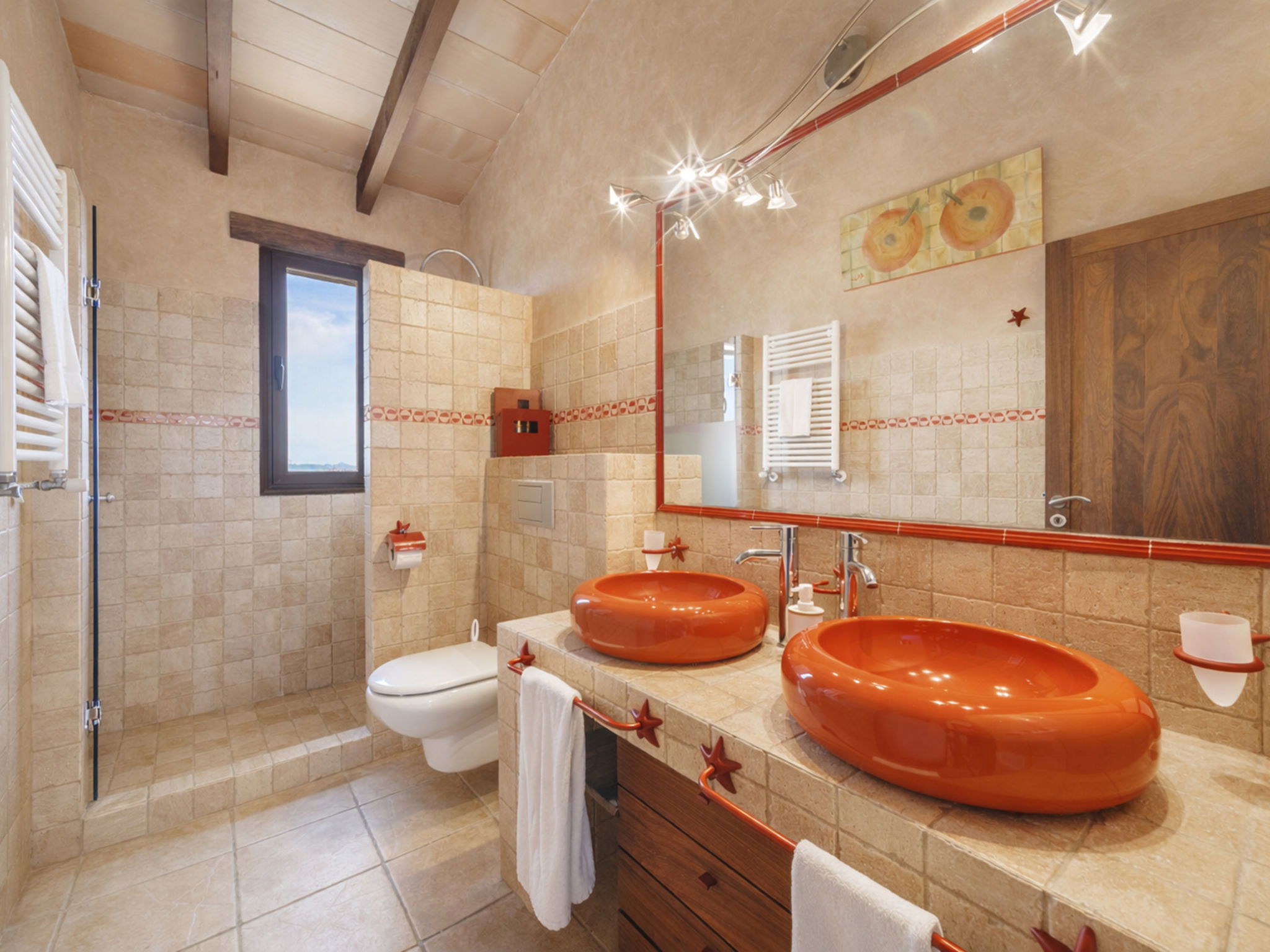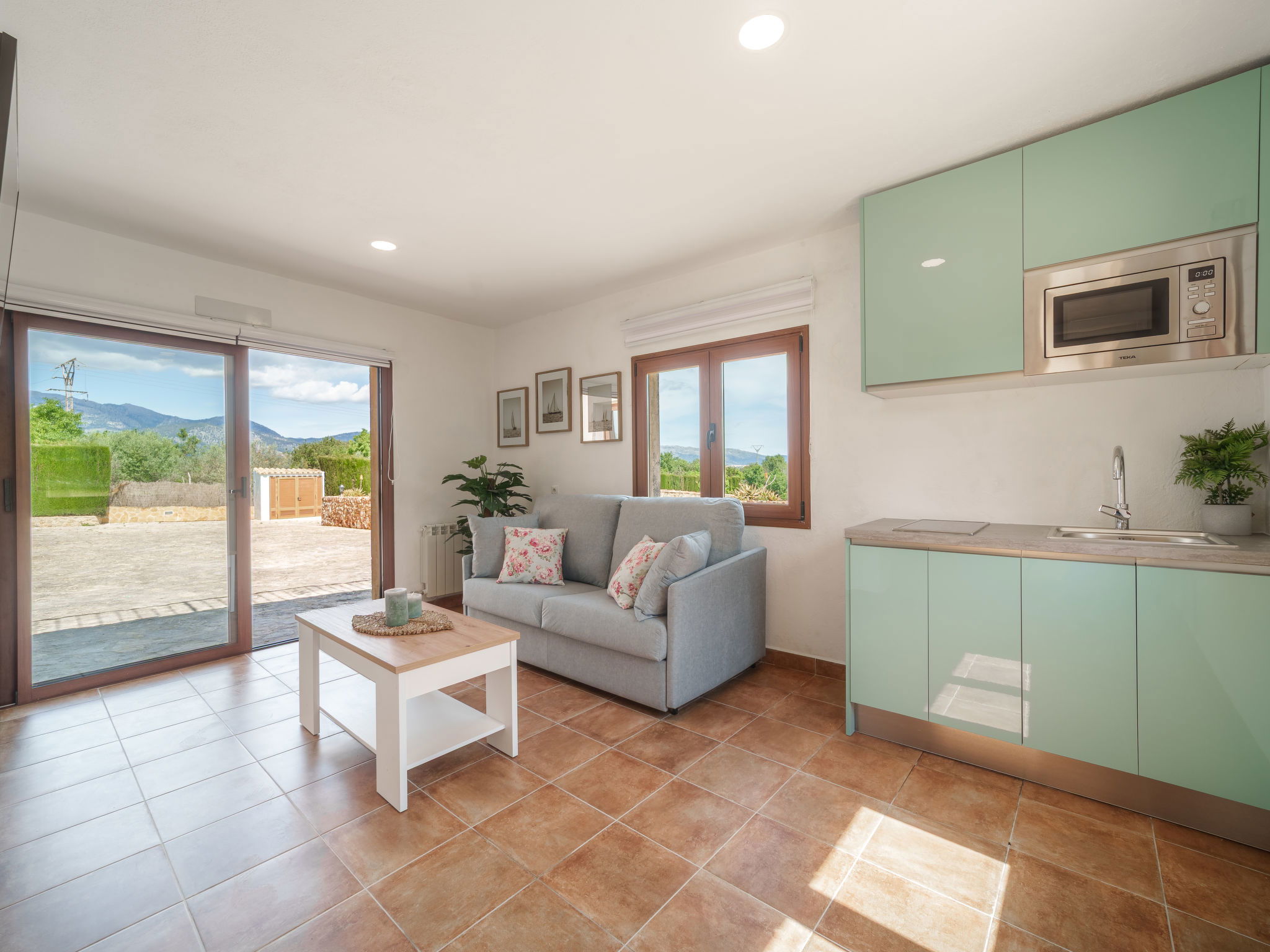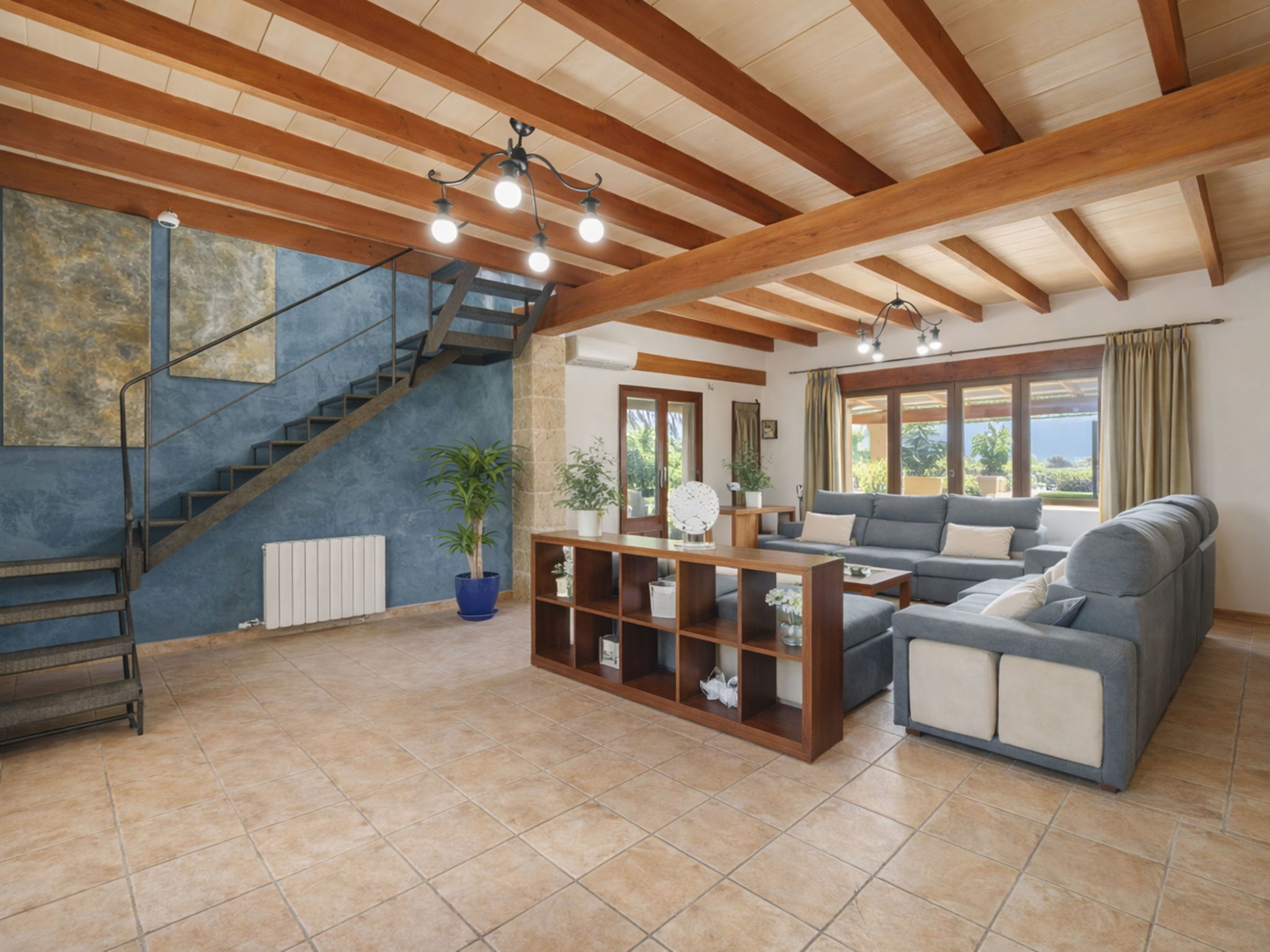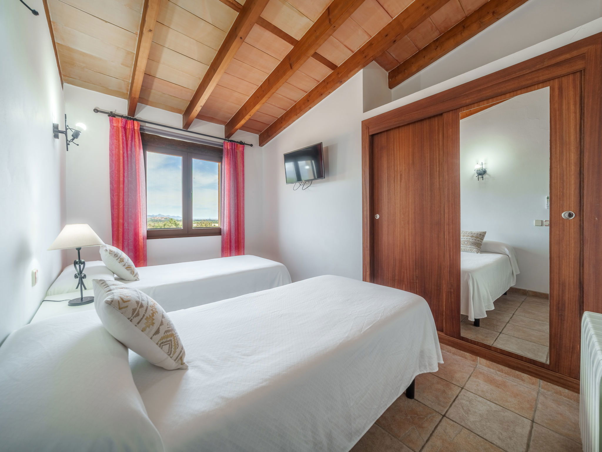 "Son Bosc", 6-room villa 450 m2 on 2 levels. Object suitable for 9 adults. Spacious and bright, fully renovated, comfortable and cosy furnishings: large living room with panoramic window with digital TV, flat screen, air conditioning and forced-air heating. Exit to the patio. 1 large double bedroom with sliding door with 2 beds (90 cm, length 200 cm), digital TV, flat screen, air conditioning and forced-air heating. Exit to the patio. Lounge with digital TV, flat screen, air conditioning and forced-air heating. Exit to the patio. Kitchen-/living room (oven, dishwasher, 3 ceramic glass hob hotplates, microwave, freezer, electric coffee machine) with dining table, open-hearth fireplace (only for decoration), air conditioning and forced-air heating. Exit to the patio. Bath/WC, shower/WC. Upper floor: 1 large double bedroom with panoramic window Dressing room with 1 french bed (180 cm, length 200 cm), digital TV, flat screen, air conditioning and forced-air heating. (ladder), 1 double bedroom with panoramic window with 1 french bed (150 cm, length 200 cm), digital TV, flat screen, air conditioning and forced-air heating. (ladder), 1 double bedroom with panoramic window with 2 beds (90 cm, length 200 cm), digital TV, flat screen, air conditioning and forced-air heating. 1 large double bedroom with panoramic window with 1 french bed (150 cm, length 200 cm), air conditioning and forced-air heating. Exit to the balcony. 2 showers/WC, double hand-basin. Natural stone floors. Large balcony, large patio, lawn, porch. Terrace furniture, barbecue, deck chairs (9), covered balcony, sitting area. Very beautiful view of the mountains and the countryside. Facilities: washing machine, dryer, iron, children's high chair, baby cot for up to 2 year olds, hair dryer. Internet (WiFi, free). Parking (roofed), garage on the property at the house. Please note: suitable for families one double bedroom is outside the apartment. No lift. The pool mentioned in the description is for private use. ETV/11105 // Reg. Nr.: ESFCTU0000070110000267710000000000000000000ETV/111052