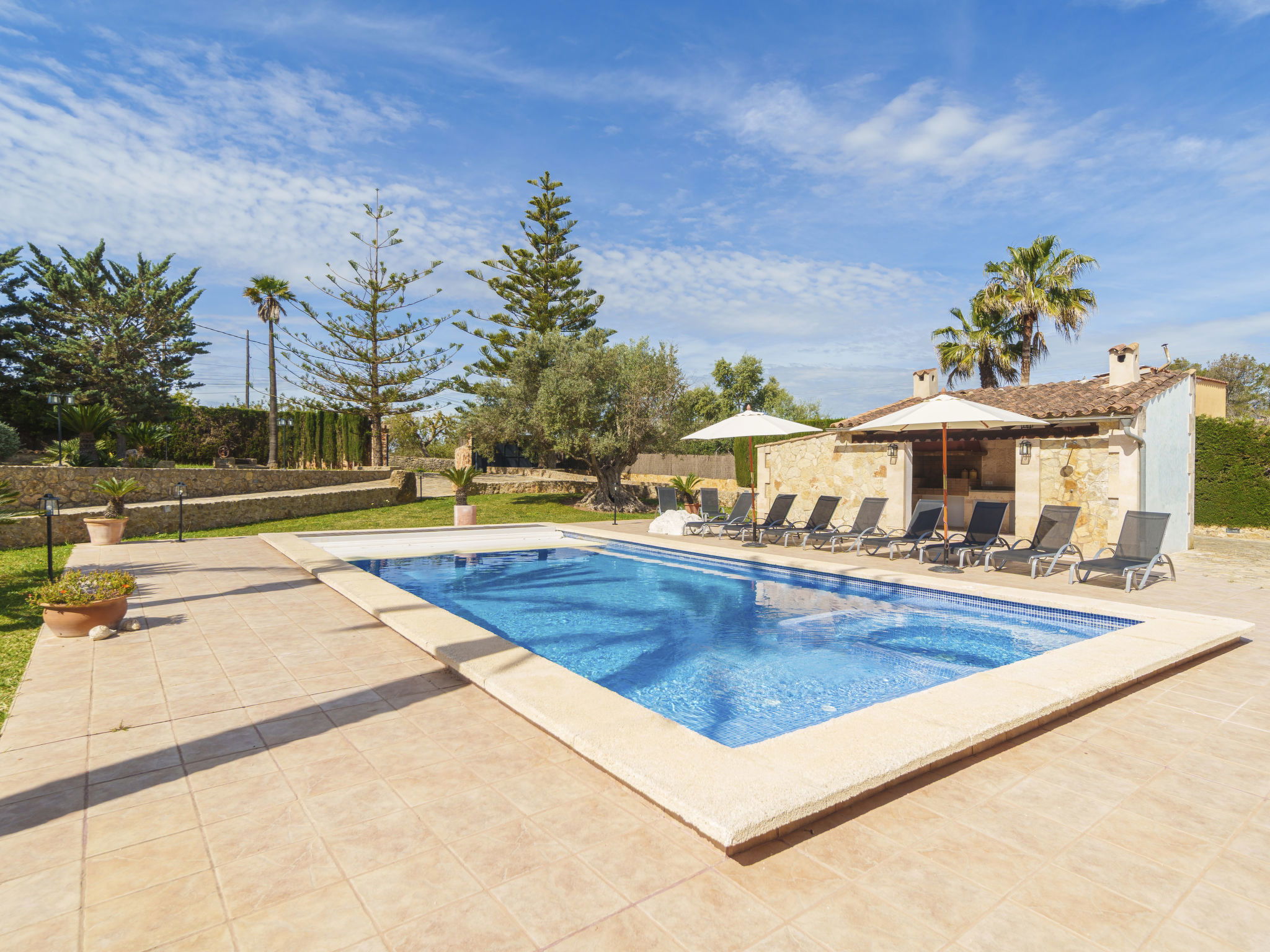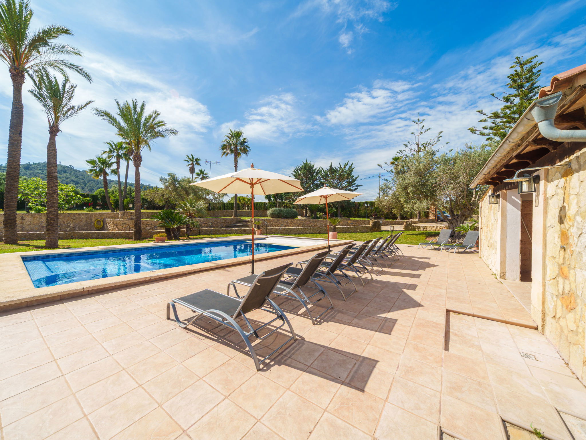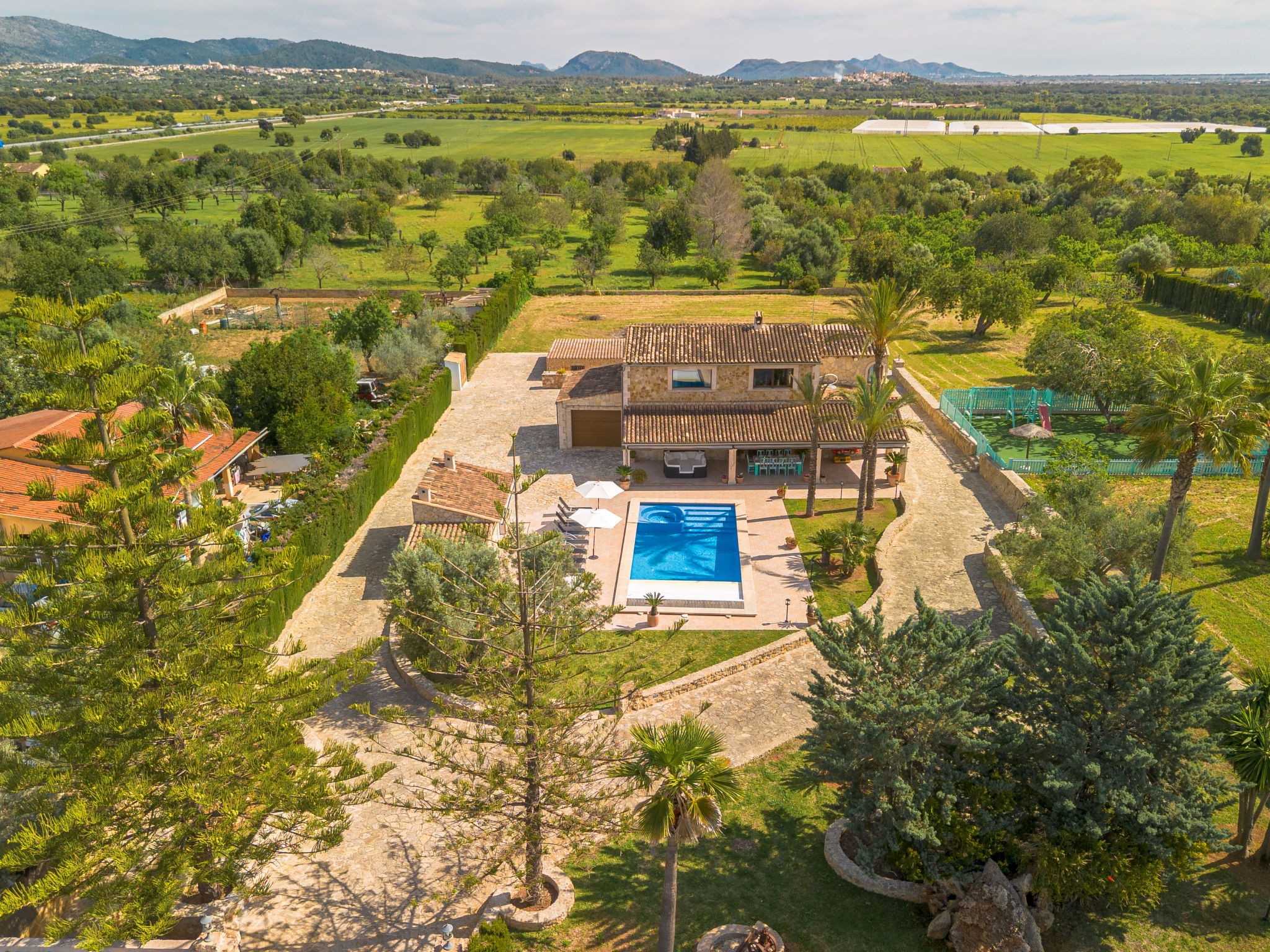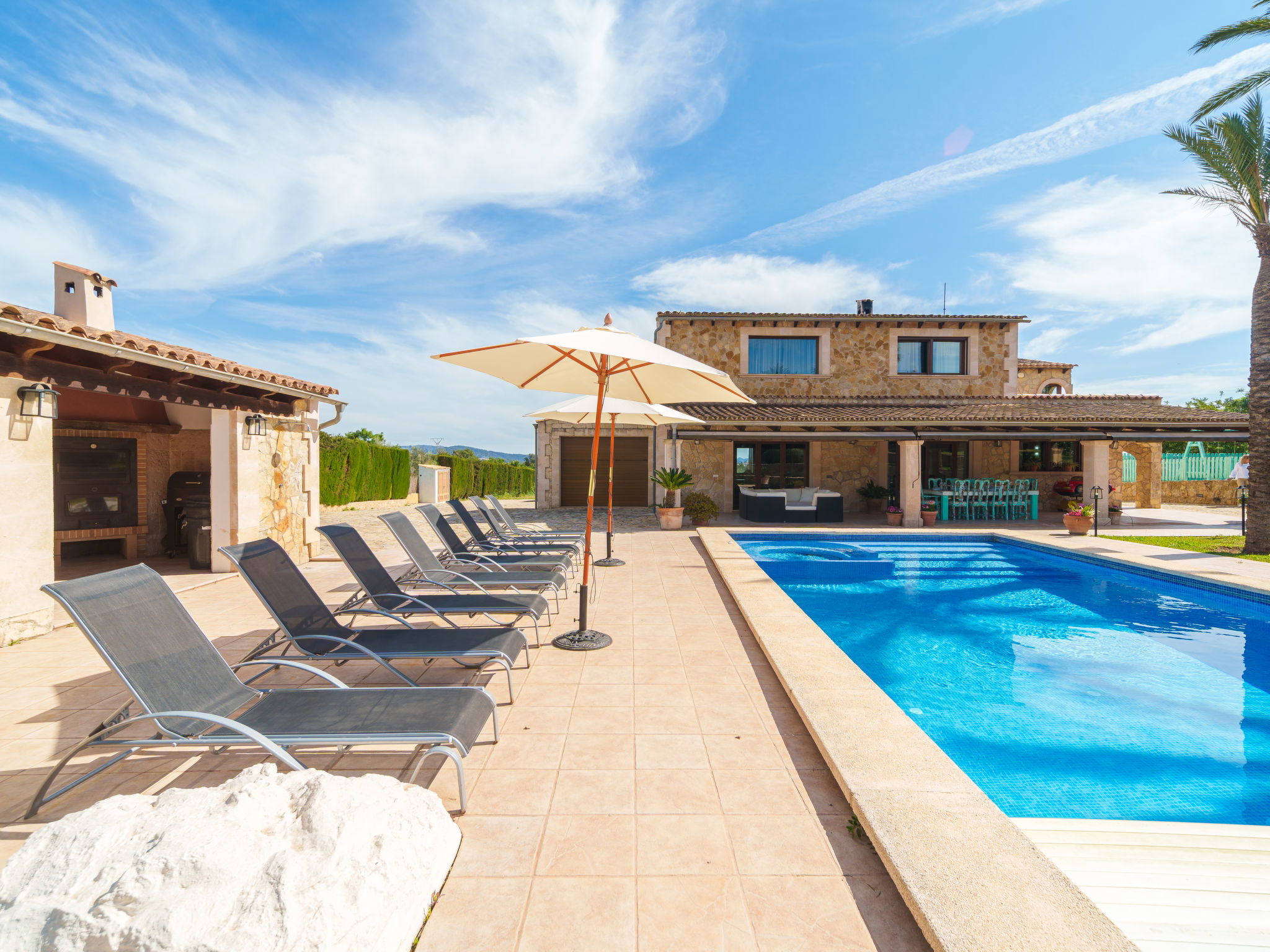 Very large, beautiful villa "Son Bosc", 2 storeys, surrounded by trees. Outside the resort, 4 km from the centre of Inca, in a quiet, sunny position residential area (villas), 2 km from the edge of the forest, 20 km from the sea, in the countryside. Private: property (fenced), garden with lawn and wildlife garden, swimming pool angular (11 x 5 m, depth 30 - 200 cm, seasonal availability: 01.Jan. - 31.Dec.). Outdoor shower, patio, arbour, pergola, garden furniture, barbecue, children's playground (slide, swing), pool maintenance by the owner/gardener. In the house: internet access, WiFi, storage room for bicycles, central heating system, air conditioning, washing machine, tumble dryer, heating available only from 01.Nov. - 31.Mar.. Parking at the house on the premises, single garage. Shop 5 km, grocery 5 km, supermarket 5 km, restaurant 3.5 km, bar 5 km, bakery 5 km, café 5 km, internet café 5 km, pedestrian zone 5 km, bicycle rental 5 km, pub garden 5 km, 60 minute walk to the centre, bus stop 5 km, railway station 5 km, sandy beach "Port Alcúdia" 23 km, rocky beach 23 km. Sports harbour 25 km, marina 25 km, golf course (18 hole) 25 km, sailing school 30 km, tennis 5 km, riding stable 8 km, sports centre 5 km, walking paths from the house 1.5 km, cycle lane 500 m. Nearby attractions: Ciudad de Inca 3.5 km, Palma de Mallorca 35 km, Mallorca Fashion Outlet & Cinemas 25 km, Pueblos:Búger-Campanet-Selva-Caimari. Playa y Faro de Formentor 35 km, Santuario de Lluc 22 km. Hiking paths: Puig de Santa Magdalena - Inca 3.6 km, Serra de Tramuntana. Please note: car recommended. Suitable for families. Object suitable for 9 adults. The owner does not accept any youth groups. Animals in the neighbourhood. Motorway 400 m from the property. Airfield 39.6 km from the property.