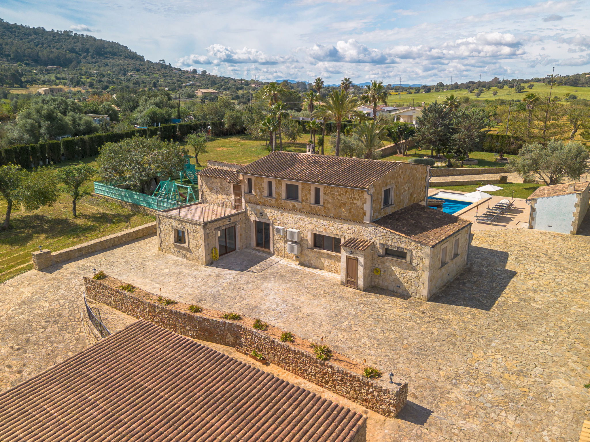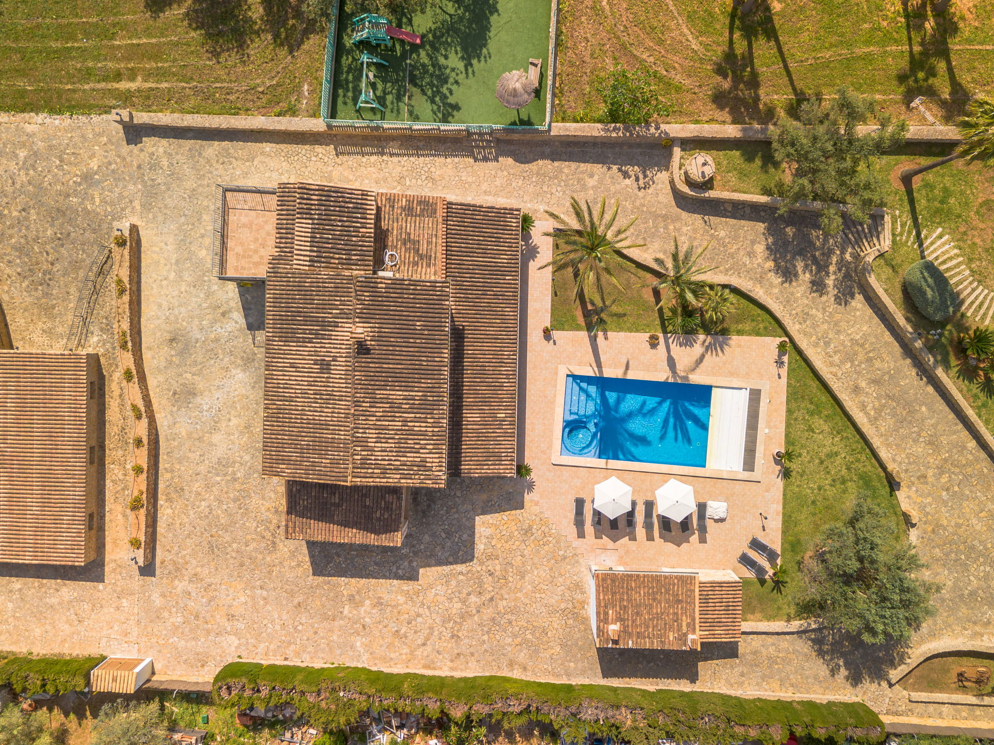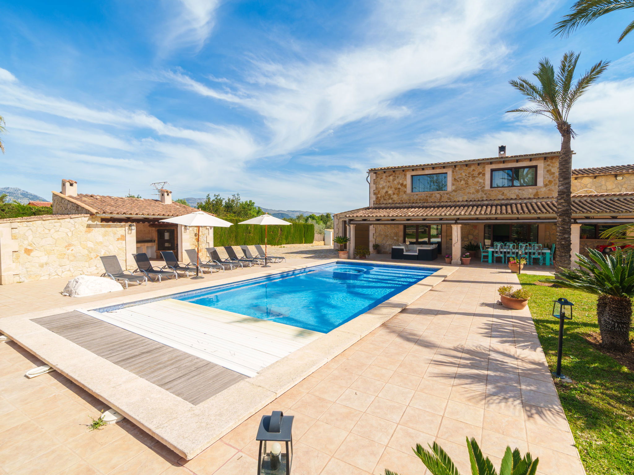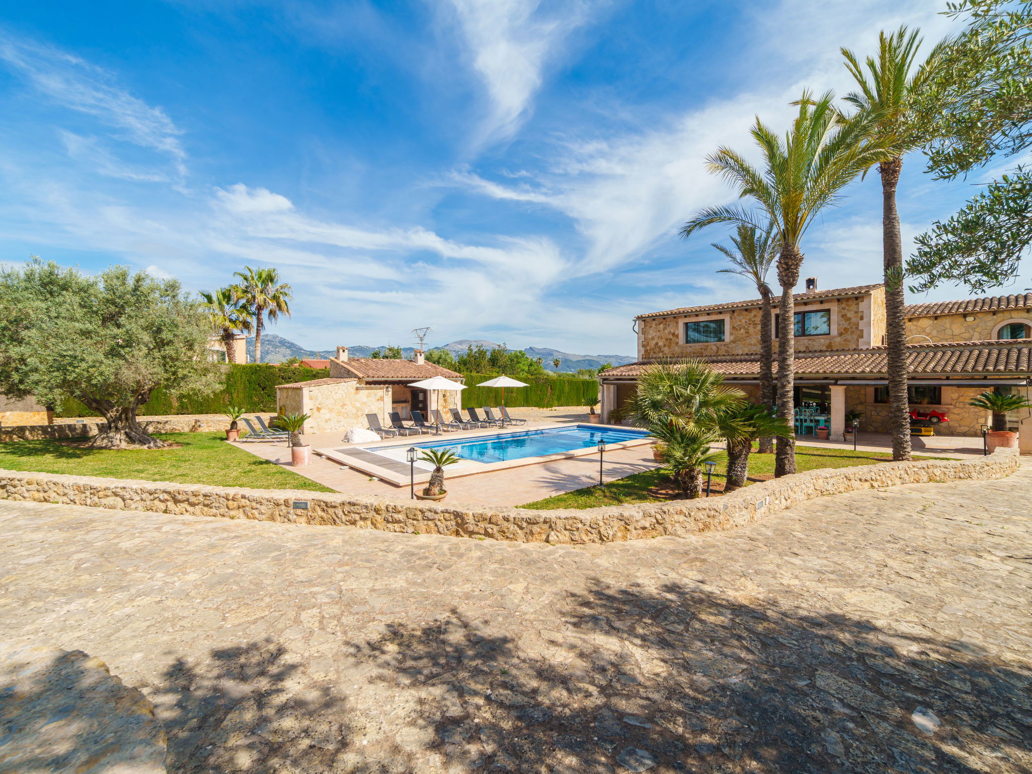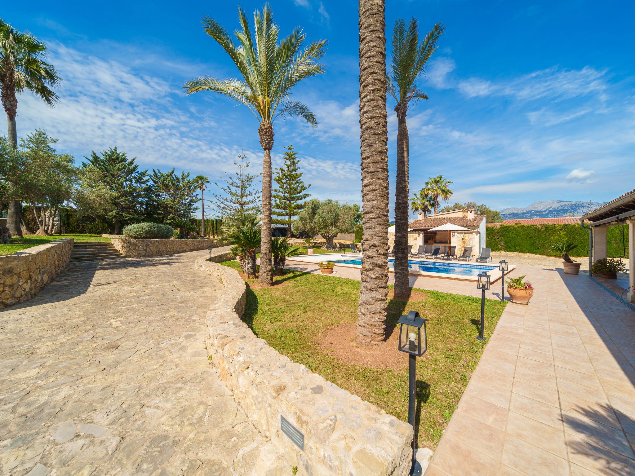 Very large, beautiful villa "Son Bosc", 2 storeys, surrounded by trees. Outside the resort, 4 km from the centre of Inca, in a quiet, sunny position residential area (villas), 2 km from the edge of the forest, 20 km from the sea, in the countryside. Private: property (fenced), garden with lawn and wildlife garden, swimming pool angular (11 x 5 m, depth 30 - 200 cm, seasonal availability: 01.Jan. - 31.Dec.). Outdoor shower, patio, arbour, pergola, garden furniture, barbecue, children's playground (slide, swing), pool maintenance by the owner/gardener. In the house: internet access, WiFi, storage room for bicycles, central heating system, air conditioning, washing machine, tumble dryer, heating available only from 01.Nov. - 31.Mar.. Parking at the house on the premises, single garage. Shop 5 km, grocery 5 km, supermarket 5 km, restaurant 3.5 km, bar 5 km, bakery 5 km, café 5 km, internet café 5 km, pedestrian zone 5 km, bicycle rental 5 km, pub garden 5 km, 60 minute walk to the centre, bus stop 5 km, railway station 5 km, sandy beach "Port Alcúdia" 23 km, rocky beach 23 km. Sports harbour 25 km, marina 25 km, golf course (18 hole) 25 km, sailing school 30 km, tennis 5 km, riding stable 8 km, sports centre 5 km, walking paths from the house 1.5 km, cycle lane 500 m. Nearby attractions: Ciudad de Inca 3.5 km, Palma de Mallorca 35 km, Mallorca Fashion Outlet & Cinemas 25 km, Pueblos:Búger-Campanet-Selva-Caimari. Playa y Faro de Formentor 35 km, Santuario de Lluc 22 km. Hiking paths: Puig de Santa Magdalena - Inca 3.6 km, Serra de Tramuntana. Please note: car recommended. Suitable for families. Object suitable for 9 adults. The owner does not accept any youth groups. Animals in the neighbourhood. Motorway 400 m from the property. Airfield 39.6 km from the property.