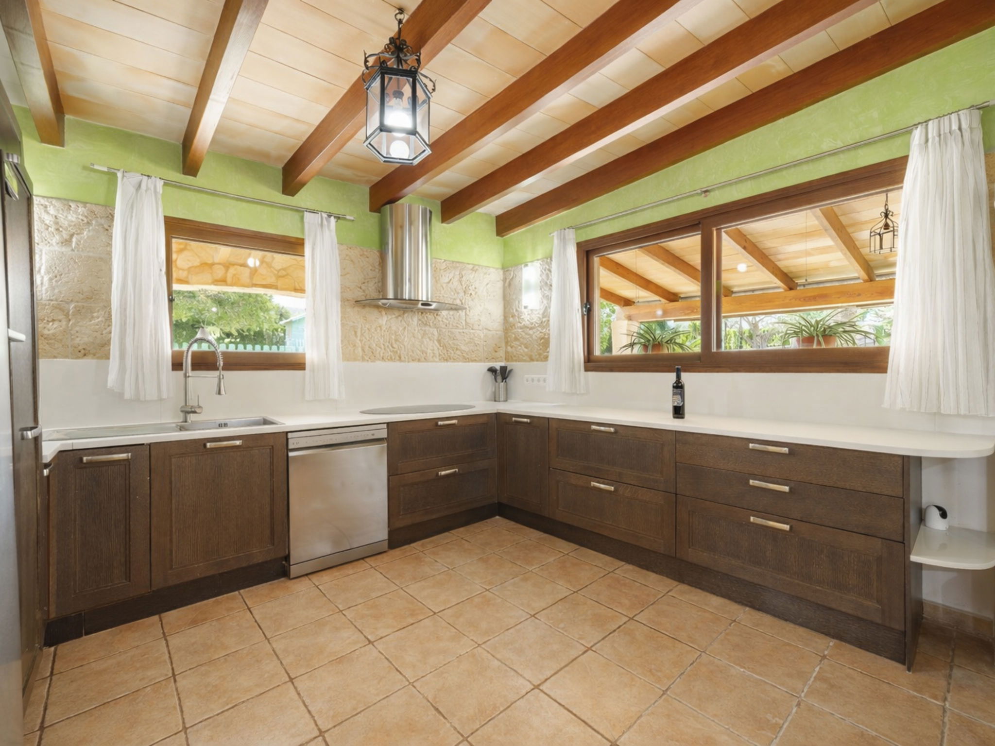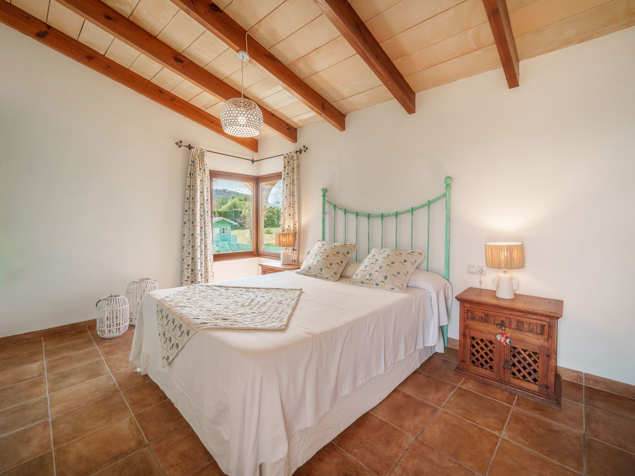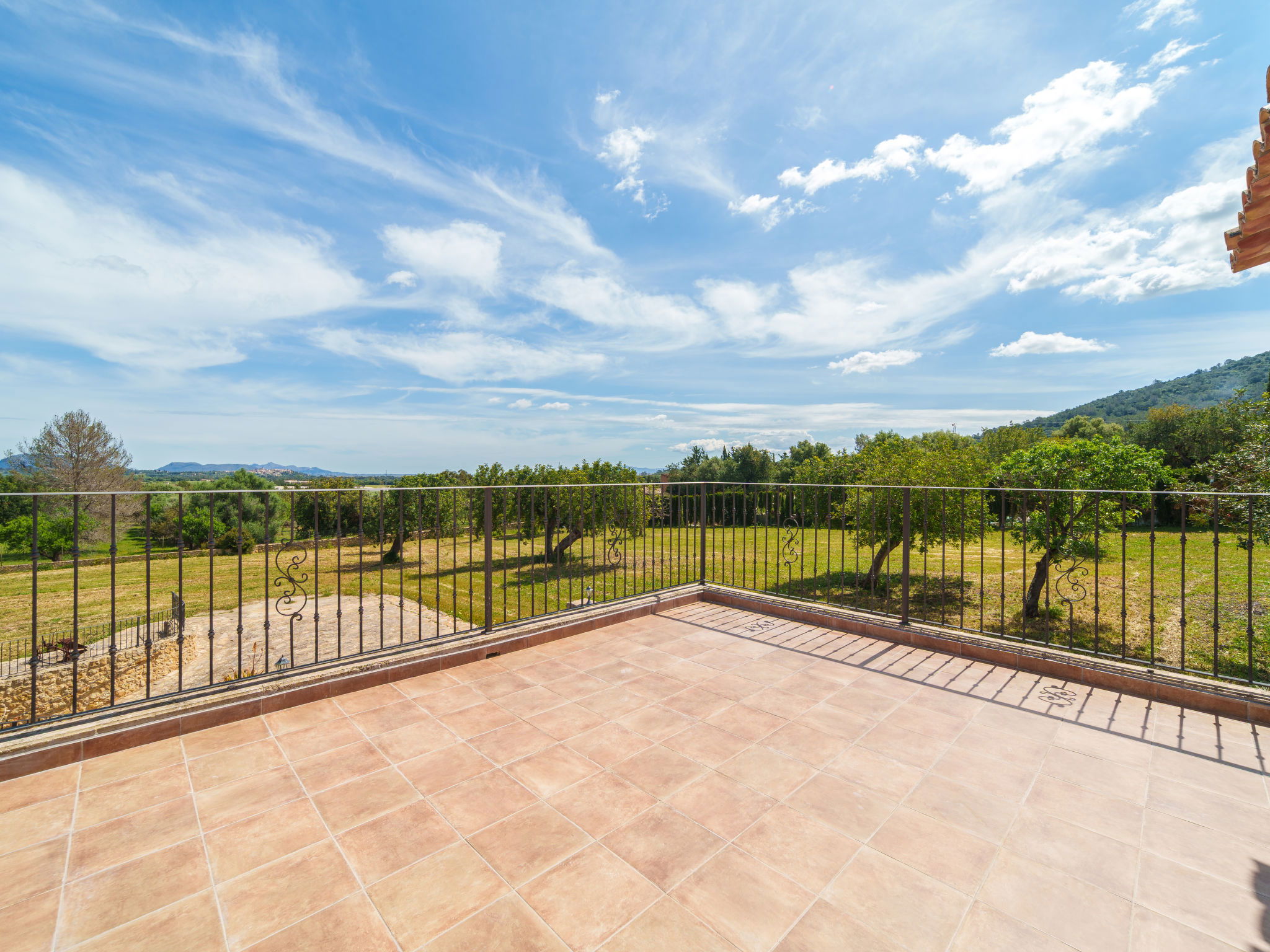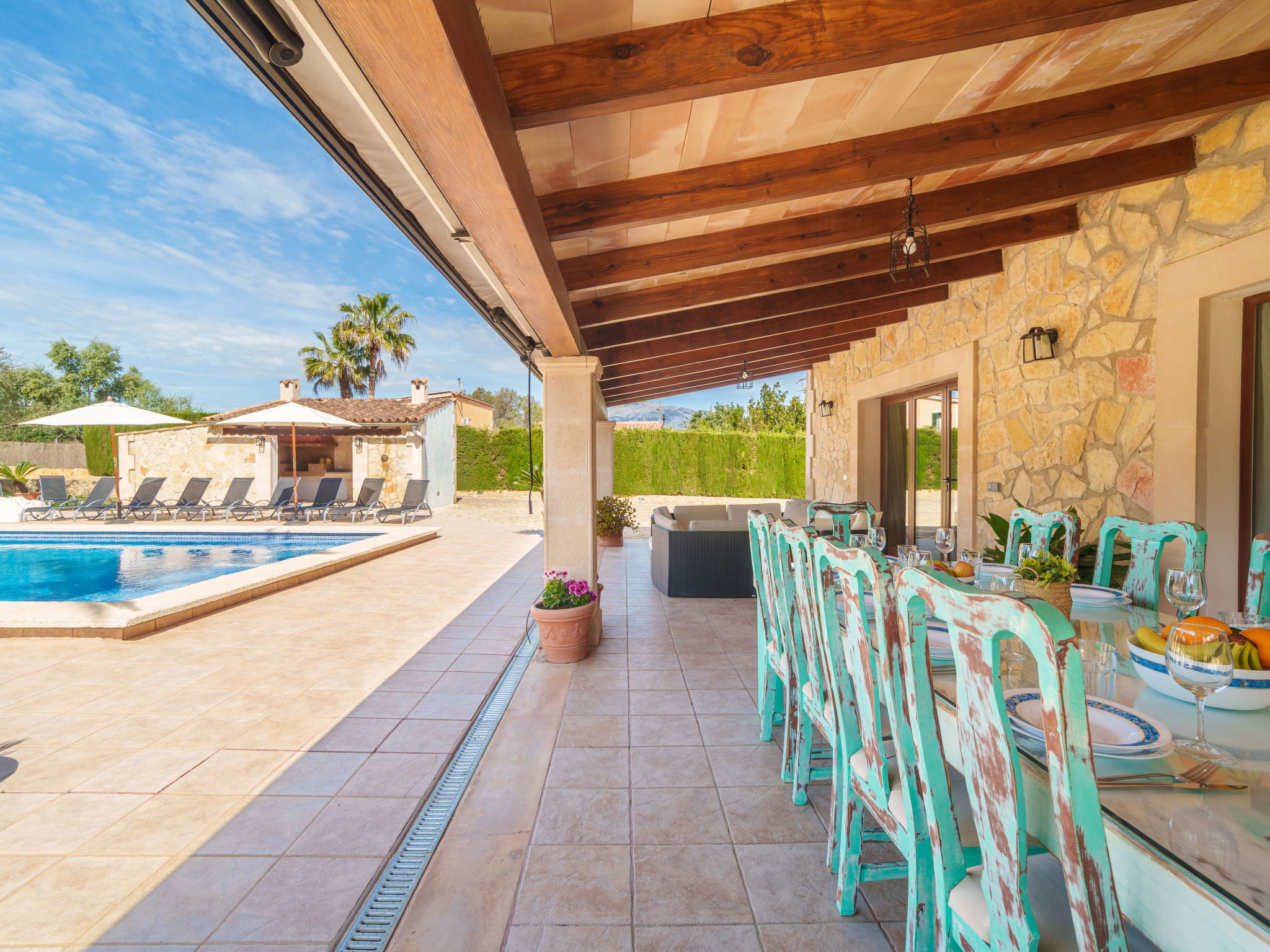 Very large, beautiful villa "Son Bosc", 2 storeys, surrounded by trees. Outside the resort, 4 km from the centre of Inca, in a quiet, sunny position residential area (villas), 2 km from the edge of the forest, 20 km from the sea, in the countryside. Private: property (fenced), garden with lawn and wildlife garden, swimming pool angular (11 x 5 m, depth 30 - 200 cm, seasonal availability: 01.Jan. - 31.Dec.). Outdoor shower, patio, arbour, pergola, garden furniture, barbecue, children's playground (slide, swing), pool maintenance by the owner/gardener. In the house: internet access, WiFi, storage room for bicycles, central heating system, air conditioning, washing machine, tumble dryer, heating available only from 01.Nov. - 31.Mar.. Parking at the house on the premises, single garage. Shop 5 km, grocery 5 km, supermarket 5 km, restaurant 3.5 km, bar 5 km, bakery 5 km, café 5 km, internet café 5 km, pedestrian zone 5 km, bicycle rental 5 km, pub garden 5 km, 60 minute walk to the centre, bus stop 5 km, railway station 5 km, sandy beach "Port Alcúdia" 23 km, rocky beach 23 km. Sports harbour 25 km, marina 25 km, golf course (18 hole) 25 km, sailing school 30 km, tennis 5 km, riding stable 8 km, sports centre 5 km, walking paths from the house 1.5 km, cycle lane 500 m. Nearby attractions: Ciudad de Inca 3.5 km, Palma de Mallorca 35 km, Mallorca Fashion Outlet & Cinemas 25 km, Pueblos:Búger-Campanet-Selva-Caimari. Playa y Faro de Formentor 35 km, Santuario de Lluc 22 km. Hiking paths: Puig de Santa Magdalena - Inca 3.6 km, Serra de Tramuntana. Please note: car recommended. Suitable for families. Object suitable for 9 adults. The owner does not accept any youth groups. Animals in the neighbourhood. Motorway 400 m from the property. Airfield 39.6 km from the property.