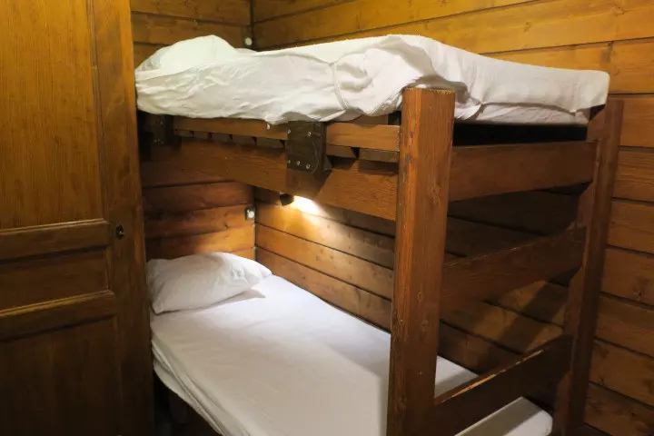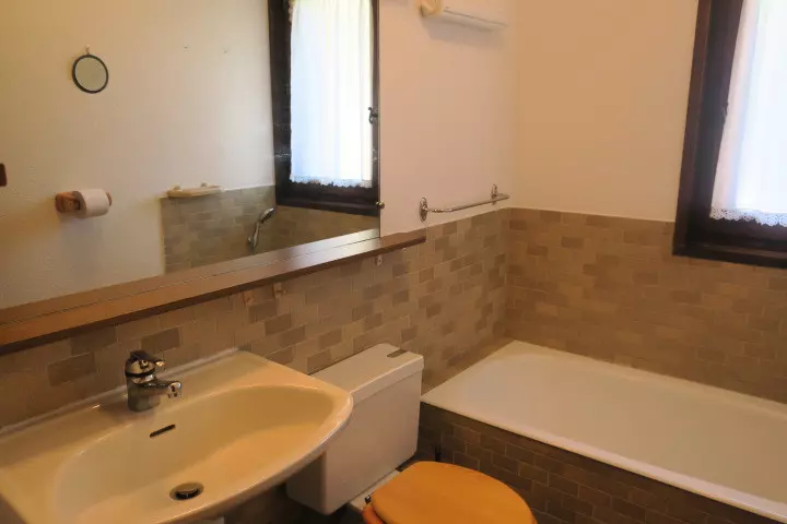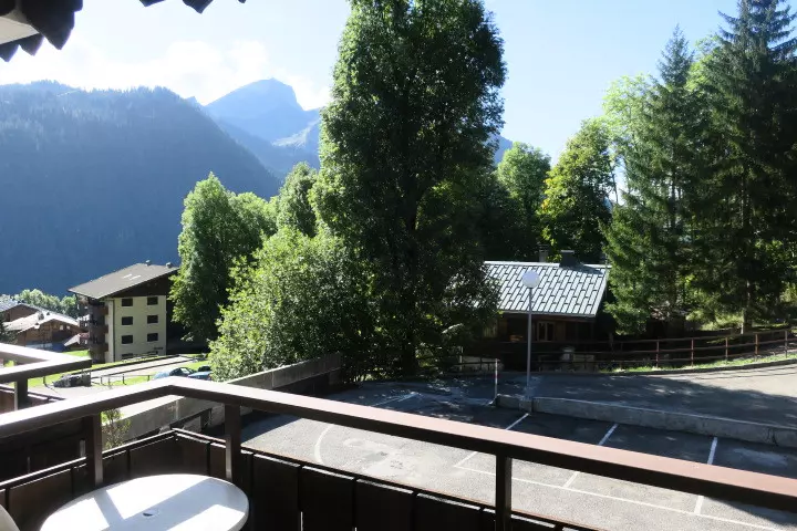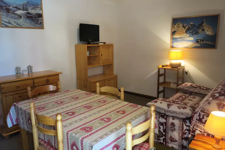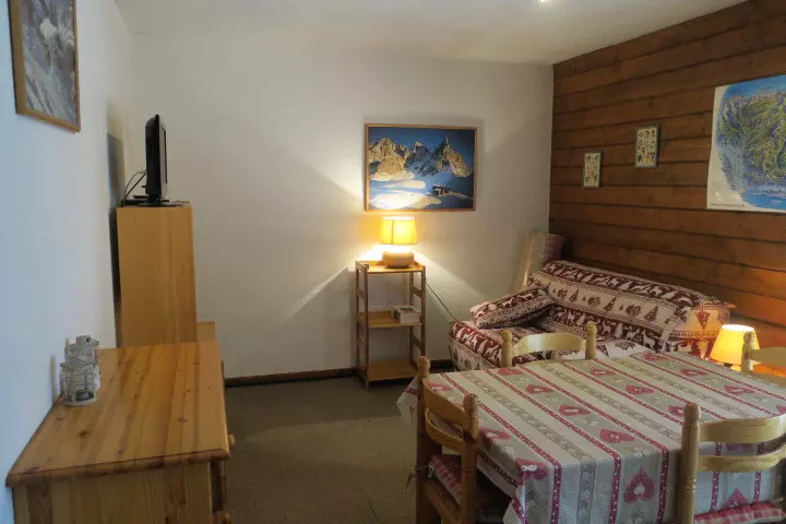 At the entrance, a mountain corner with 2 bunk beds, a bathroom with WC, a kitchen, a living room with a convertible sofa, and a west-facing balcony.