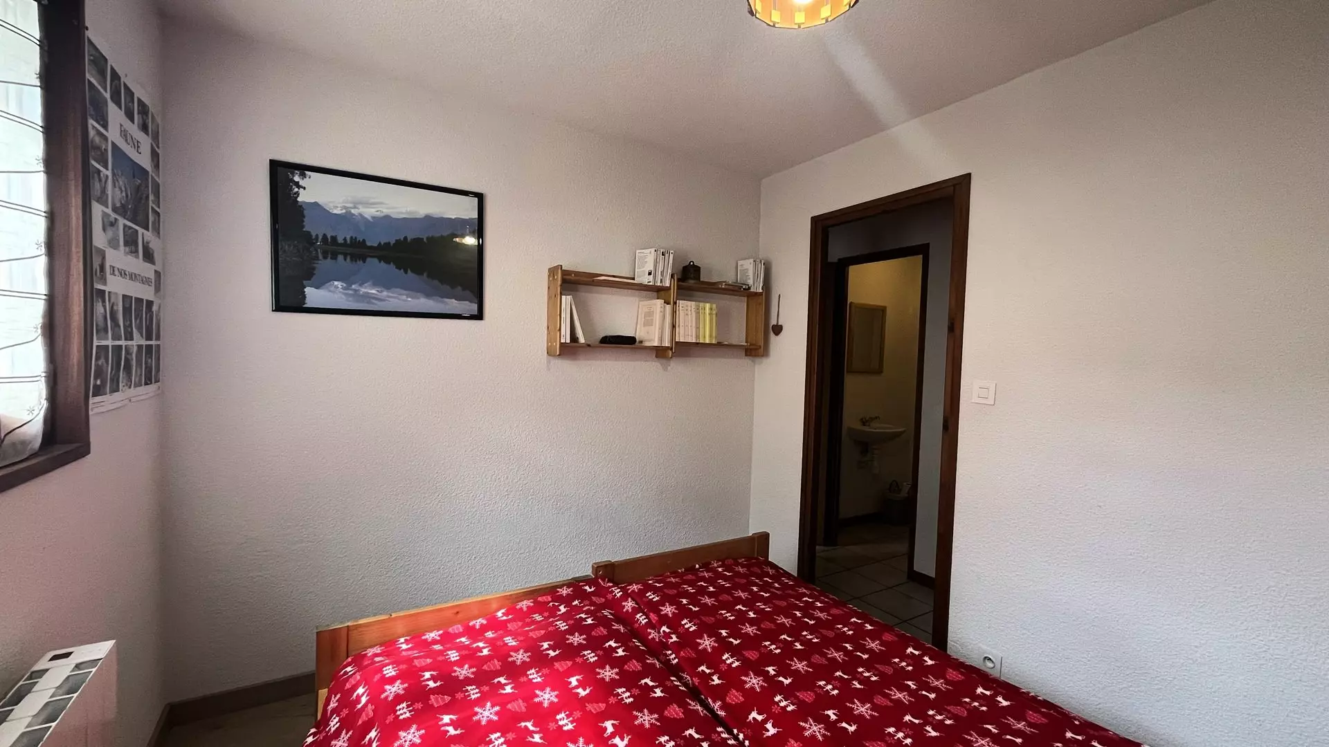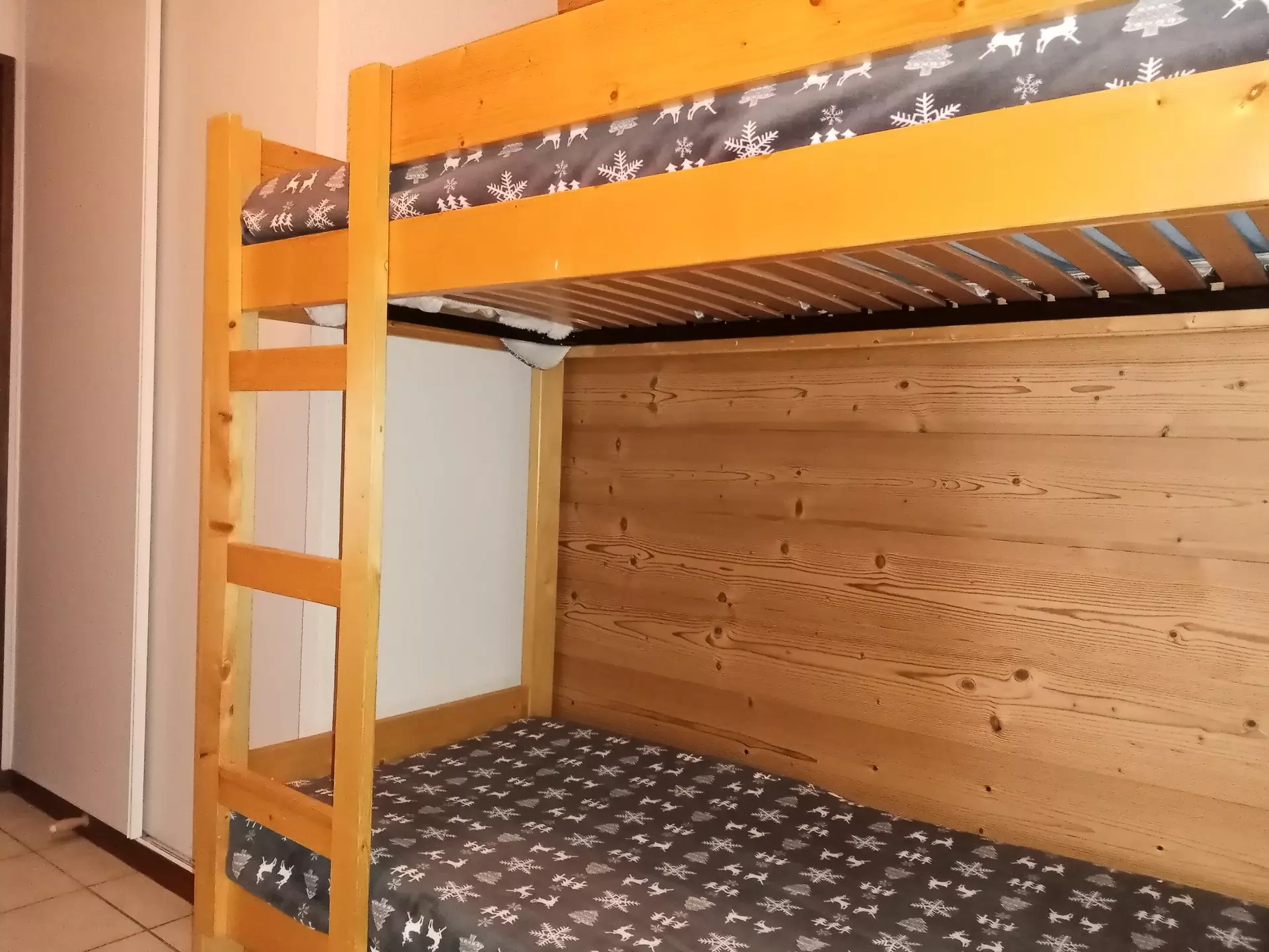 At the entrance, a mountain corner with 2 bunk beds, a bedroom with 2 bunk beds, a second bedroom with a double bed, a bathroom, a separate toilet, a living room, a kitchen, and a south-west facing balcony of 10m² offering a beautiful view of the village and the mountains.