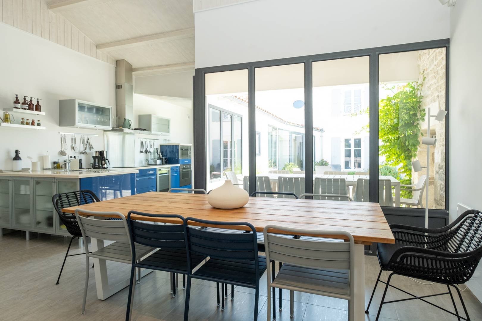 Dining table for 8 guests in the living area with large bay windows leading directly to the poolside terrace – perfect for relaxed summer evenings