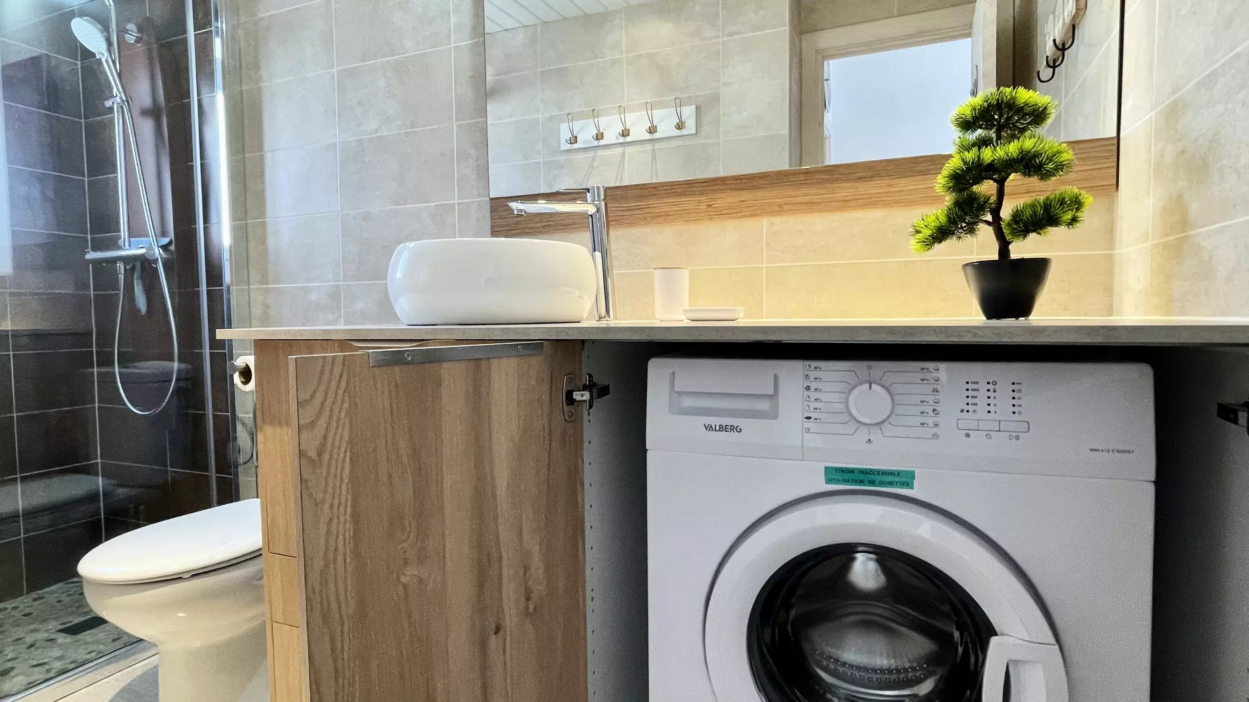 The apartment features two bedrooms, each equipped with a double bed, a king-size bed, and a sofa bed, ensuring a comfortable night's sleep for all guests. It includes a full bathroom with a shower, ideal for families looking for convenience.
