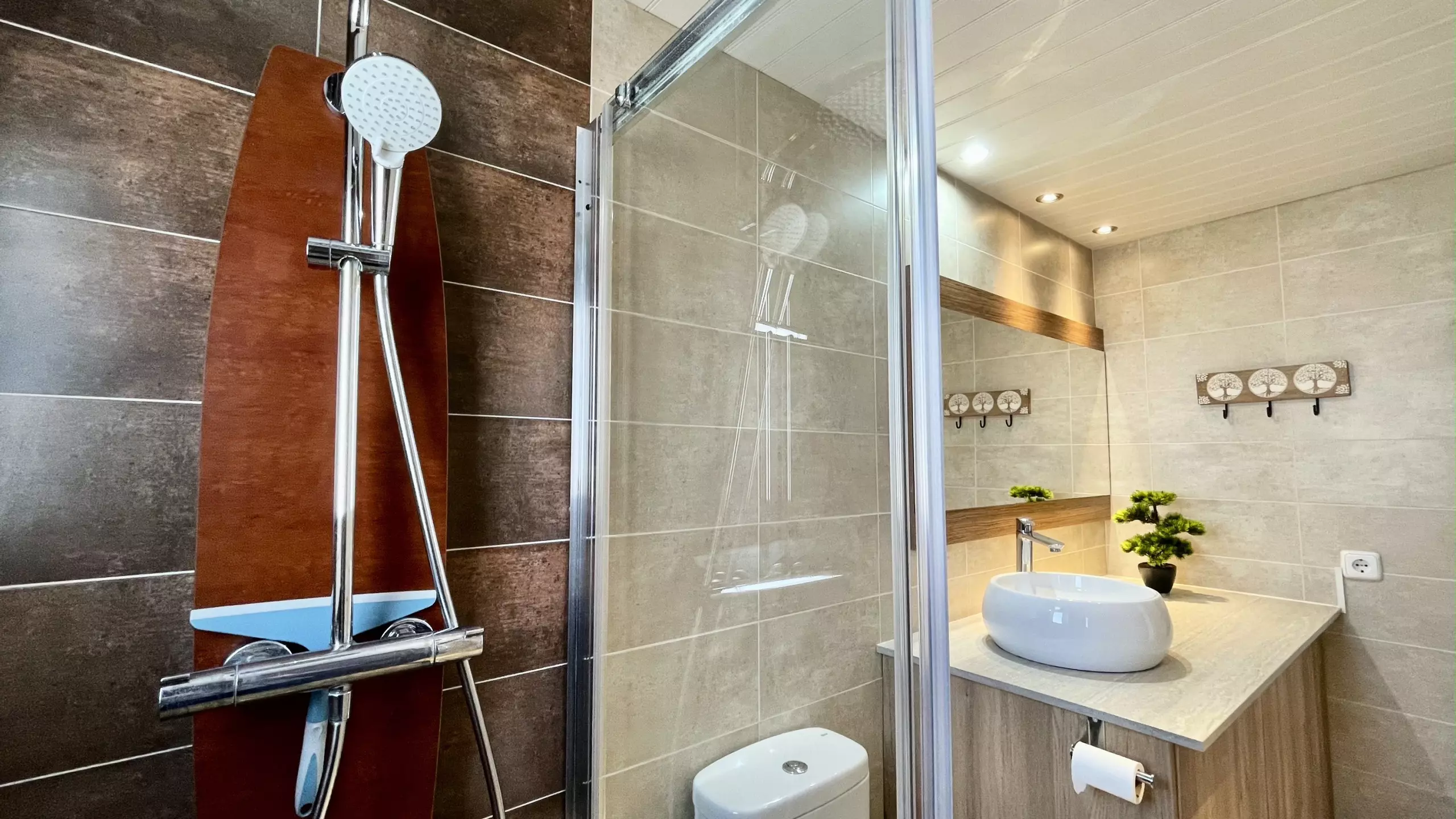 It features air conditioning and a heat pump to maintain a comfortable temperature throughout the year. Wi-Fi and a TV with channels in several languages complete the home's entertainment.