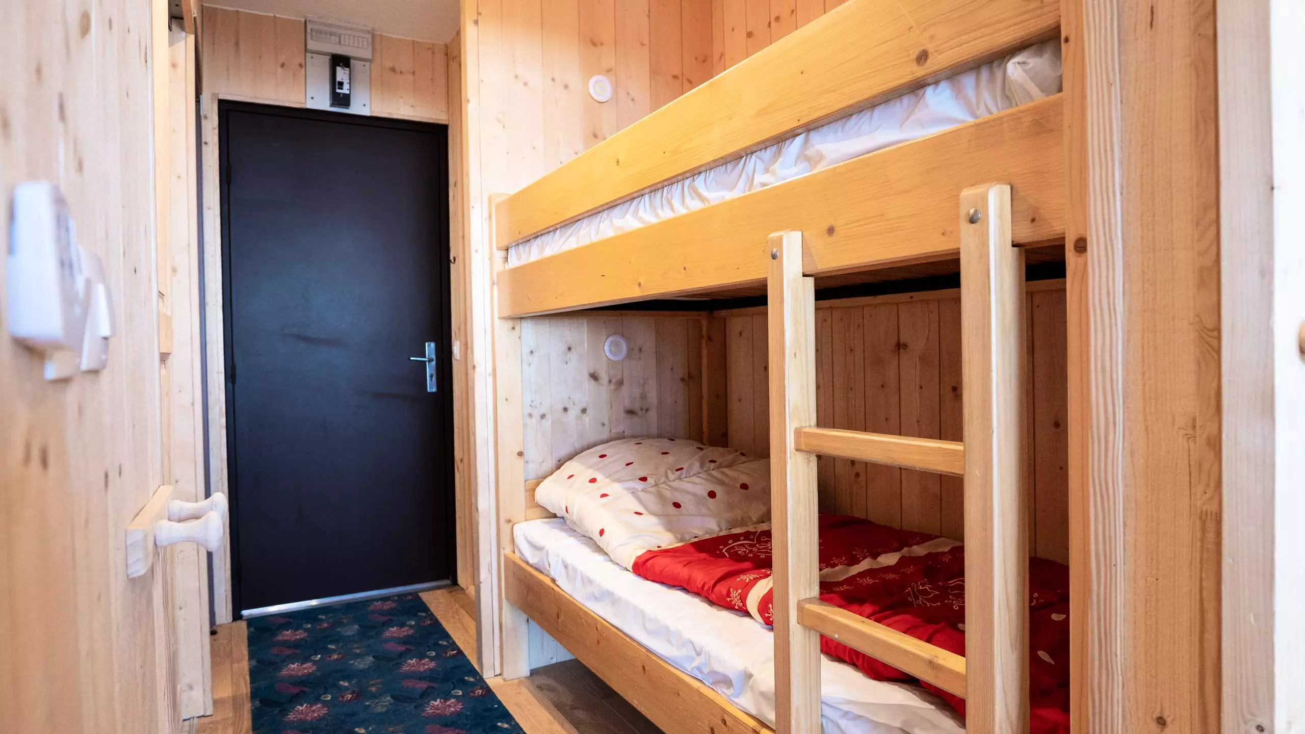- A mountain corner with bunk beds equipped with quilts and square pillows.