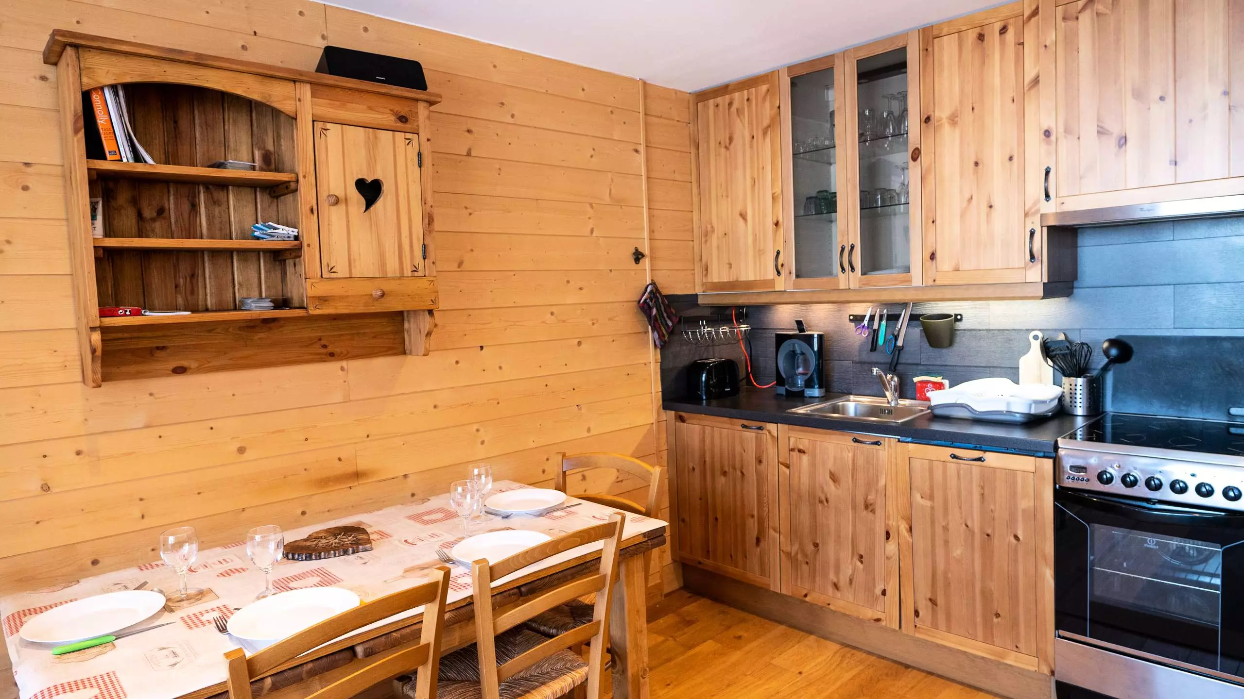 - A fully equipped open kitchen for 4 people with ceramic hob, dishwasher, oven, microwave, refrigerator, Dolce & Gusto coffee maker, kettle and toaster.