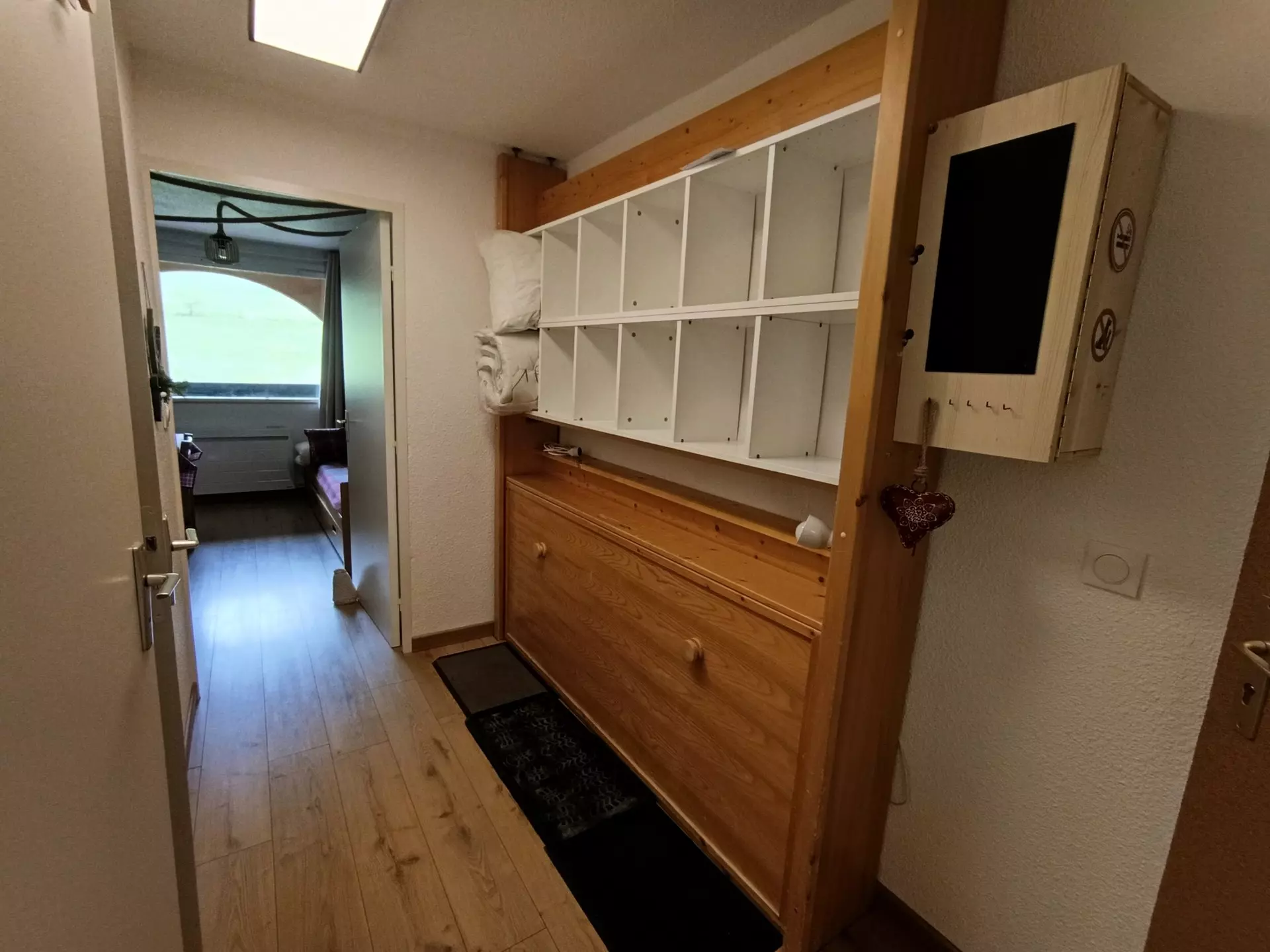 Entrance: Large entrance leading to the rooms, clothes hooks, storage shelves, single fold-down bed.