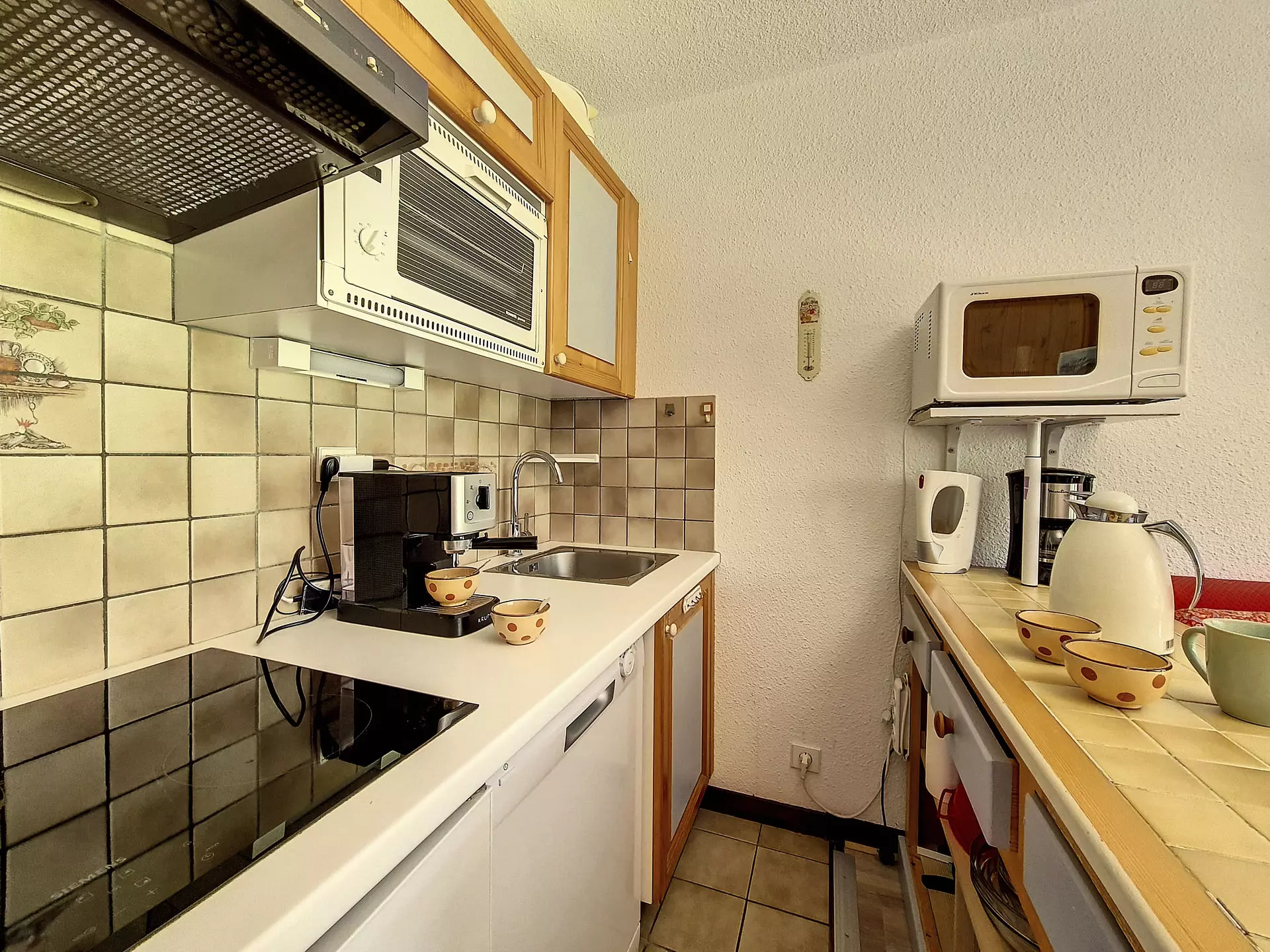 Kitchen with 4 ceramic hobs, fridge, oven, microwave, dishwasher, kettle, toaster and electric and espresso coffee maker