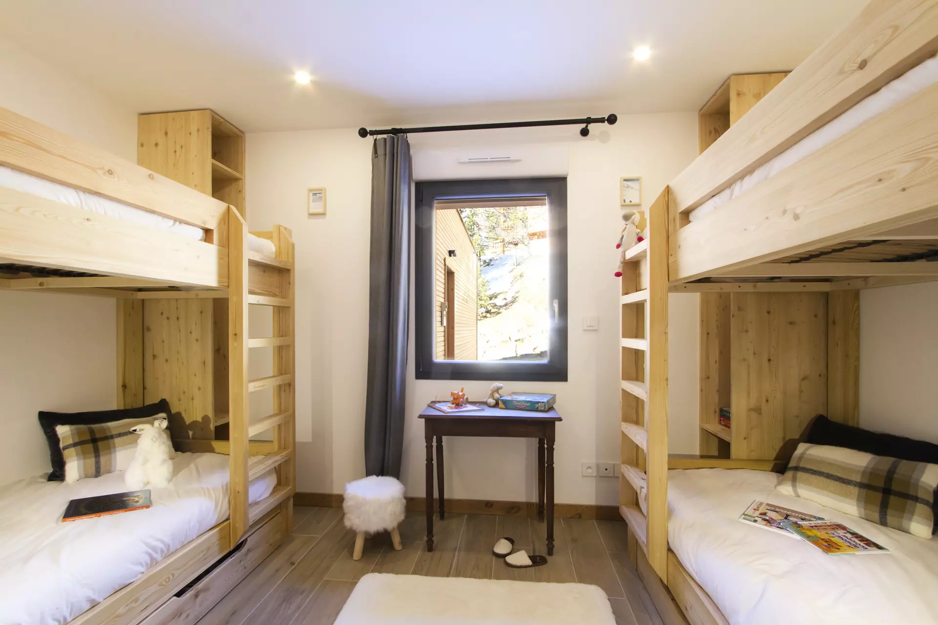 A bedroom with 2x2 bunk beds.
