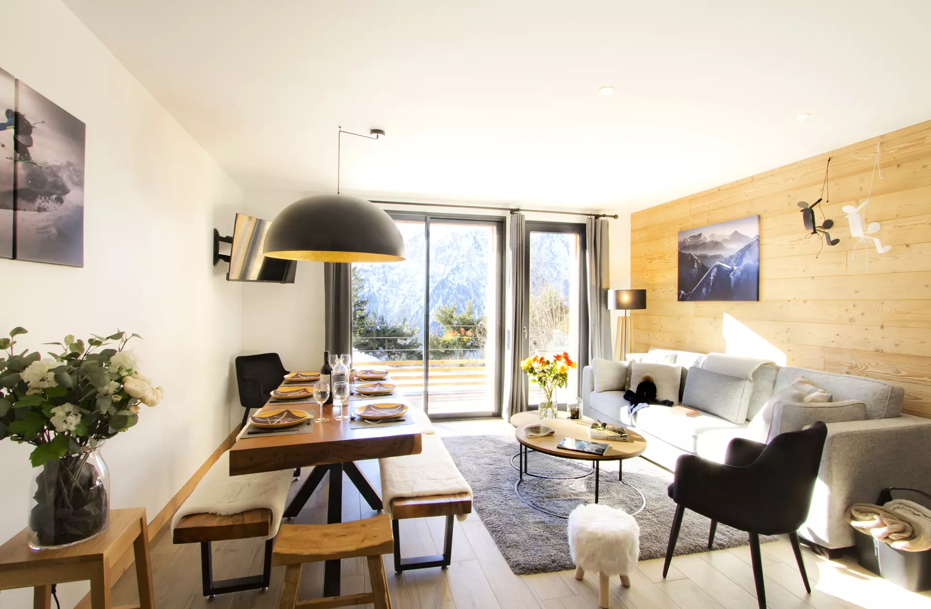 A beautiful 30m² living room comprising a living room with TV, a dining room and a kitchen area equipped with oven, microwave and dishwasher.