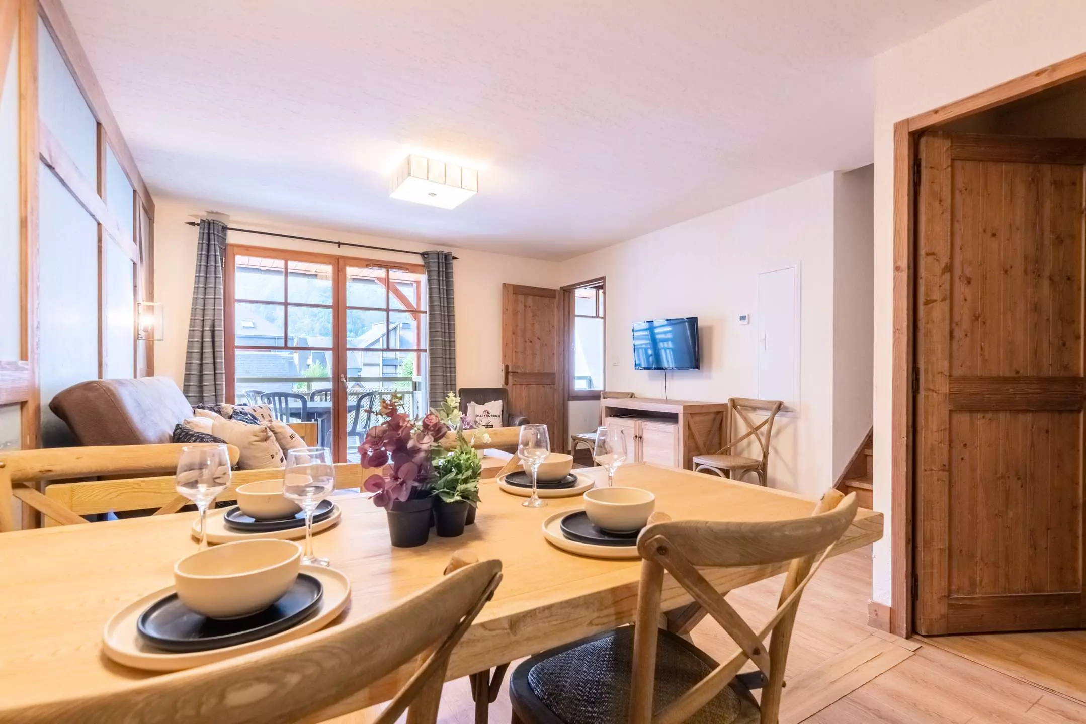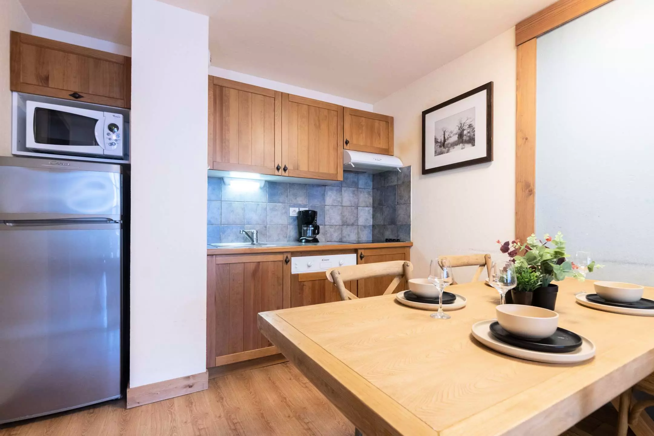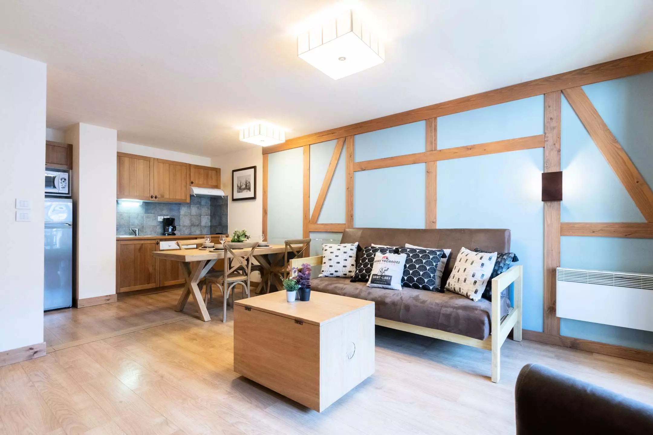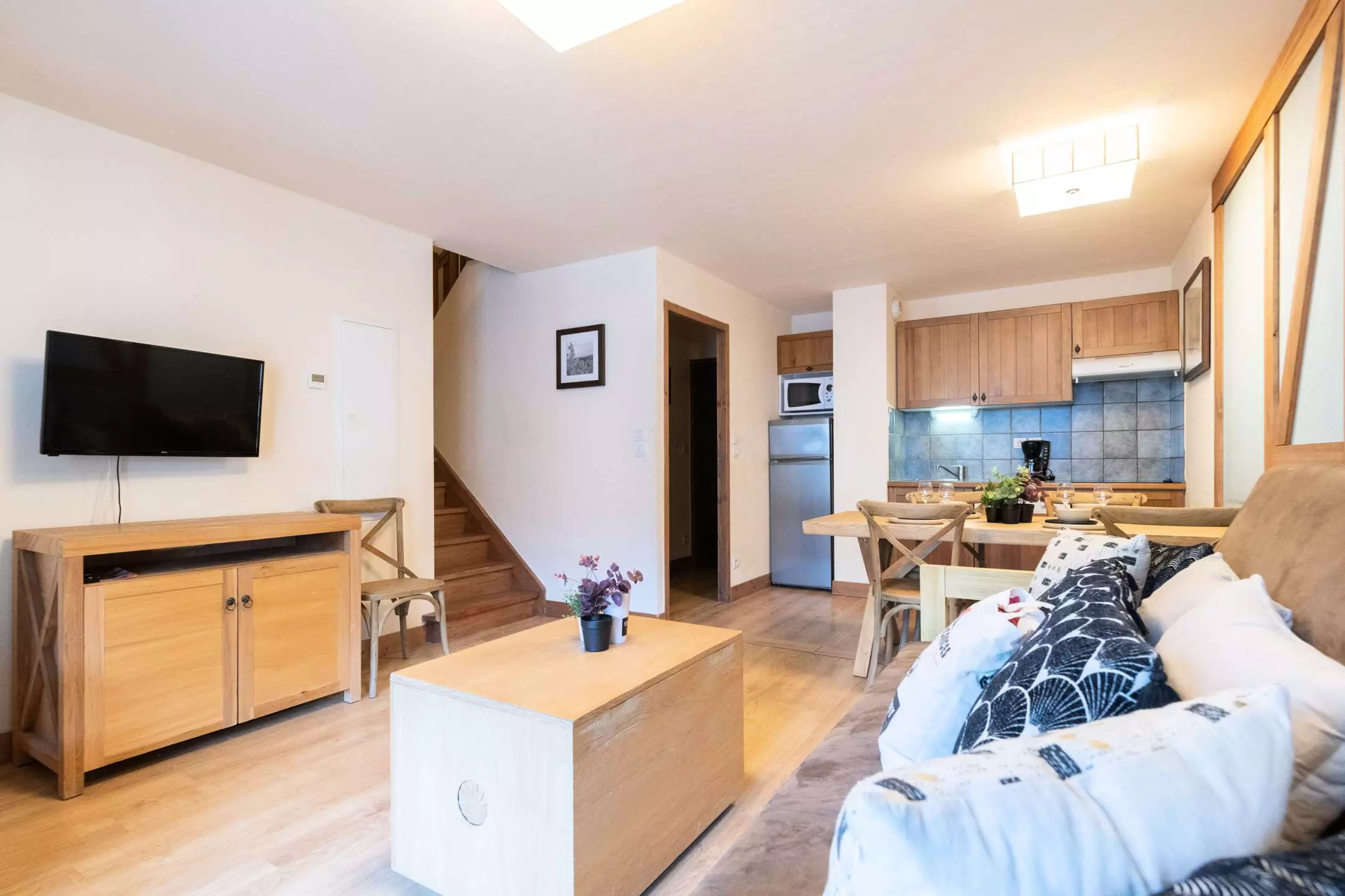 -A living room with 1 double sofa bed and TV, opening onto a fitted kitchen (ceramic hob, microwave, dishwasher)