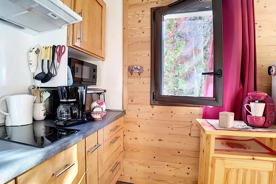 Kitchen equipped with 2 ceramic hobs, refrigerator, dishwasher, electric oven, microwave, crepe maker, raclette machine, fondue set, kettle, classic coffee maker, Tassimo coffee maker and toaster.
