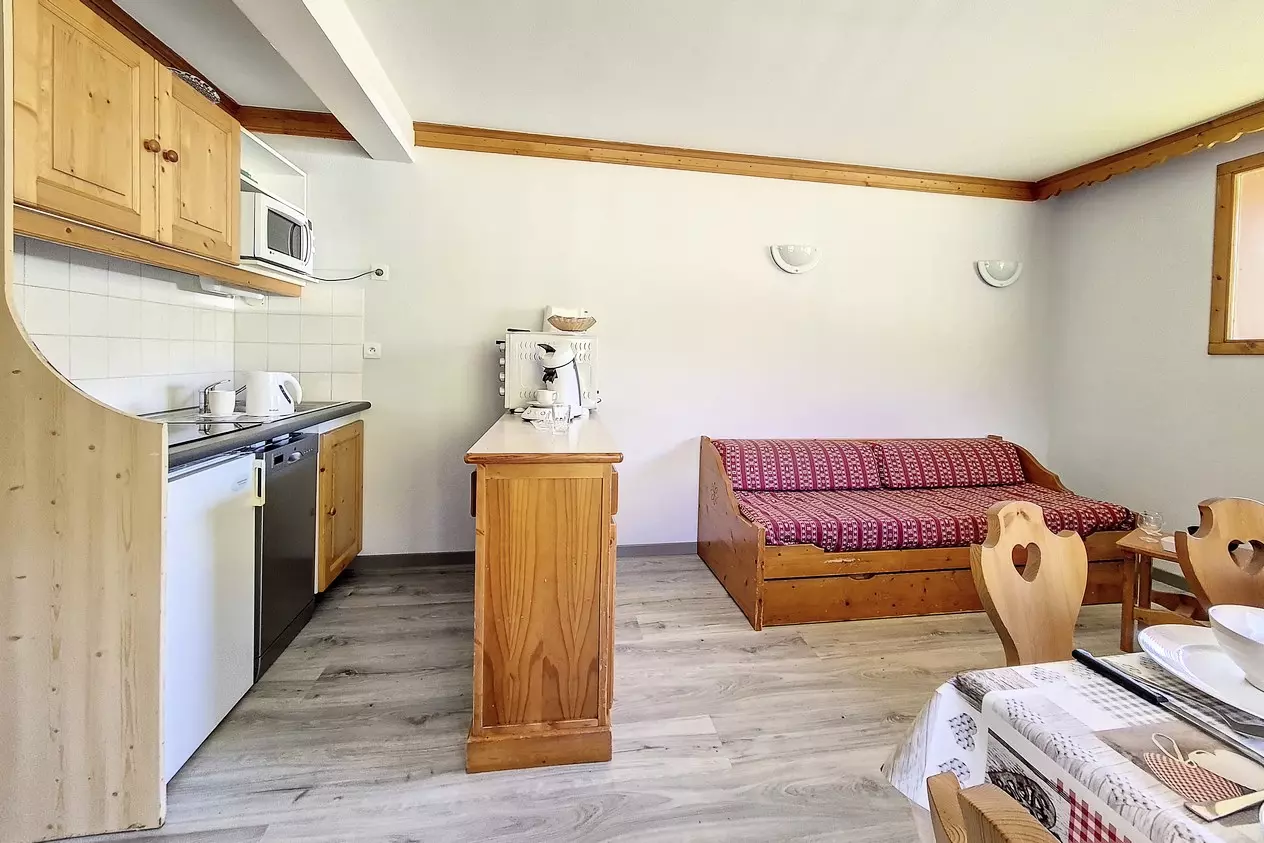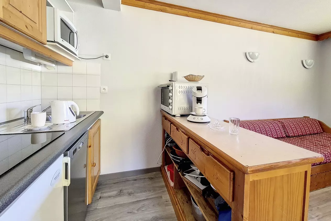 Kitchen equipped with 4 induction hobs, mini-oven, microwave, refrigerator, dishwasher, kettle, coffee maker and toaster.