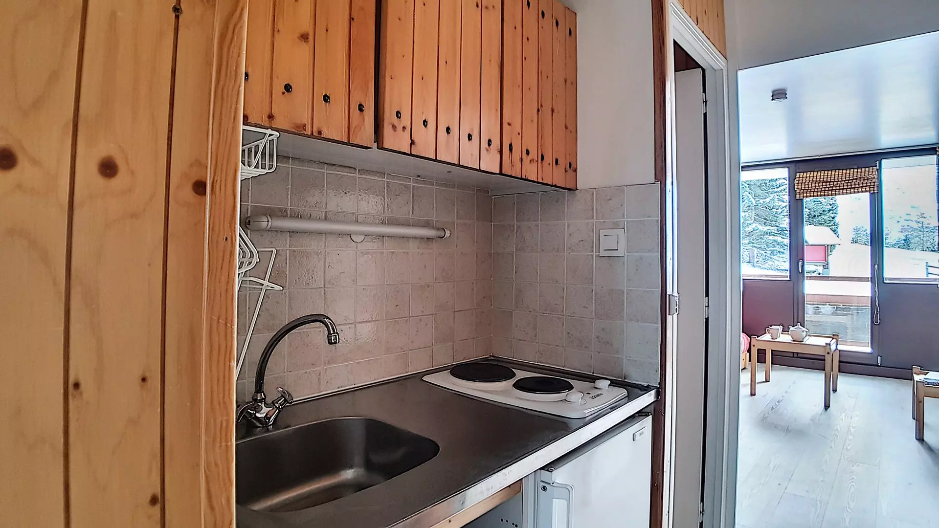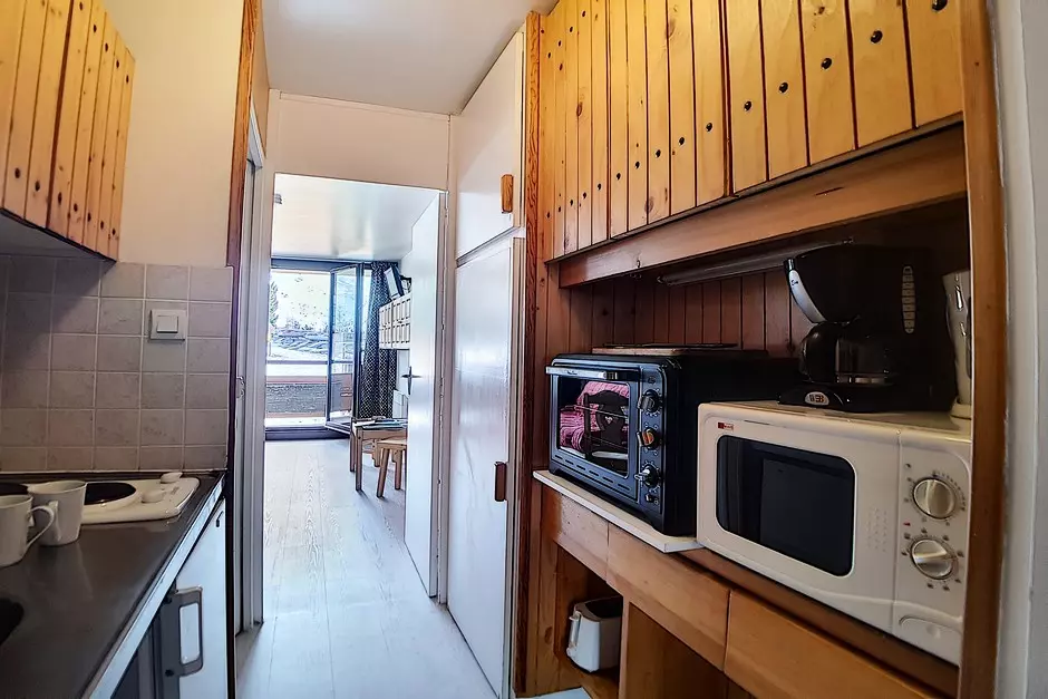 Kitchen equipped with 2 hotplates, a refrigerator, a mini-oven, a microwave, and a dishwasher, kettle, toaster and coffee maker.
