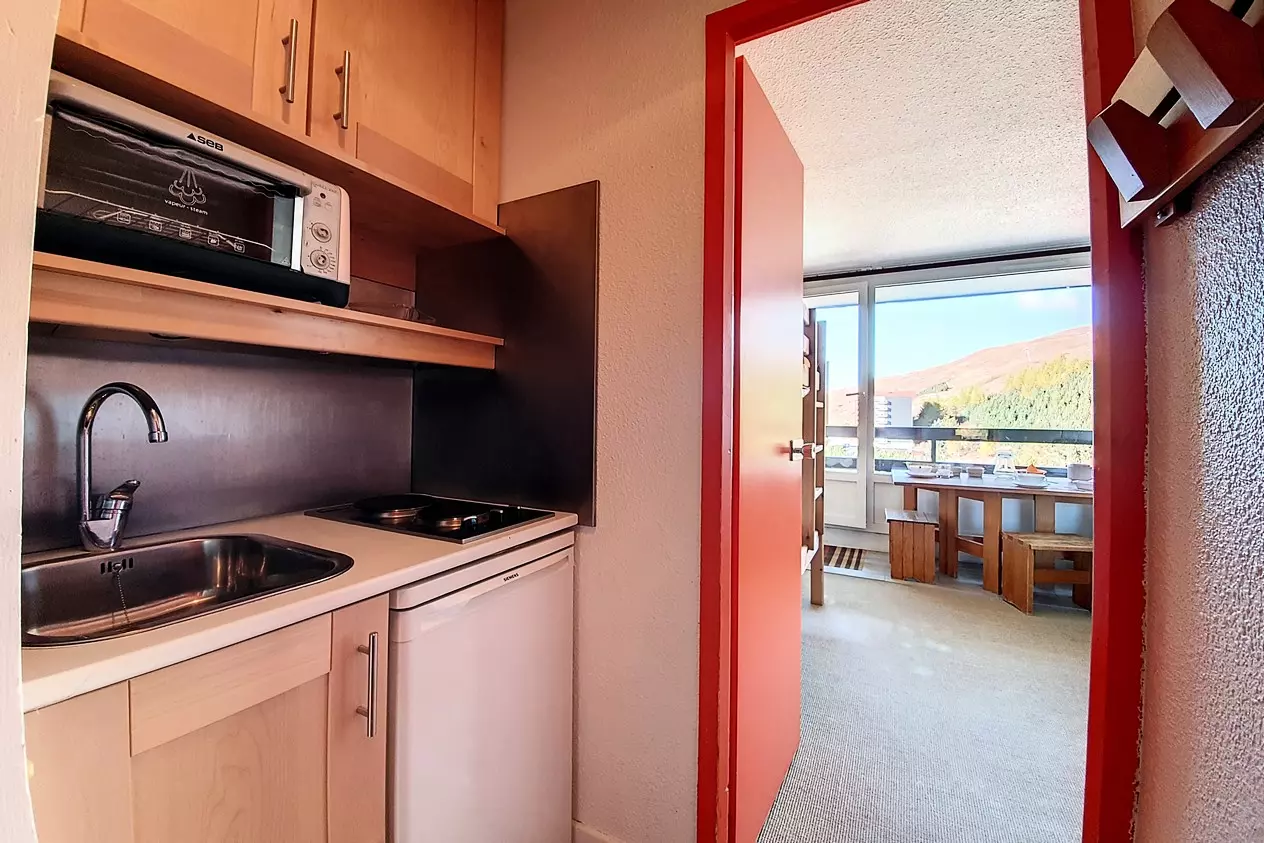 Built-in kitchen with 2 hotplates, refrigerator, mini oven, coffee maker.