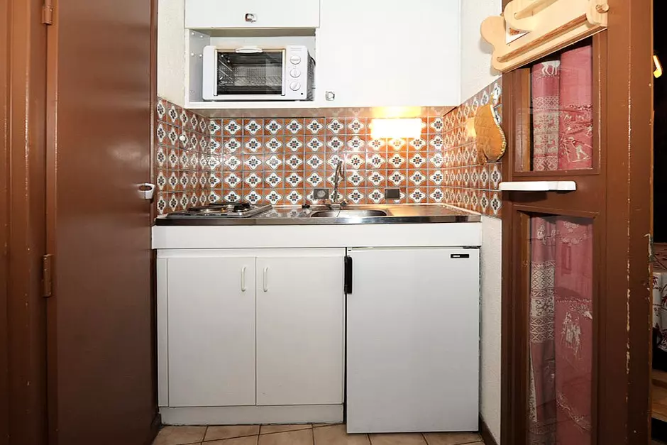 Kitchen equipped with 2 electric hotplates, mini-oven, refrigerator, coffee maker and kettle.