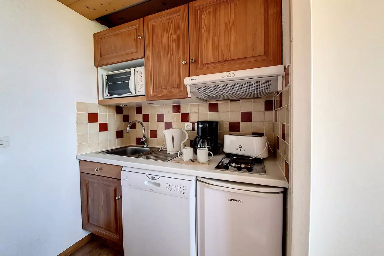 Built-in kitchen with 2 hotplates, oven, refrigerator, dishwasher, kettle, toaster and coffee maker.