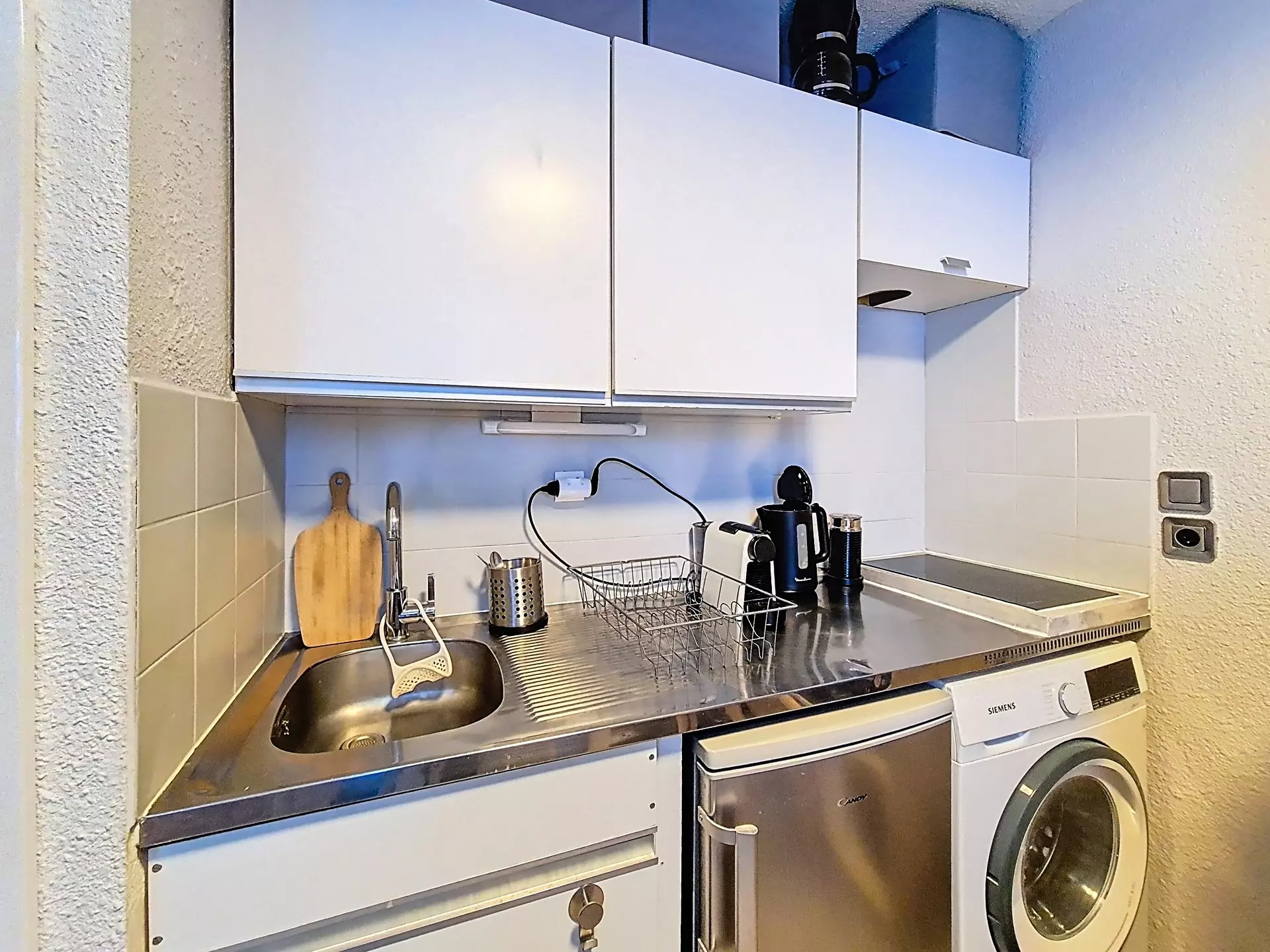 Kitchen equipped with 2 hotplates, refrigerator, microwave, oven, coffee maker, kettle and washing machine.
