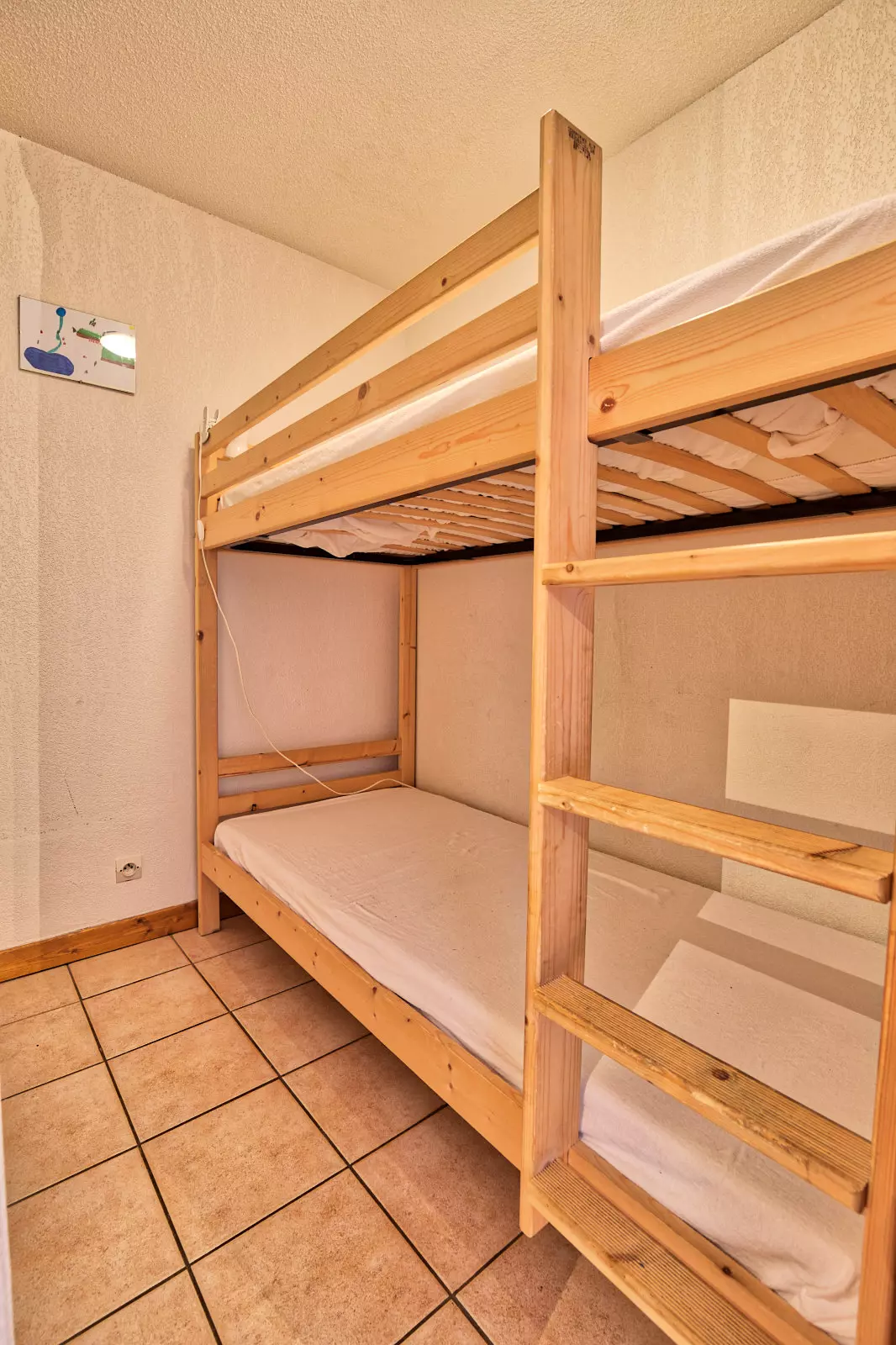 - Sleeping arrangements: one double bedroom (140cm bed), mountain corner with two bunk beds (2x90cm), living room with 1 double sofa bed (140cm). Bedding equipped with duvets.