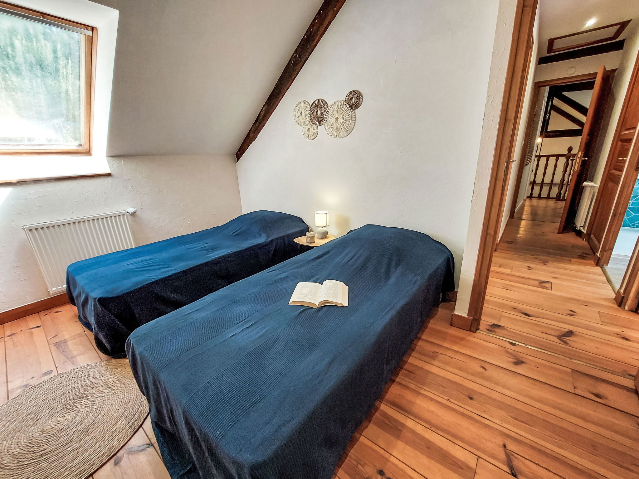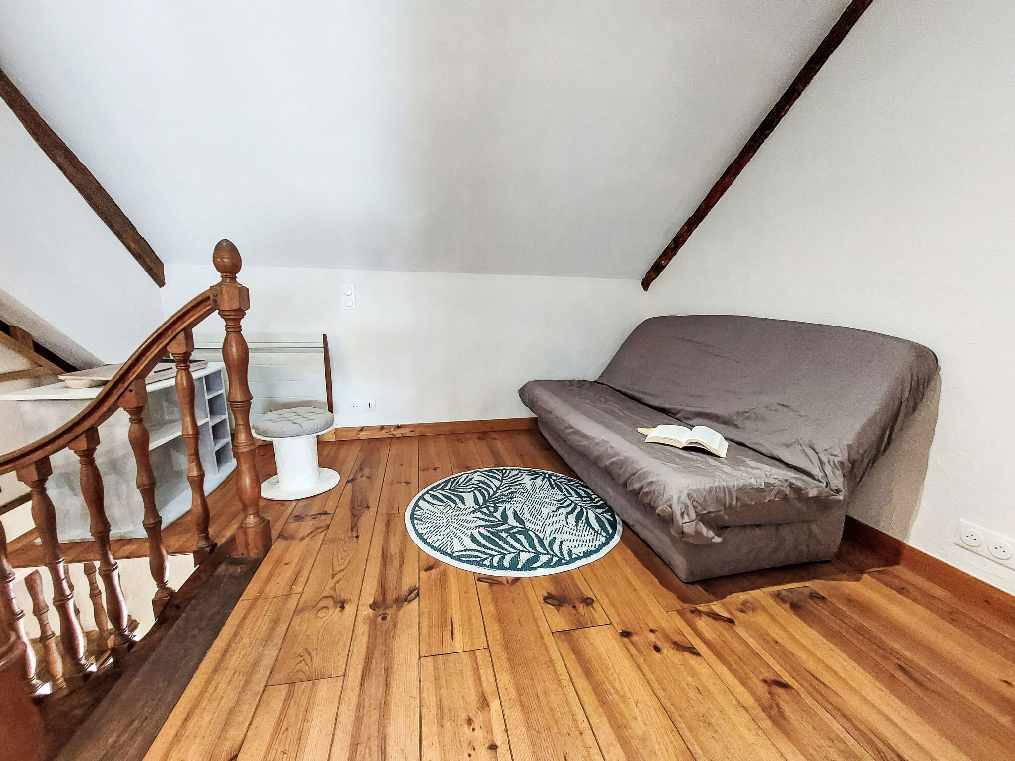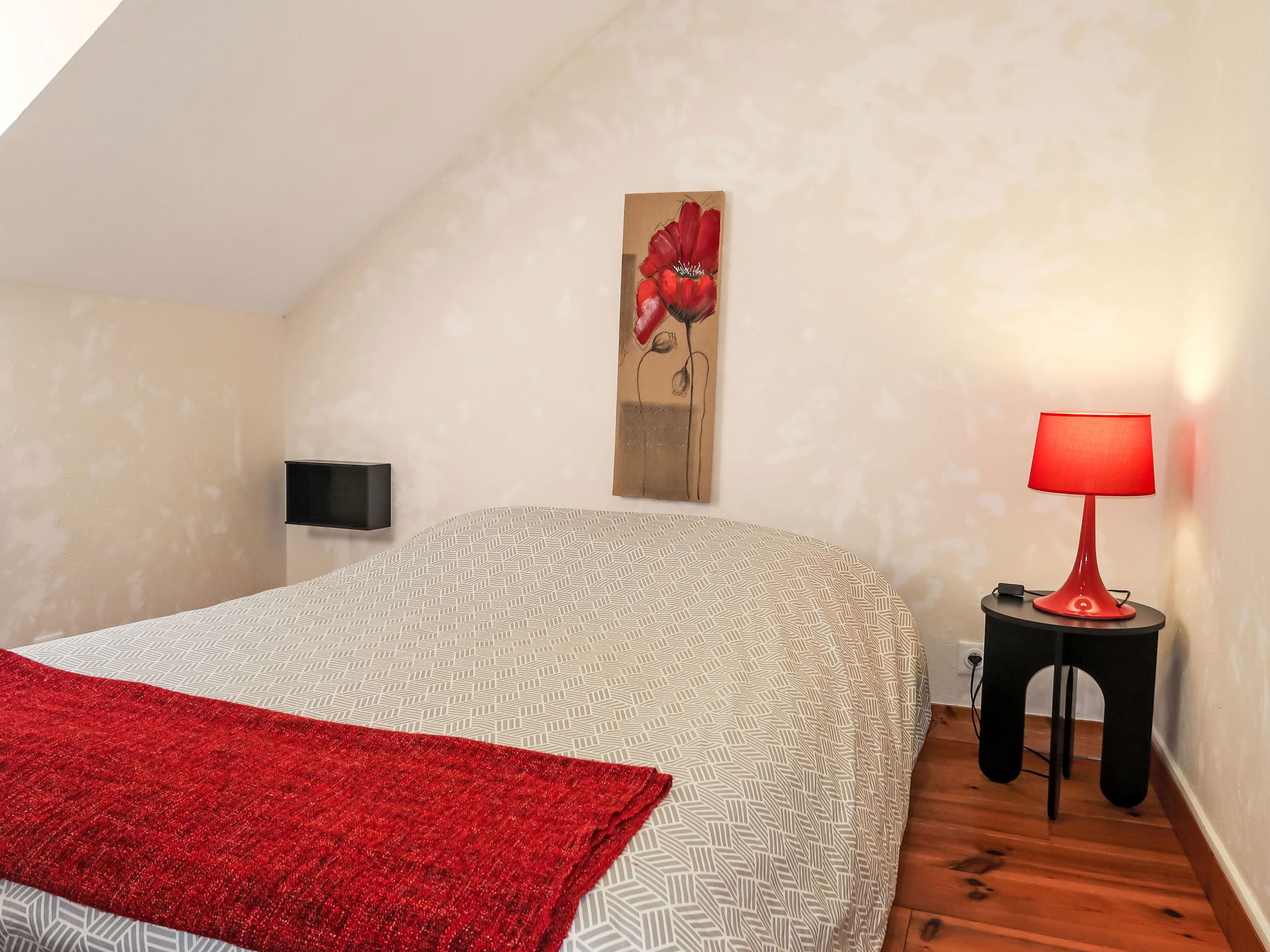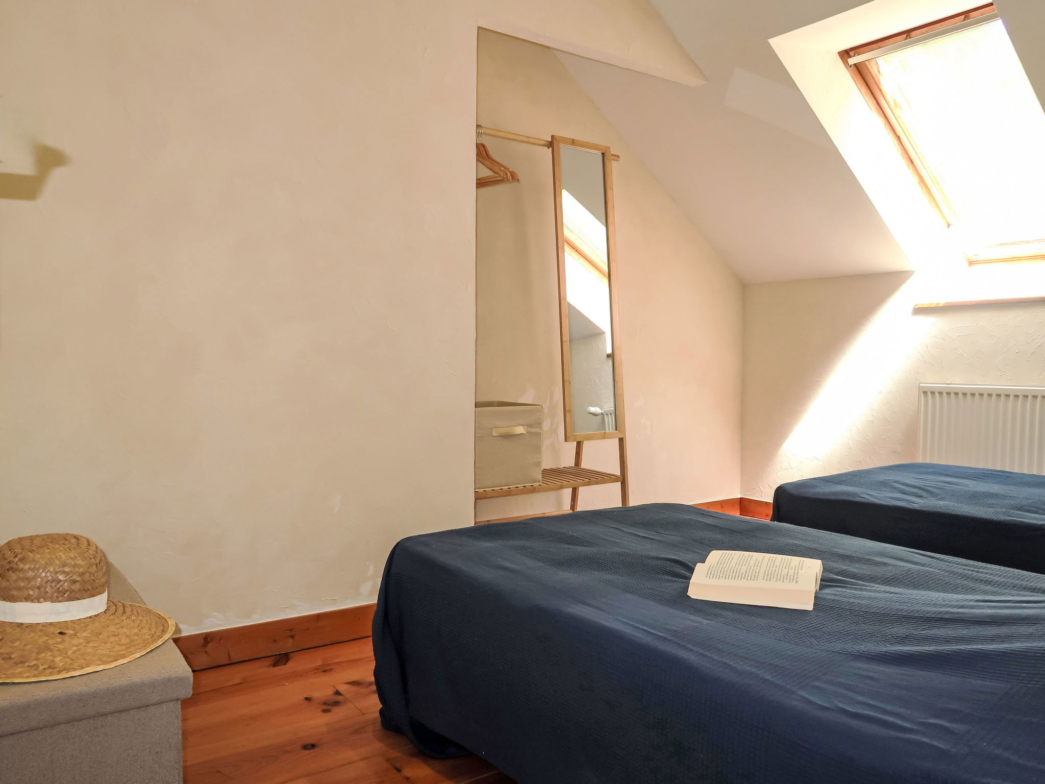 "La Meunière", 5-room terraced house 120 m2 on 2 levels. Cosy furnishings: entrance hall. Large living/dining room with open-hearth fireplace and TV (flat screen). Exit to the terrace. Open kitchen (oven, dishwasher, 3 induction hot plates, toaster, kettle, microwave, freezer, electric coffee machine) with bar. Sep. WC. Upper floor: with sloping ceilings, 3 rooms, each room with 1 french bed (140 cm, length 190 cm). 1 room with 2 beds (90 cm, length 190 cm). Shower/WC. Electric heating. Terrace furniture, barbecue, deck chairs (3). Facilities: Internet (WiFi, free). Please note: not suitable for small children. Non-smoking house. Maximum 1 pet/ dog allowed. Smoke alarm. Offer by a private individual according to Art. 155, IV of CGI.