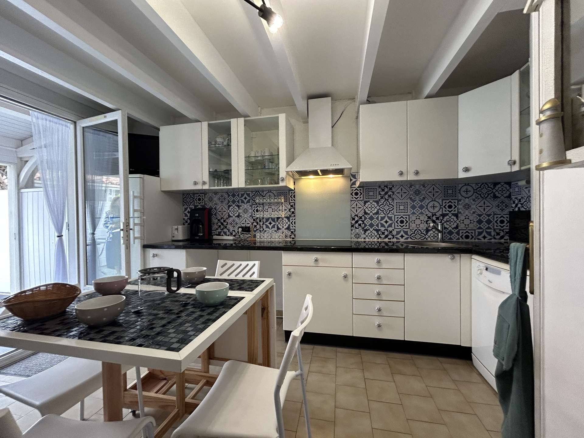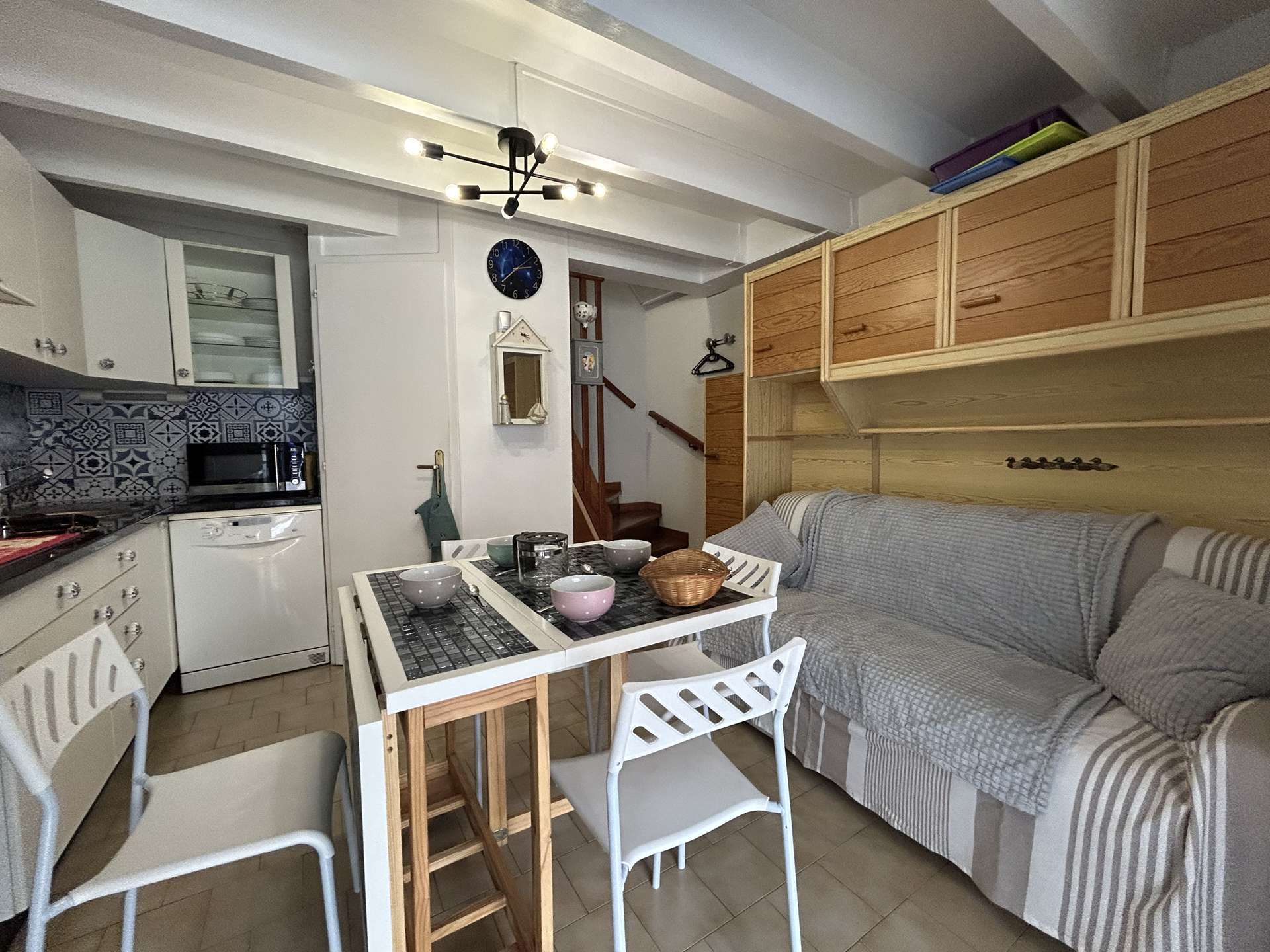 L'accès à la villa se fait par une terrasse agréable qui donne accès à une véranda puis au logement via une porte fenêtre vitrée. Cette petite villa deux pièces cabine située en rez-de-jardin comprend un rez-de-chaussée avec une pièce à vivre fonctionnelle avec cuisine moderne équipée, un espace salon avec coin TV, un espace buanderie, une chambre climatisée, un espace cabine avec lit superposé, une salle d'eau lumineuse avec wc.