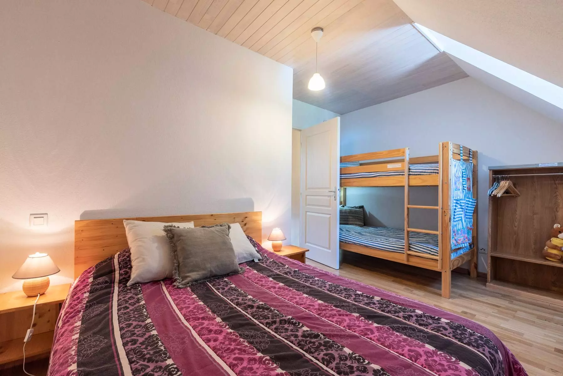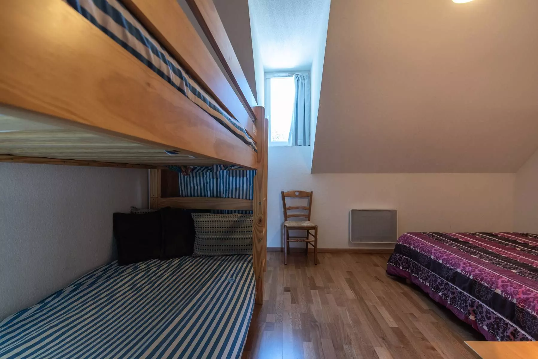 A bedroom with 2 single bunk beds + 1 double bed.
