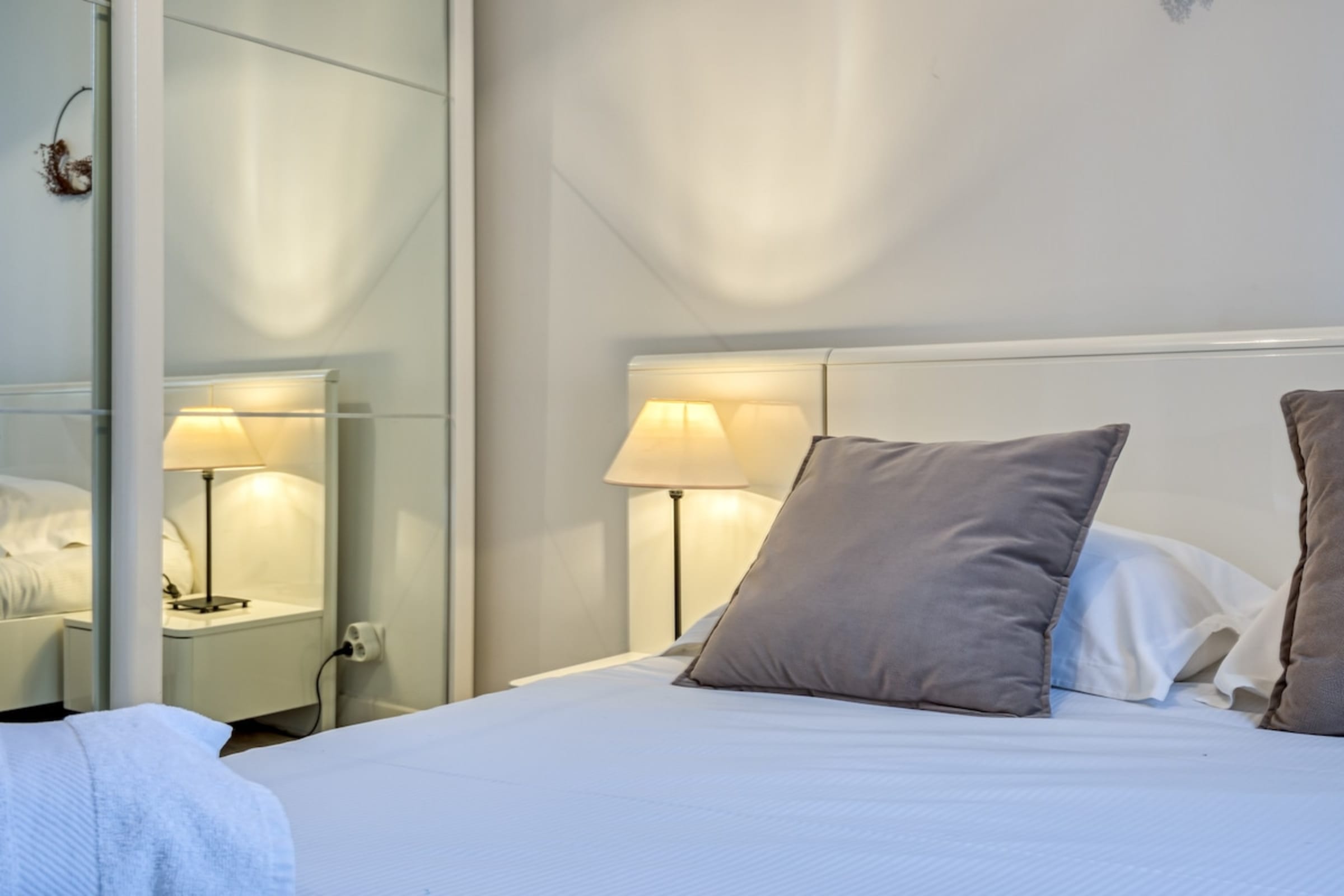 The living area includes a comfortable sofa and a TV. The kitchen has all the essentials and appliances needed to prepare meals: extractor hood, stovetop, coffee machine, toaster, kettle, oven, fridge/freezer, etc. The kitchen bar is perfect for enjoying your dishes. The bathroom also includes a washing machine, while the bedroom offers a double bed for restful nights.