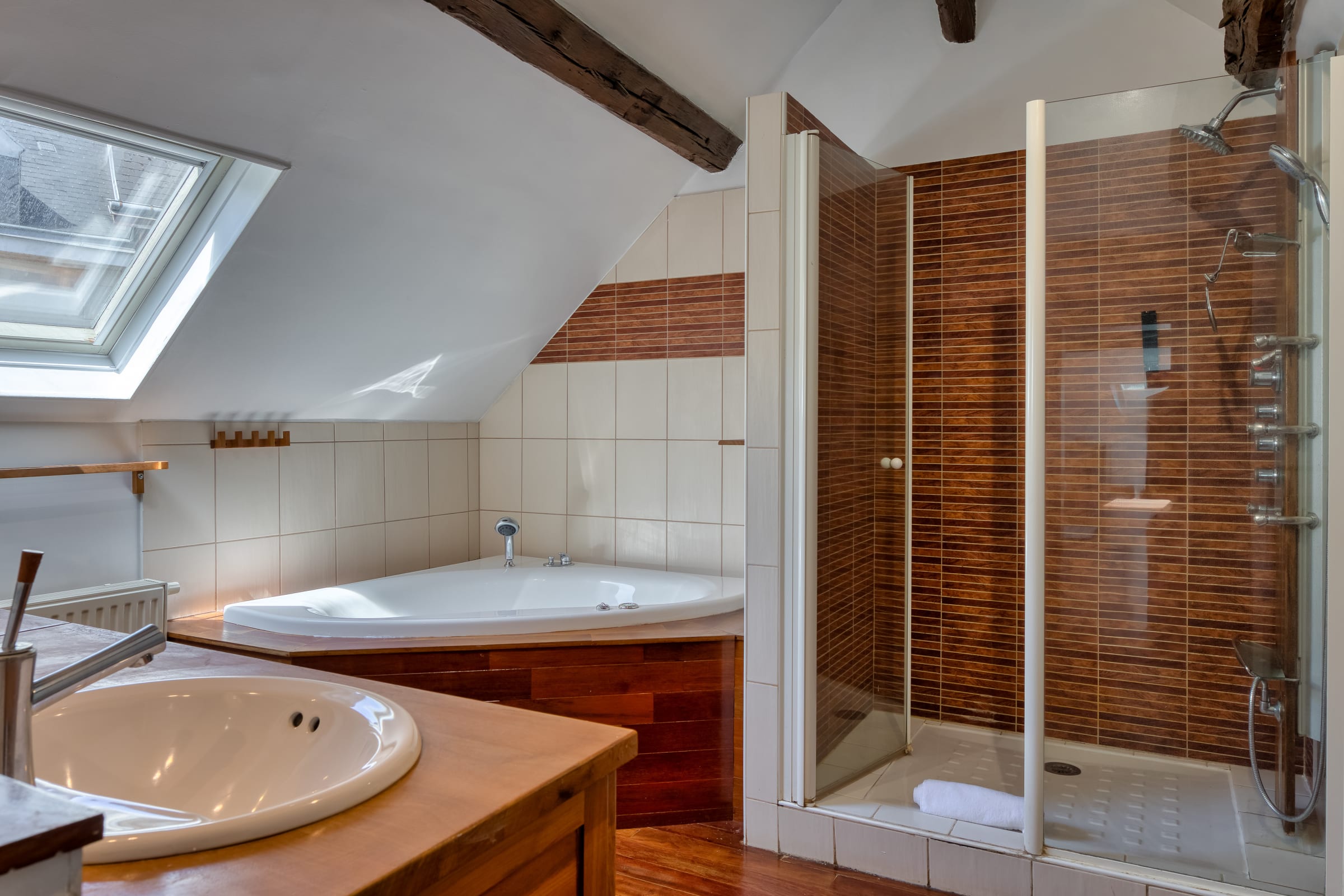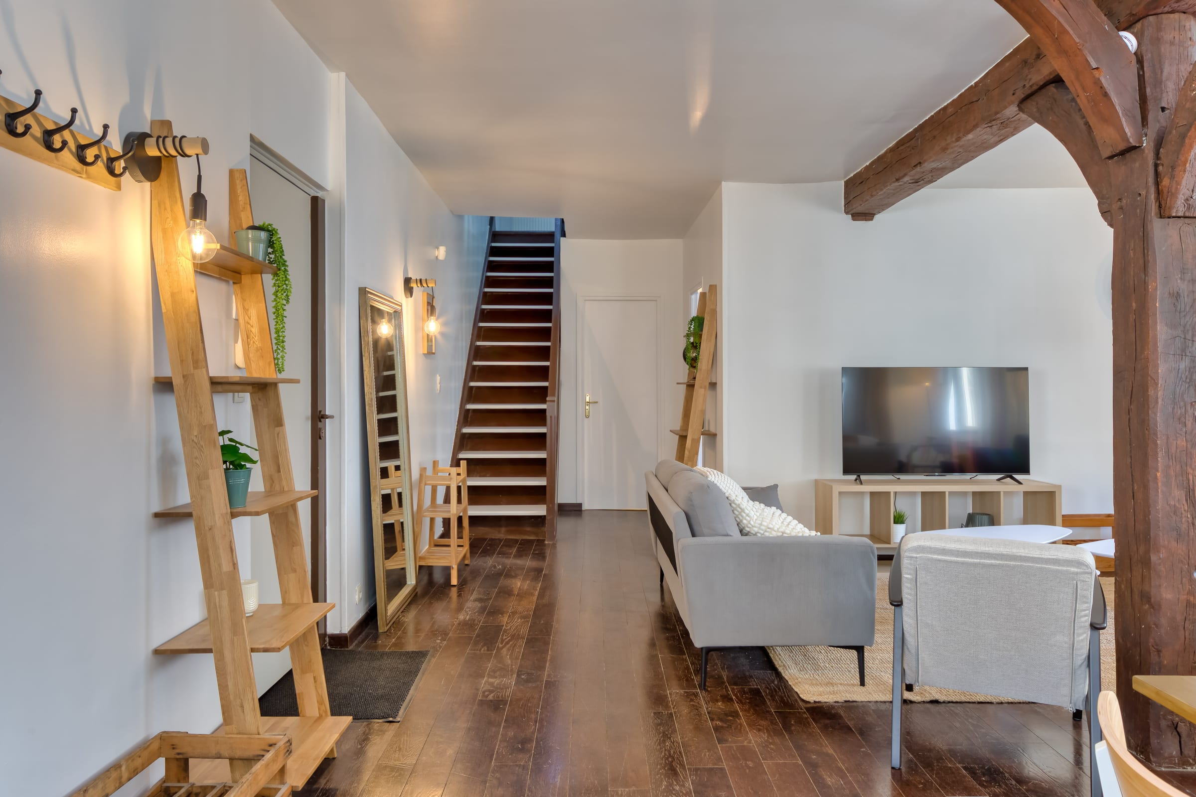 Welcome to this sumptuous duplex apartment, designed to offer absolute comfort, whether you are in Rouen on business or exploring the riches of the region. As you enter the building, a laundry room equipped with a washing machine and dryer ensures you have all the independence you need for a peaceful stay. A few steps higher, the apartment opens onto an elegant and functional floor. Discover a spacious living room bathed in light. Settle into the cosy living room with its comfortable sofas, welcoming armchairs, large television and coffee table, perfect for relaxing. The room flows harmoniously into a majestic dining table for 10 guests, ideal for sharing meals and memories, before leading to a chef's kitchen. Fully equipped (oven, microwave, Tassimo and filter coffee machines, toaster, kettle, dishwasher, induction hobs, extractor hood, American fridge), it offers everything you could possibly need to prepare gourmet breakfasts or refined dinners. Also on this level, enjoy a cosy bedroom with a double bed (160x200) and storage space, as well as an elegant bathroom with a large shower and toilet.