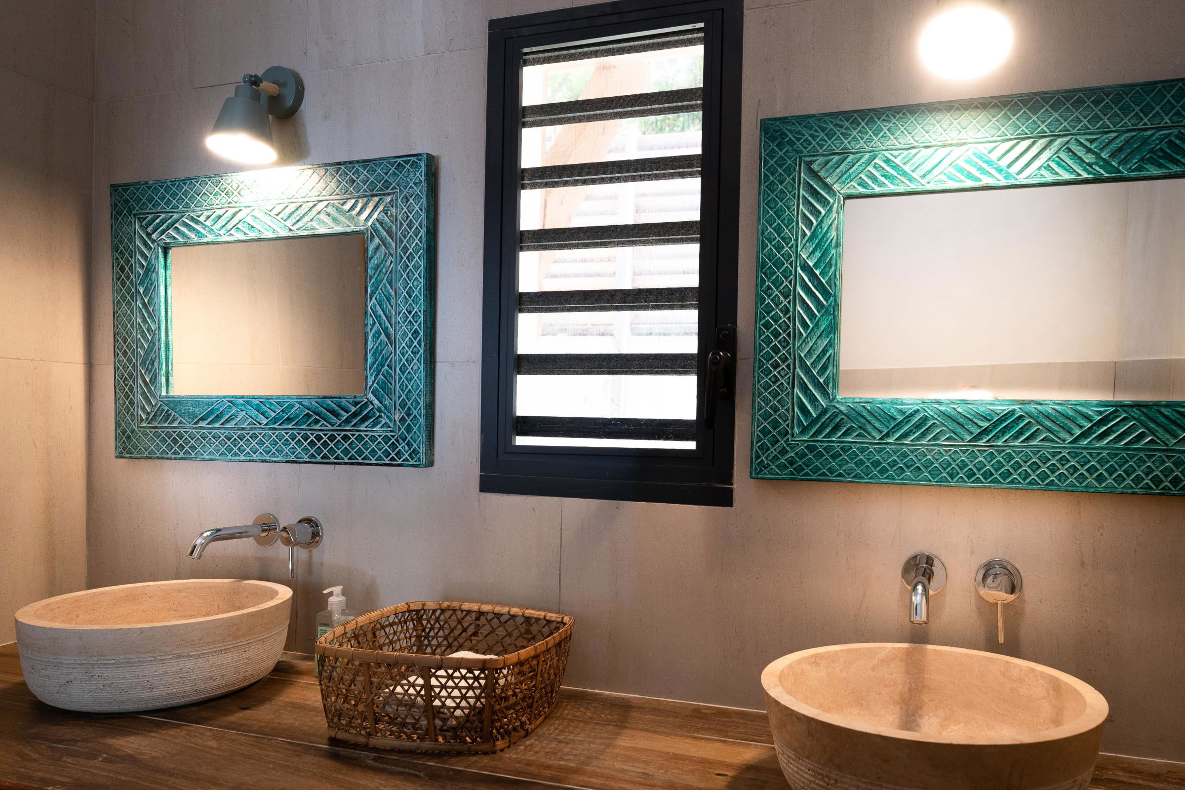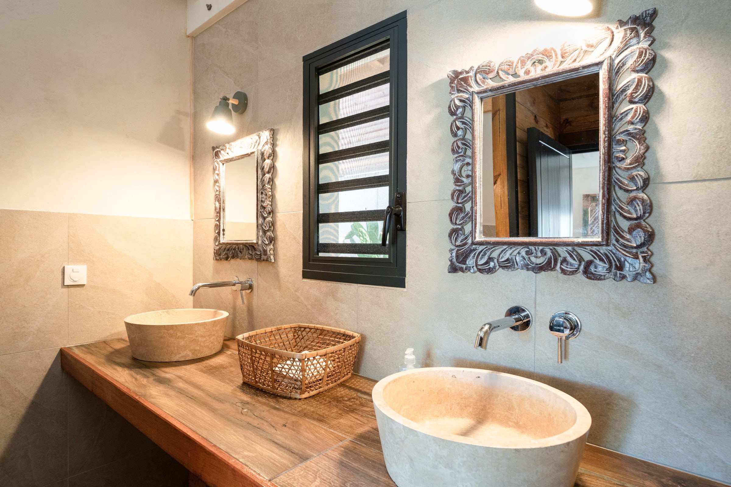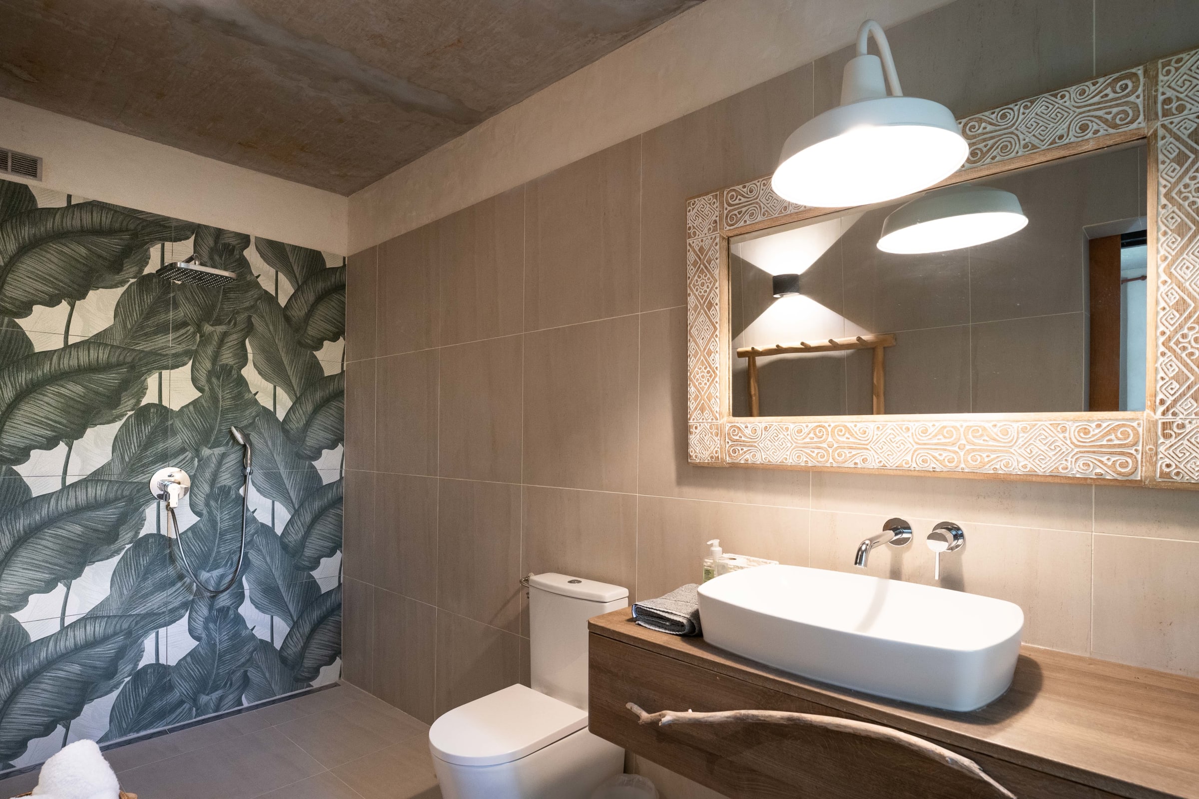 With its three bedrooms, one with a kingsize bed (180 cm) and two with queensize beds (160 cm) , this villa exudes comfort and tranquility. Each room has its own private bathroom, ensuring privacy for all.