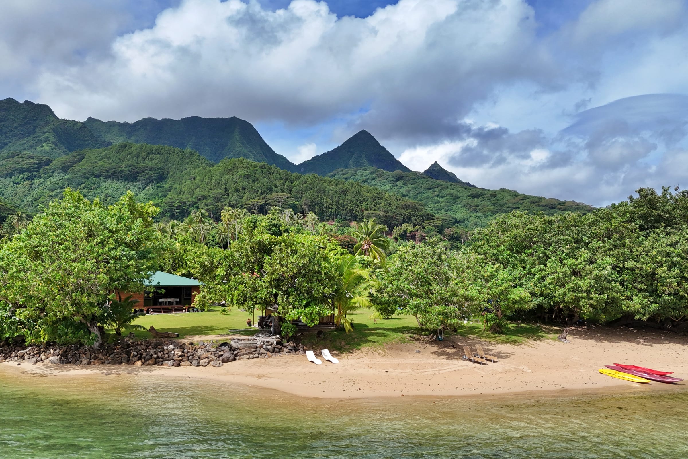 Here, time feels suspended between two worlds: on one side, a majestic mountain cloaked in tropical greenery; on the other, the translucent waters of the lagoon gently kiss a private beach reserved just for you.