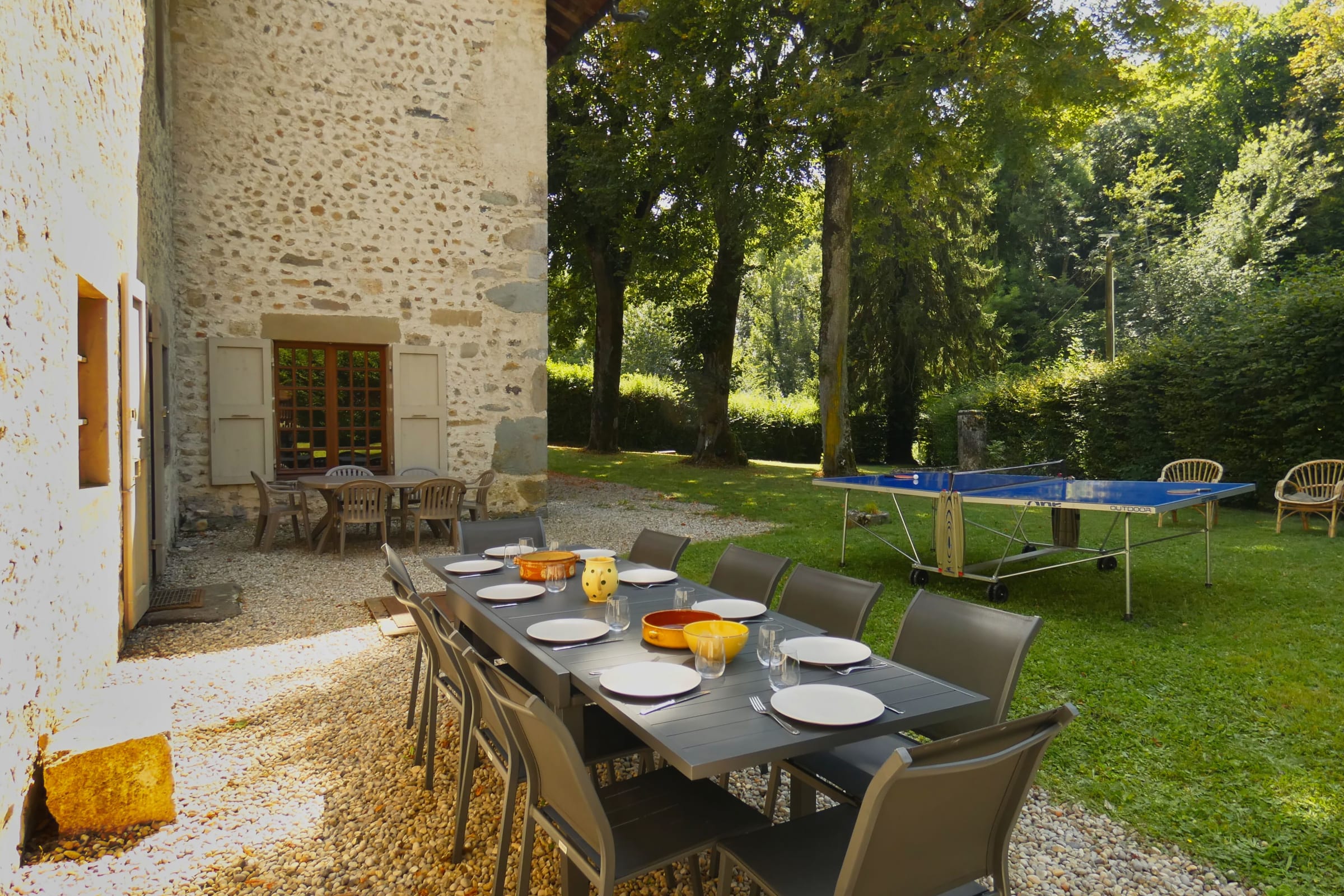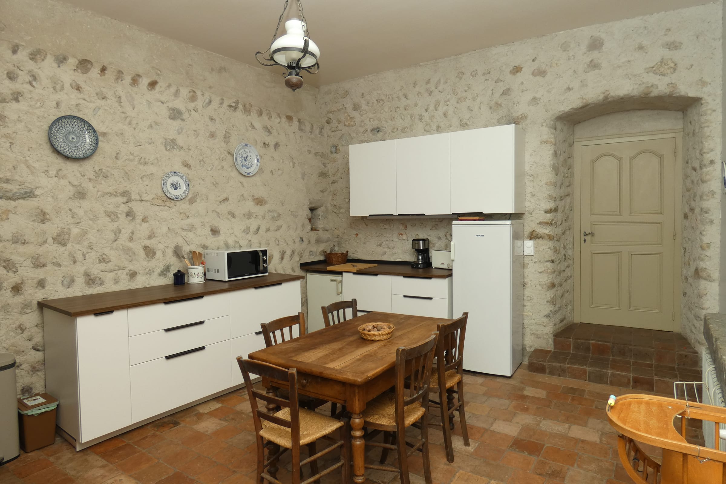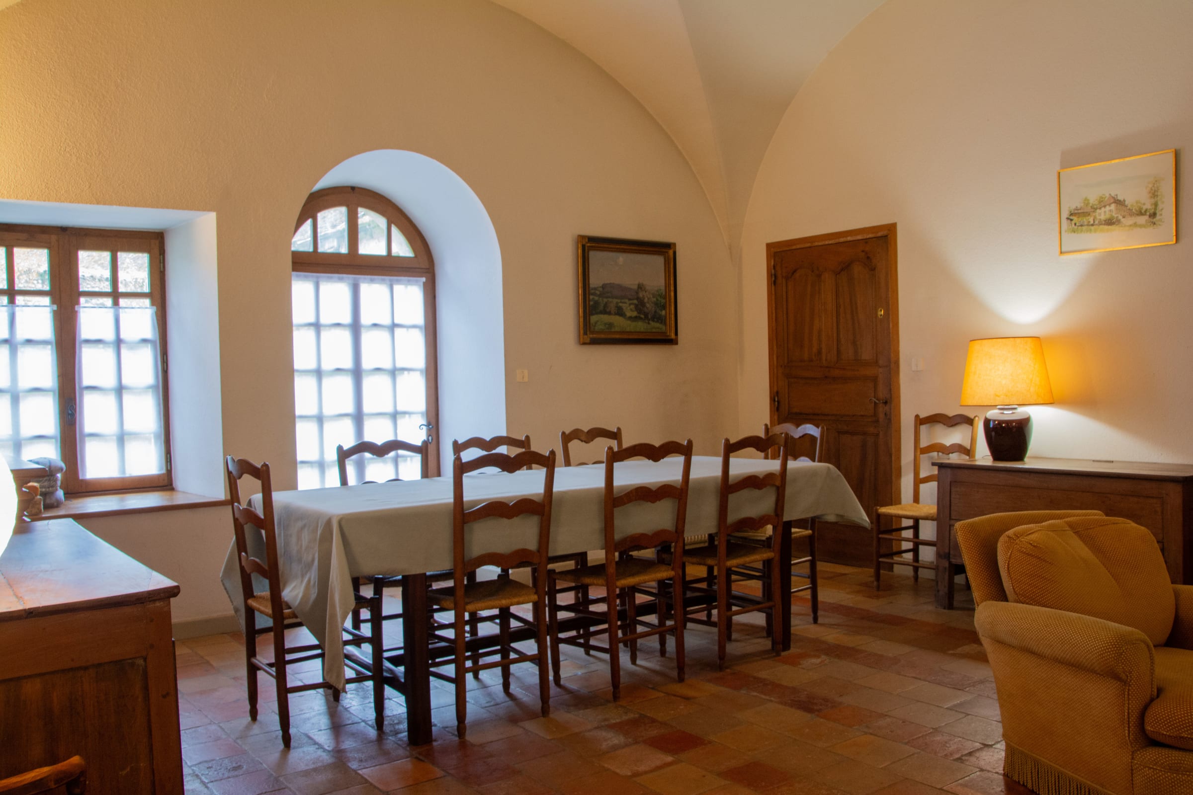 The kitchen and vaulted hall open onto the outside, giving direct access to the gîte's garden in fine weather for convivial outdoor meals.