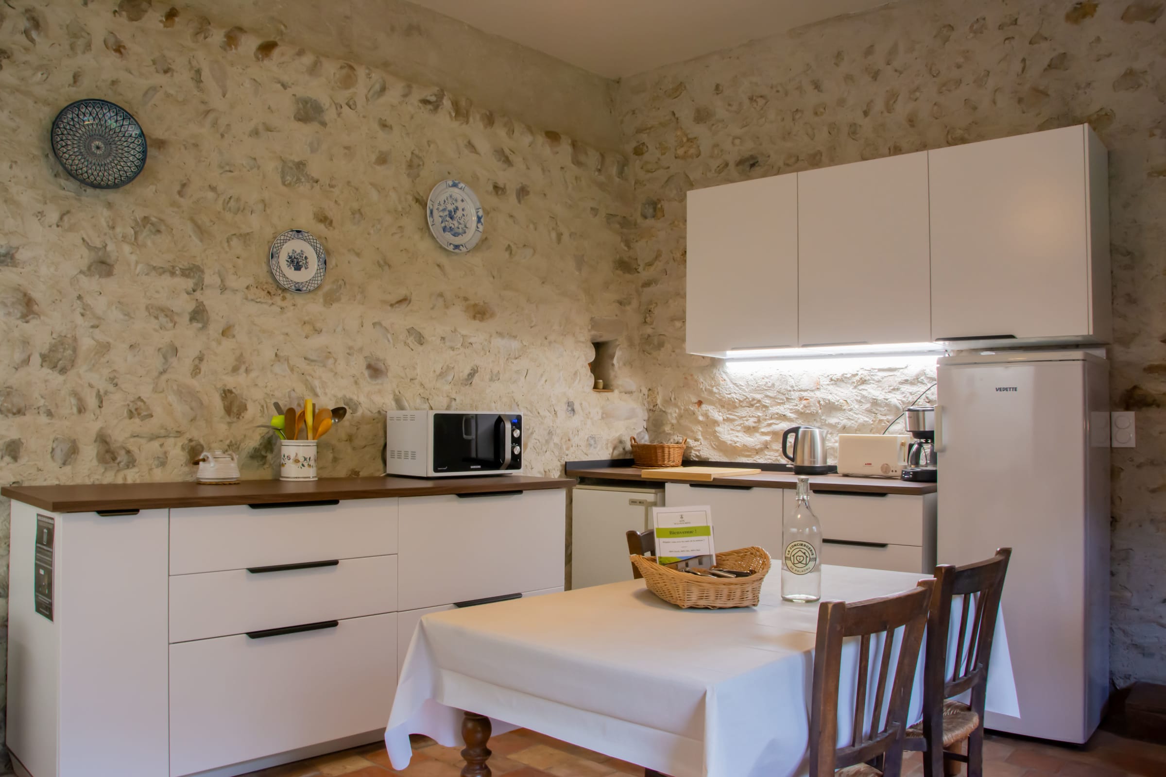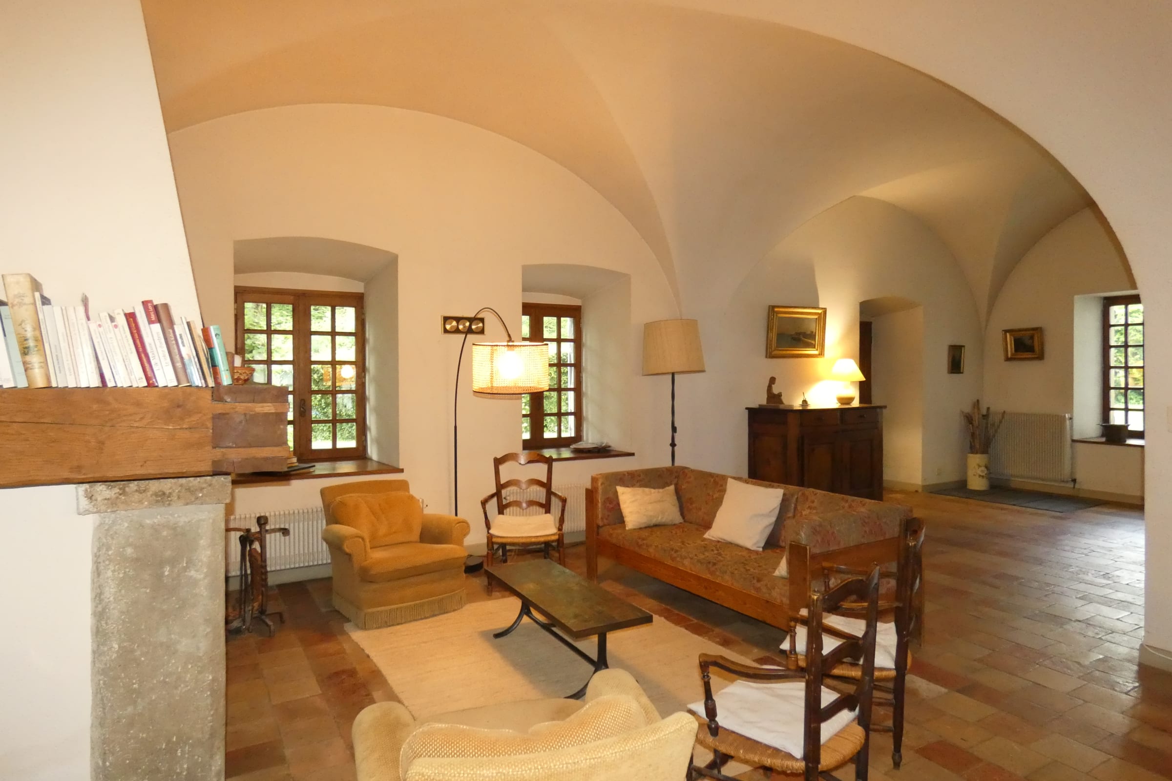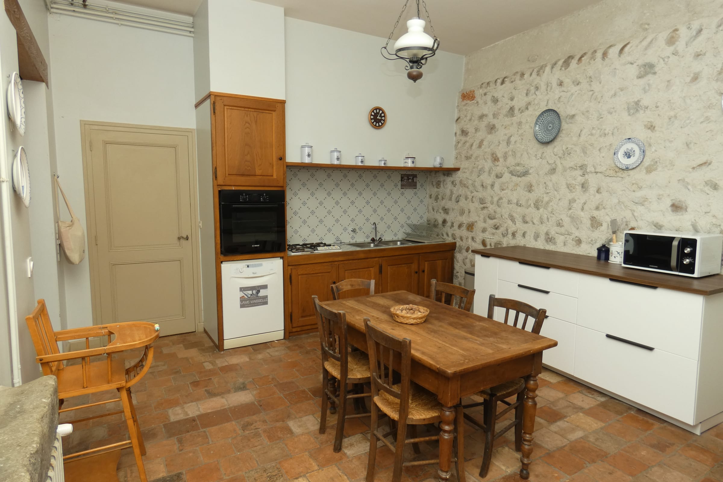 The kitchen and vaulted hall open onto the outside, giving direct access to the gîte's garden in fine weather for convivial outdoor meals.