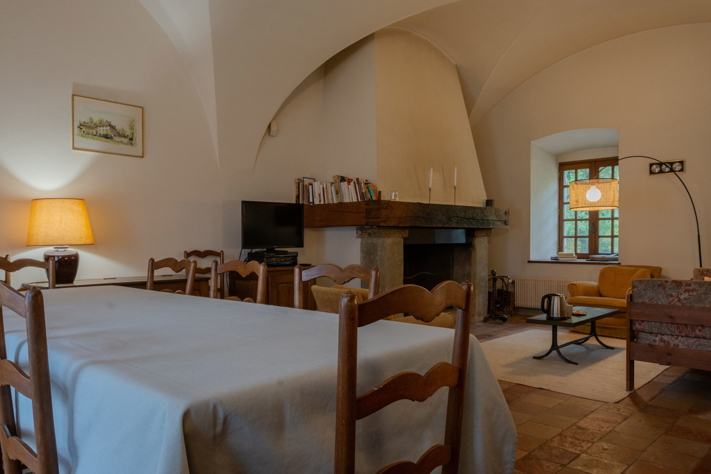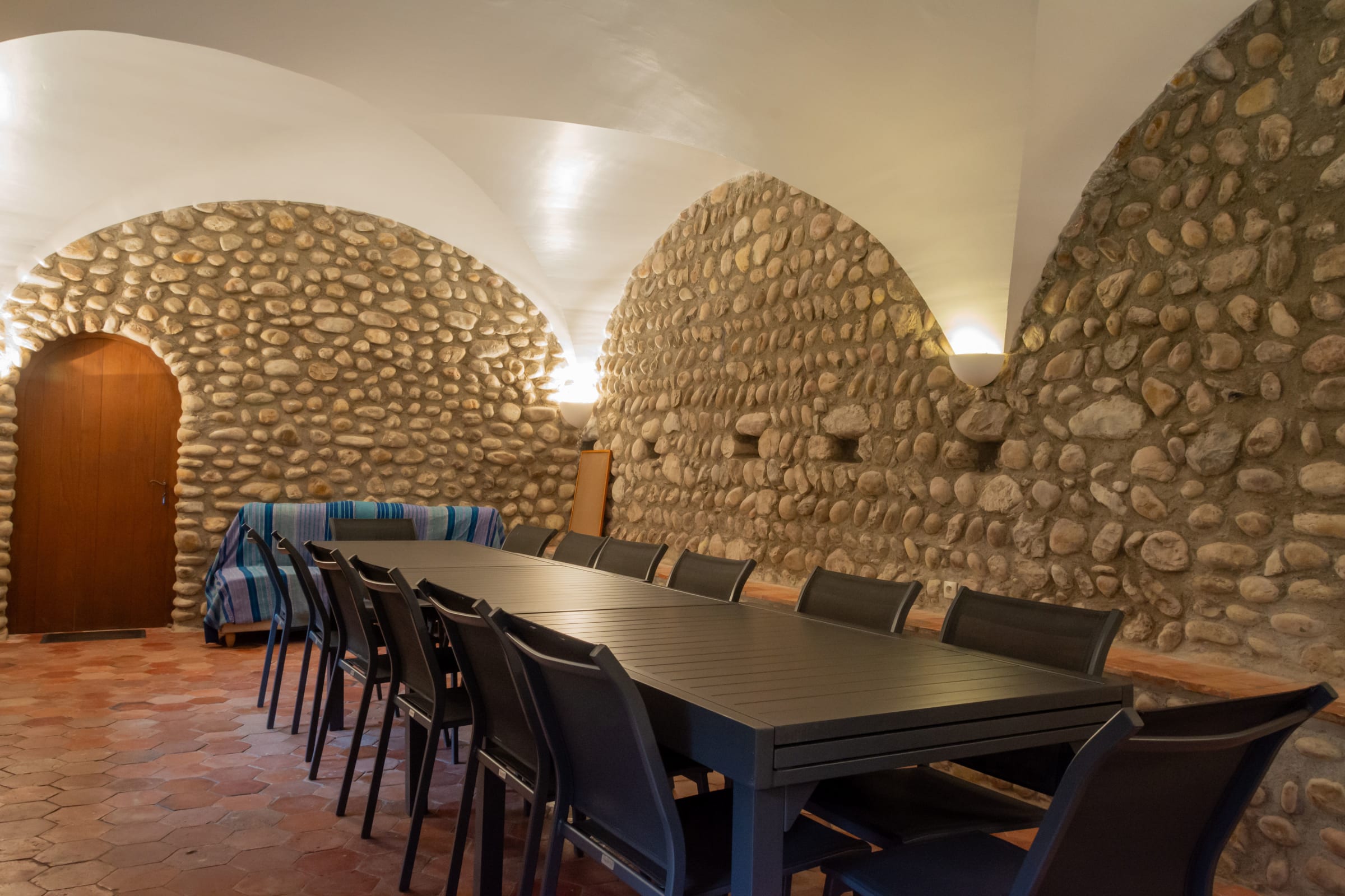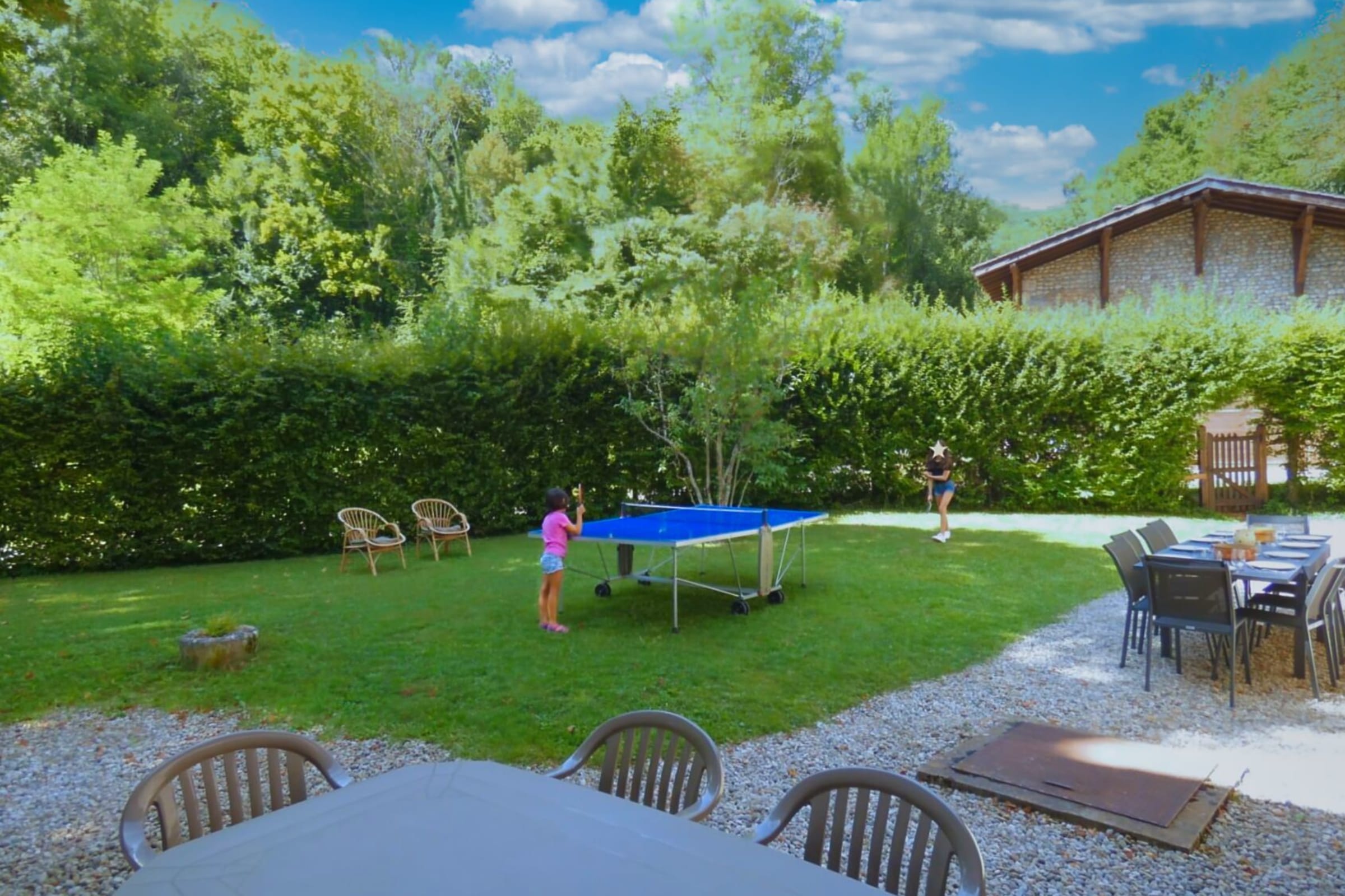 As soon as you enter, you'll be seduced by the vaulted reception room. With its comfortable dimensions of 9 metres long by 4 metres wide, you can organise your meetings (WIFI access), group activities, meals (tables and chairs for 20 people) and games of table tennis, depending on the theme of your stay.