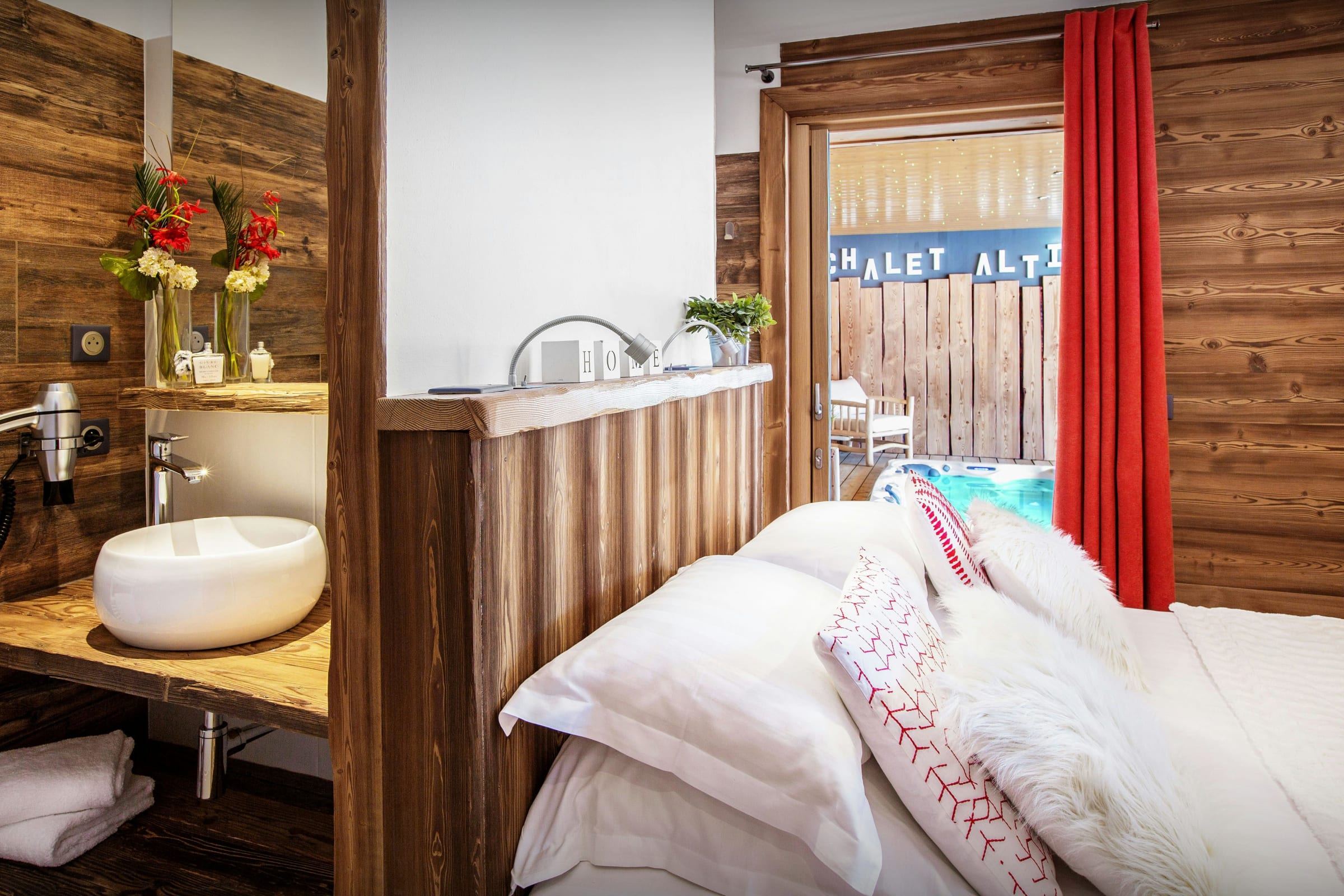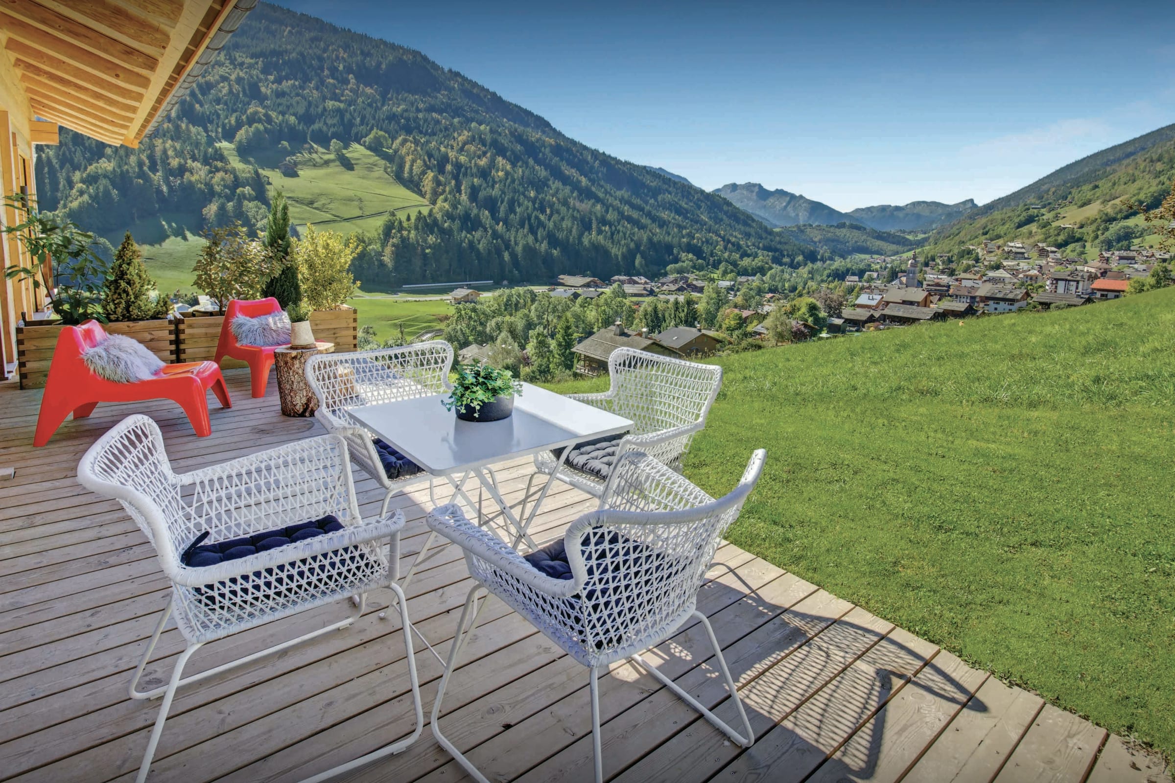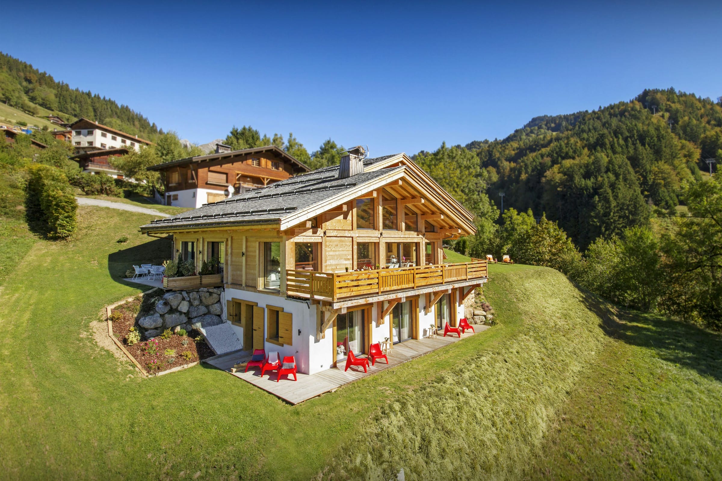 The chalet sits beautifully in the landscape; when indoors the outdoor spaces with spectacular views of the Aravis are part of the landscape of each room, views are open, the outdoor spaces are not overlooked, the chalet sits above open meadows. In fact in it’s great location, and special extra facilities such as the sheltered outdoor lounge, and the fabulous open air jacuzzi room Chalet Alti is a great place to stay all year round.
