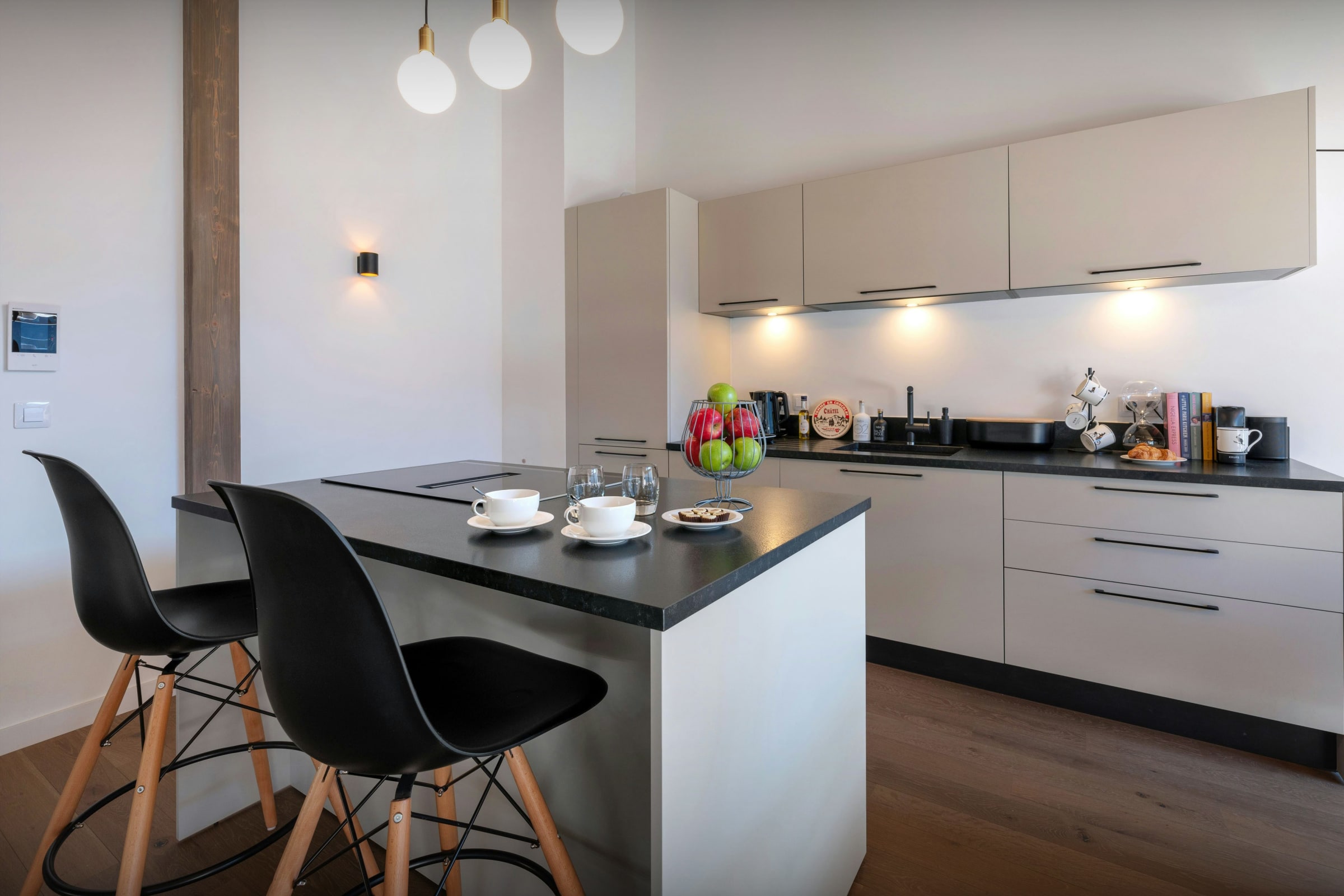 Although the living area is open-plan, the different areas are clearly defined - the comfortable seating area, the dining area with doors to the balcony and the sleek, modern kitchen with a cooking island and breakfast bar, so that whoever is cooking is still part of the conversation.