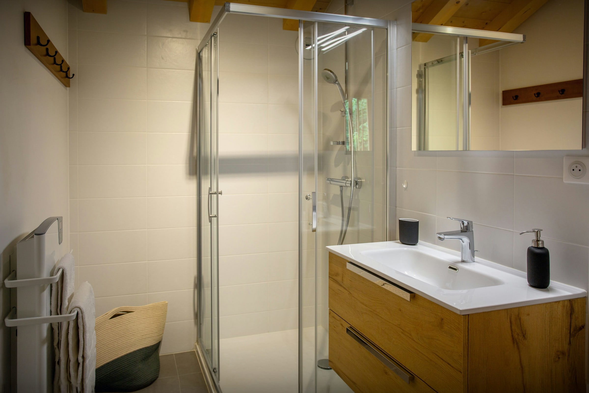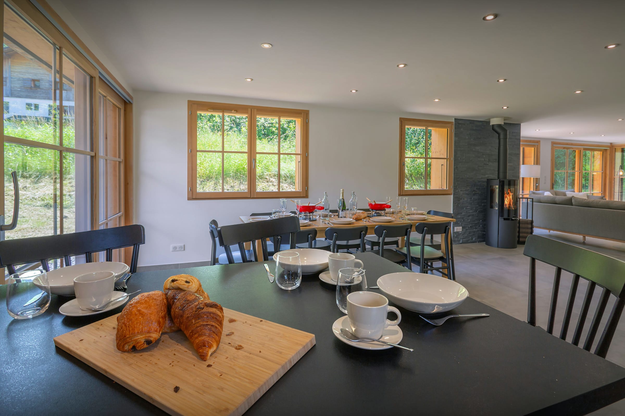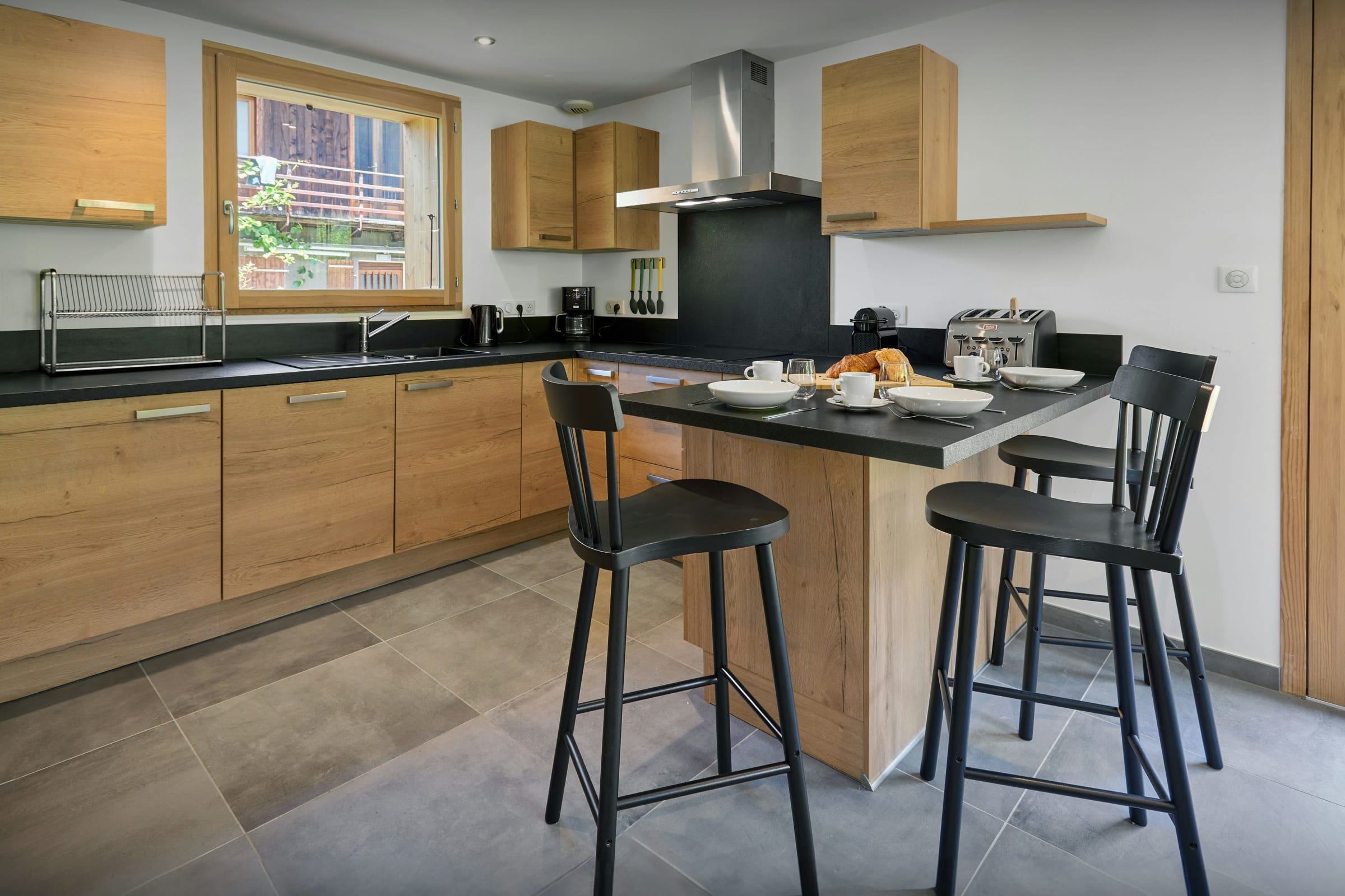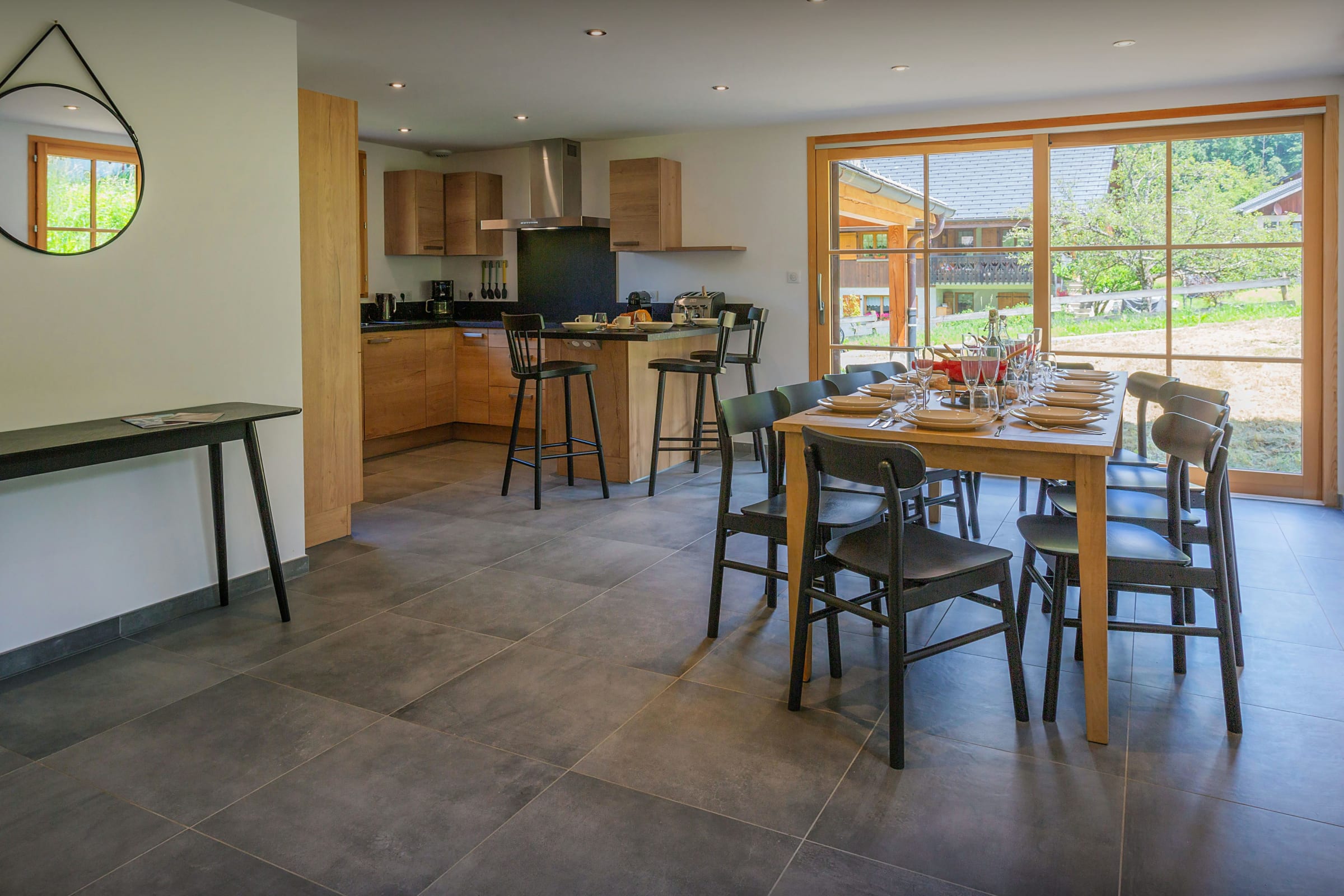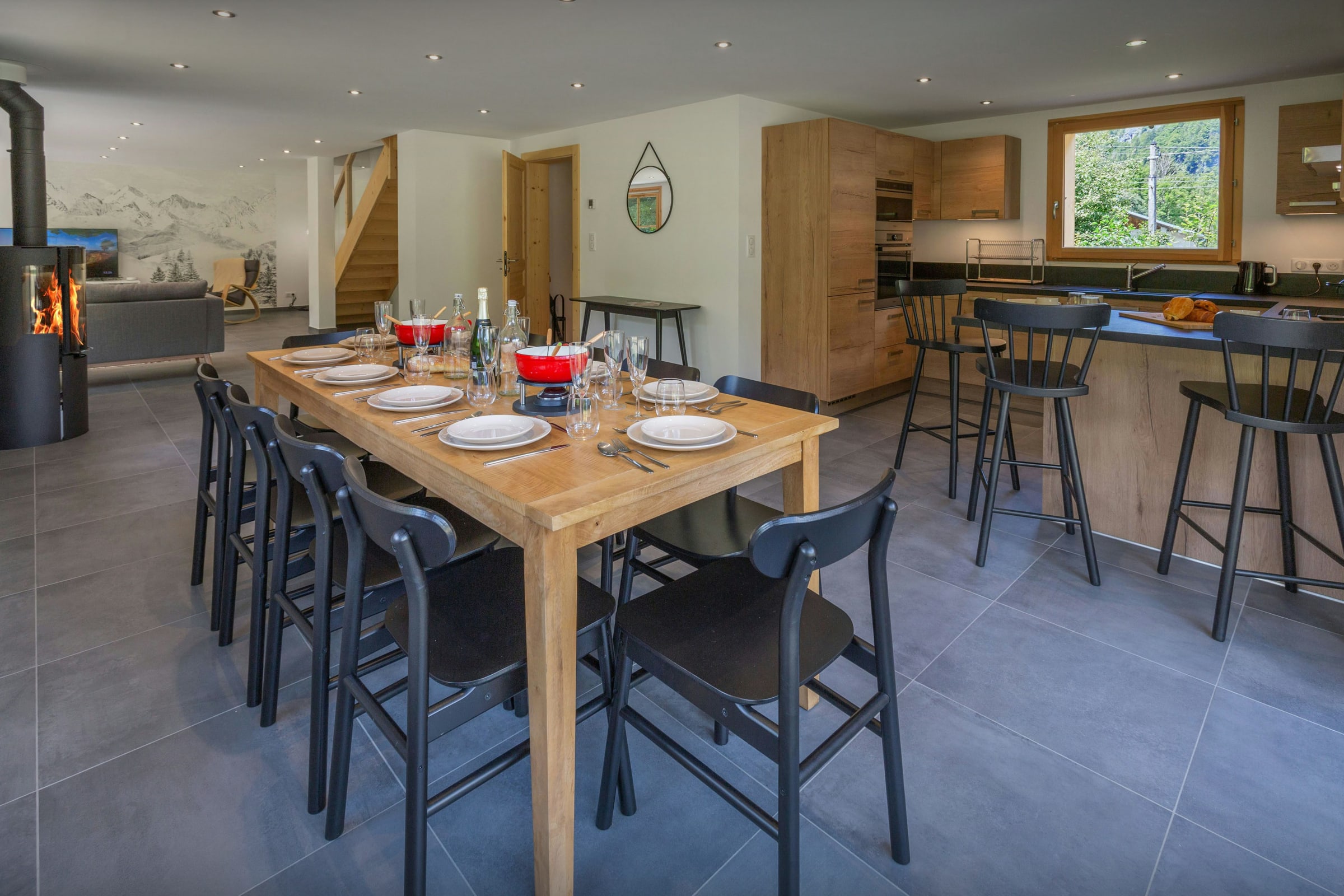 The ground floor is wonderfully bright and airy, with full-height windows and doors to the garden. There's a seating area with two sofas and chairs around the television, and a fully-equipped kitchen area with a breakfast bar and a dining table. There's also a laundry room with a washing machine and dryer, and a ski room where you can leave all your outdoor clothes and equipment.