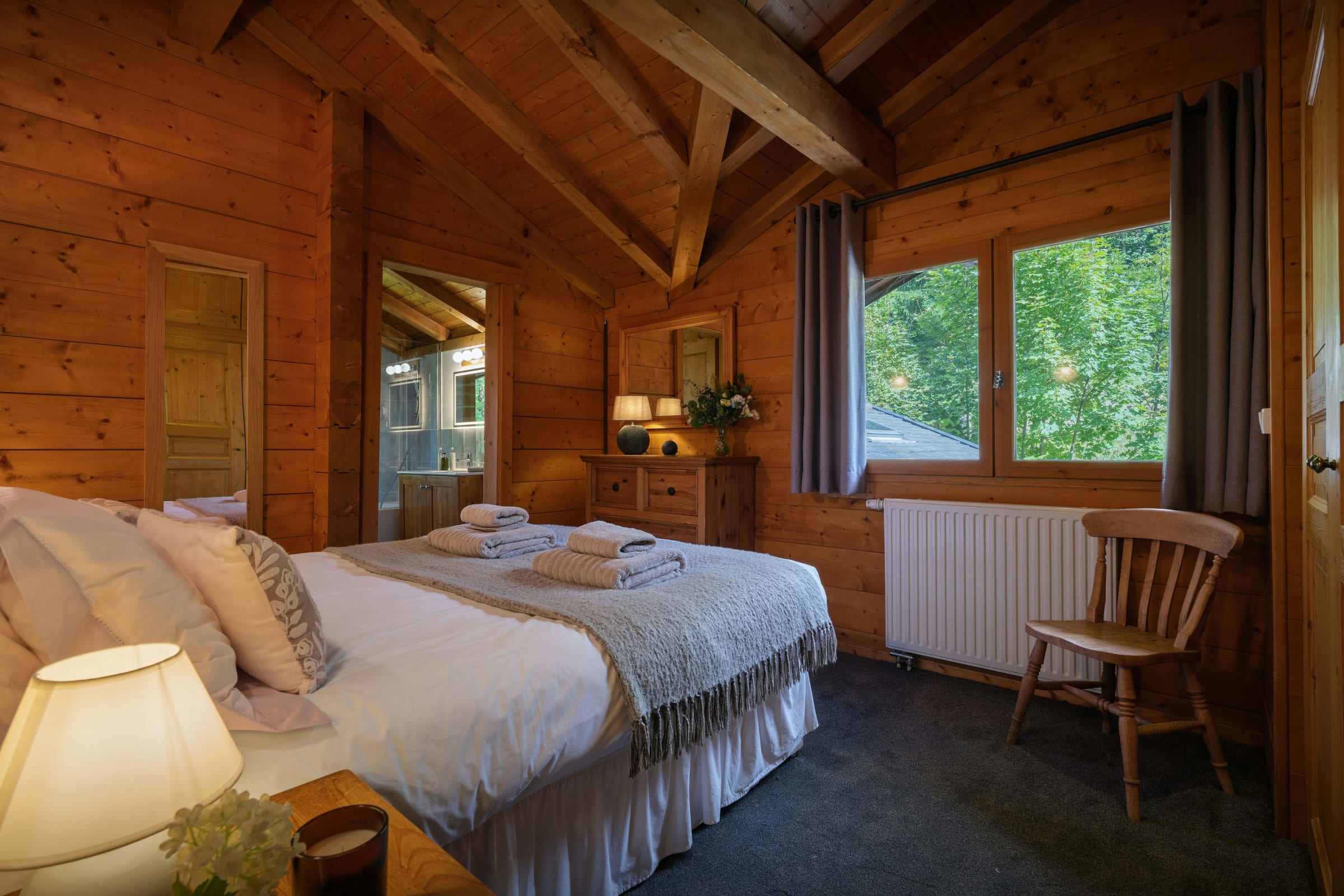 The living area on the ground floor has a cosy seating area around a log fire, another room where you can get together to watch TV and a huge dining table with plenty of room for everyone to eat together. This area opens onto a spacious, wraparound terrace where you can soak in the hot tub, lounge on the sunbeds or enjoy a barbecue.