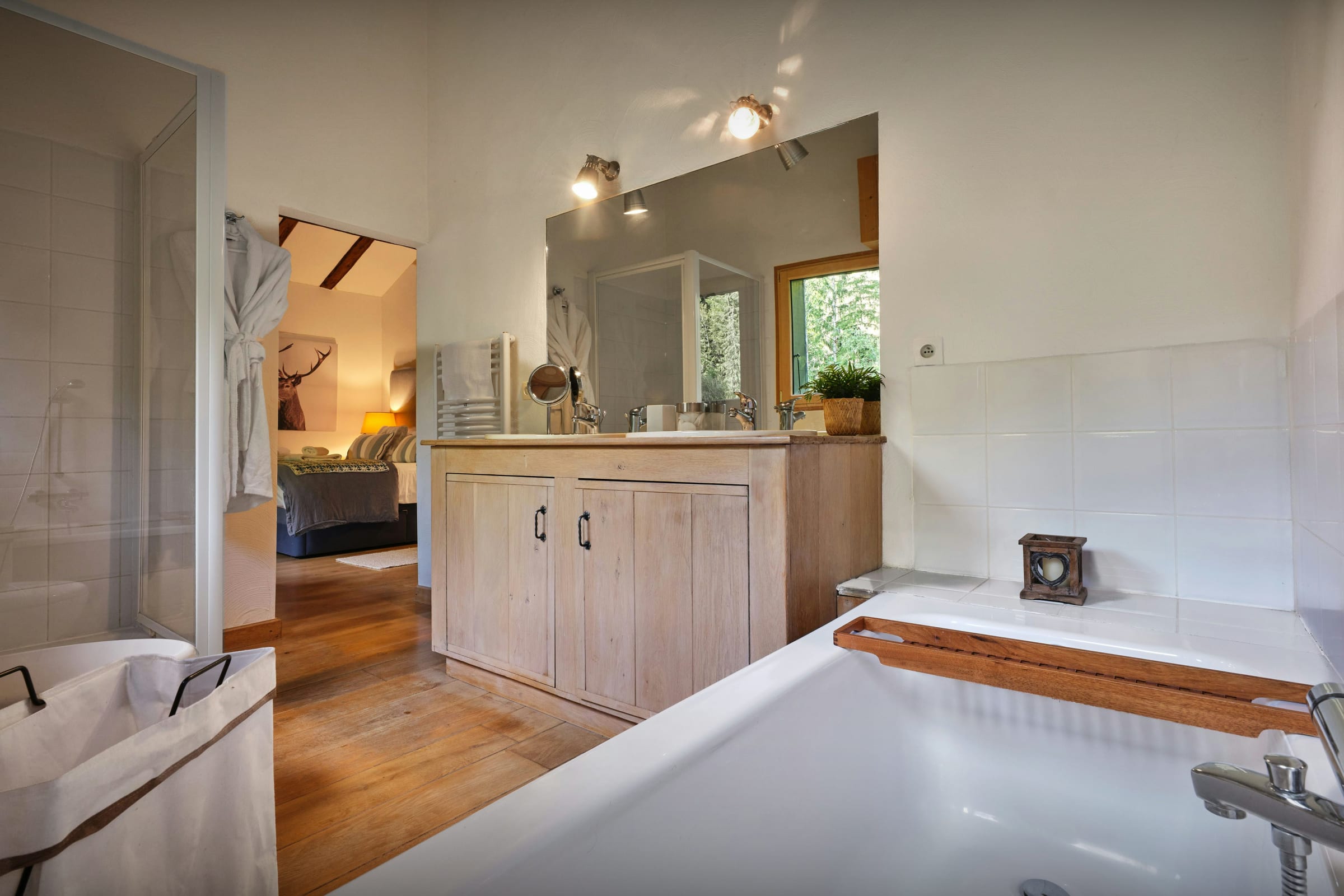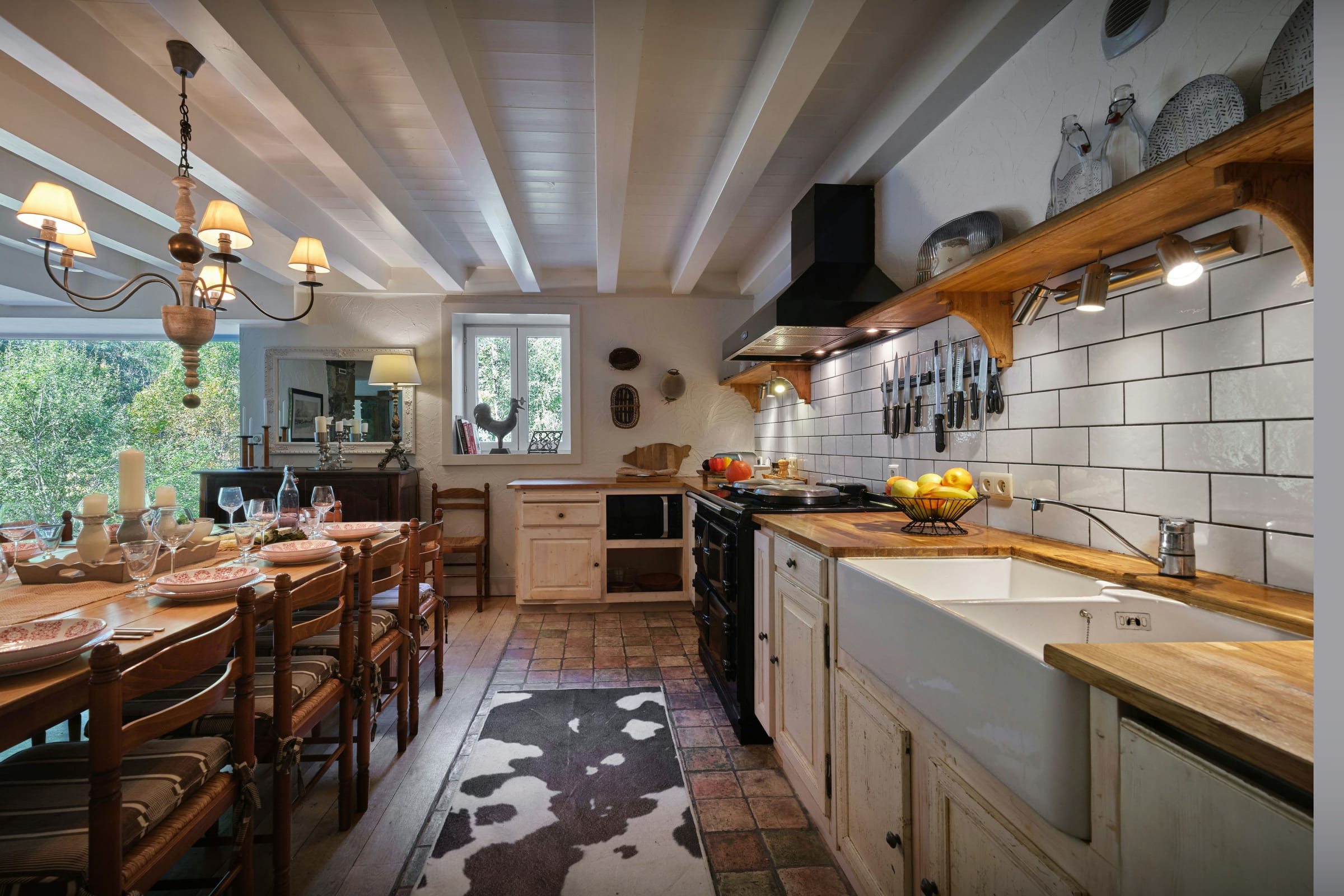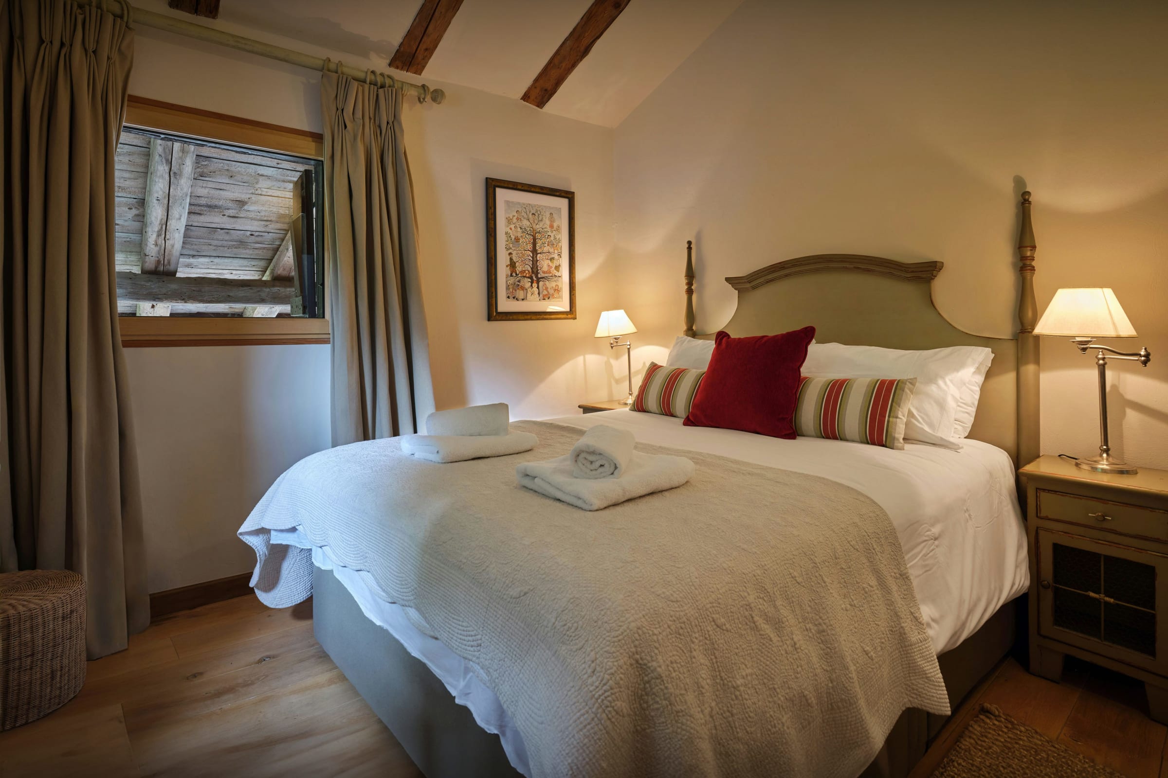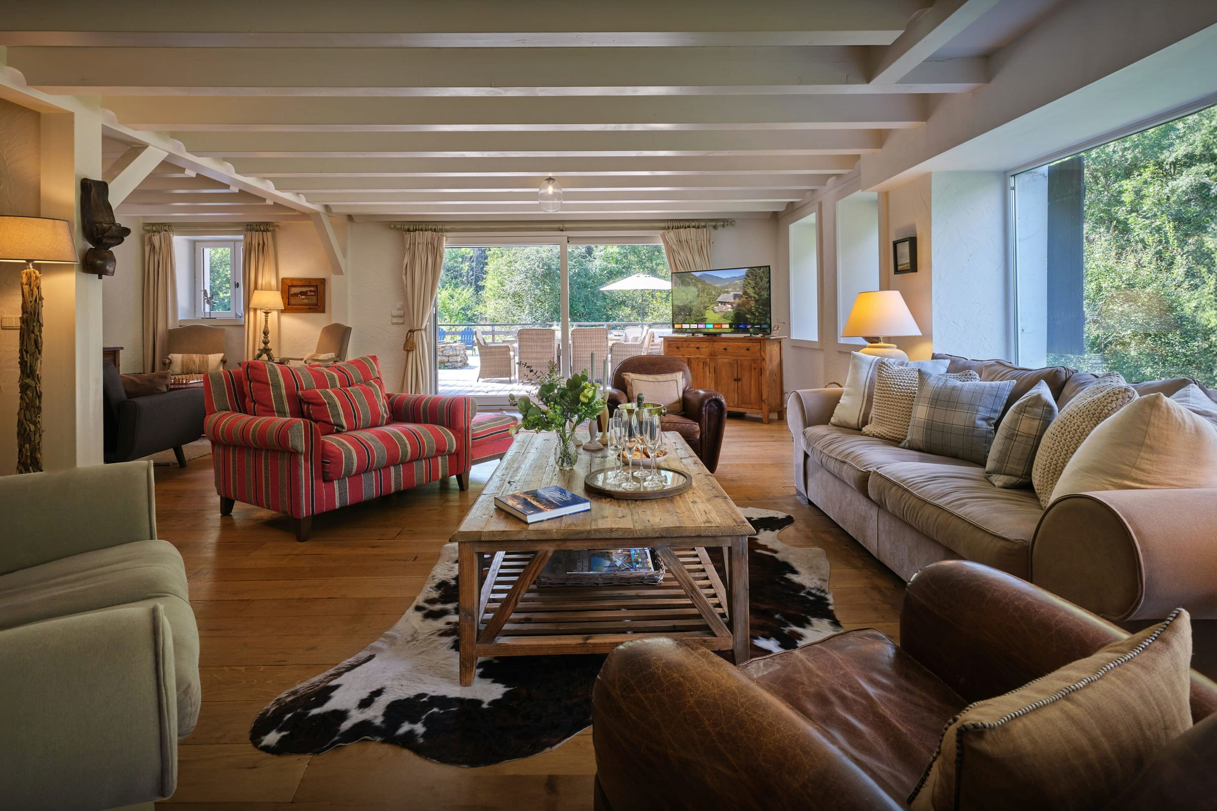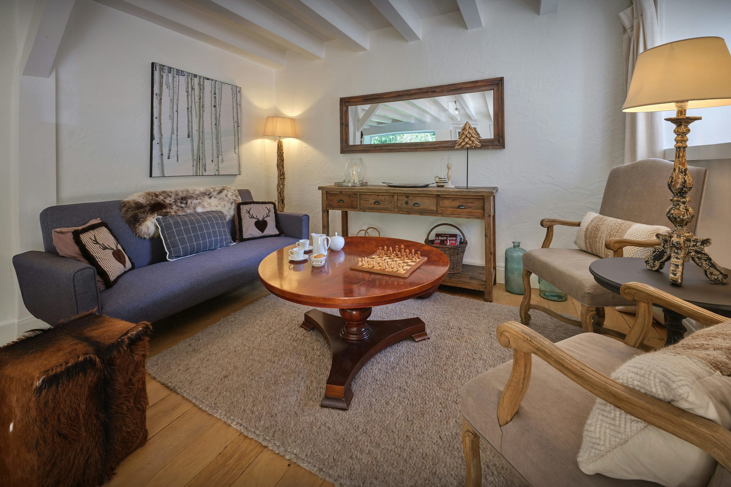 The living area on the ground floor has a large well-equipped kitchen with an Aga stove and a large dining table where you can enjoy meals together. A four-sided fireplace separates the dining area from the various seating areas – get together on the cosy sofas, watch TV together, enjoy a game of chess or curl up with a good book.