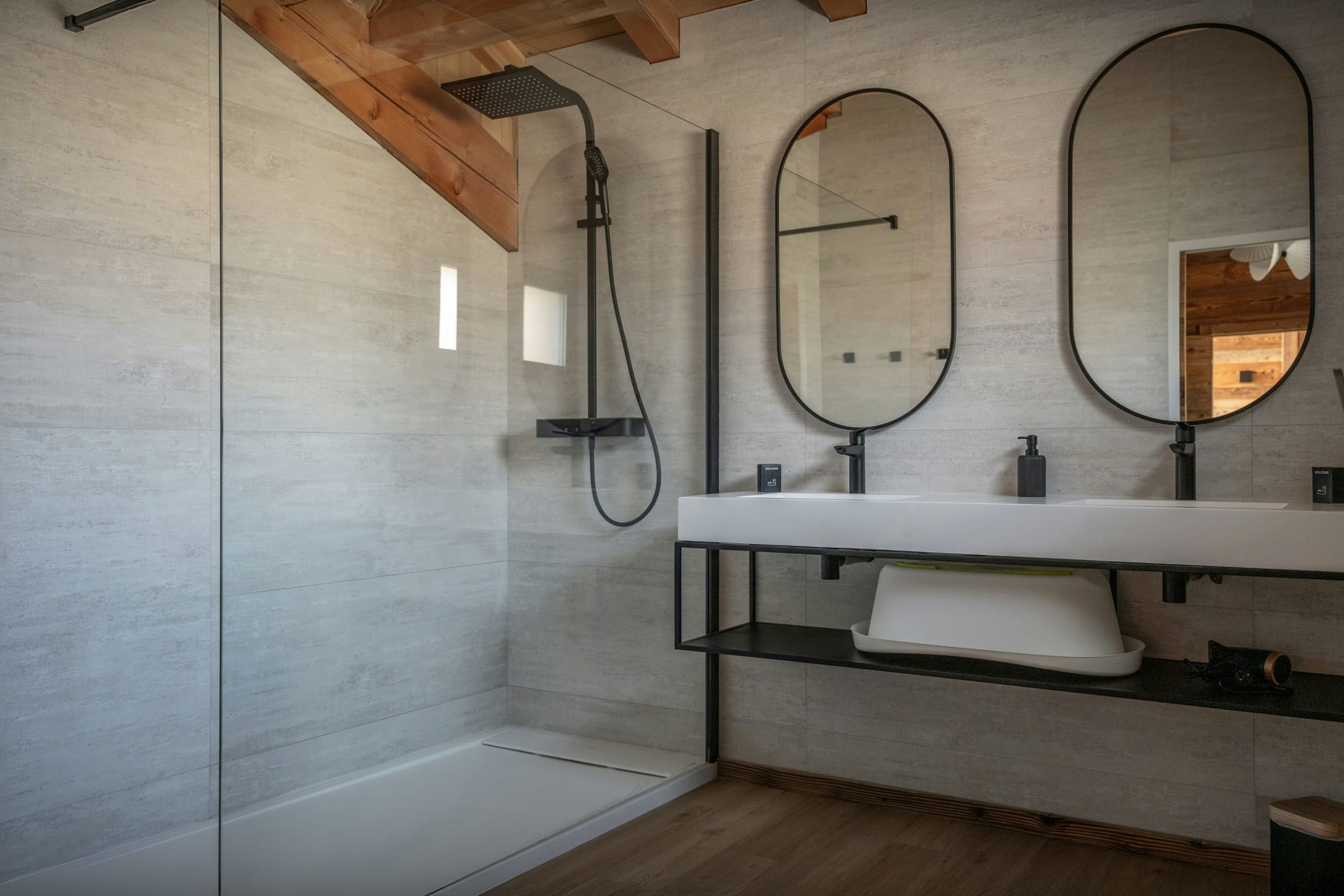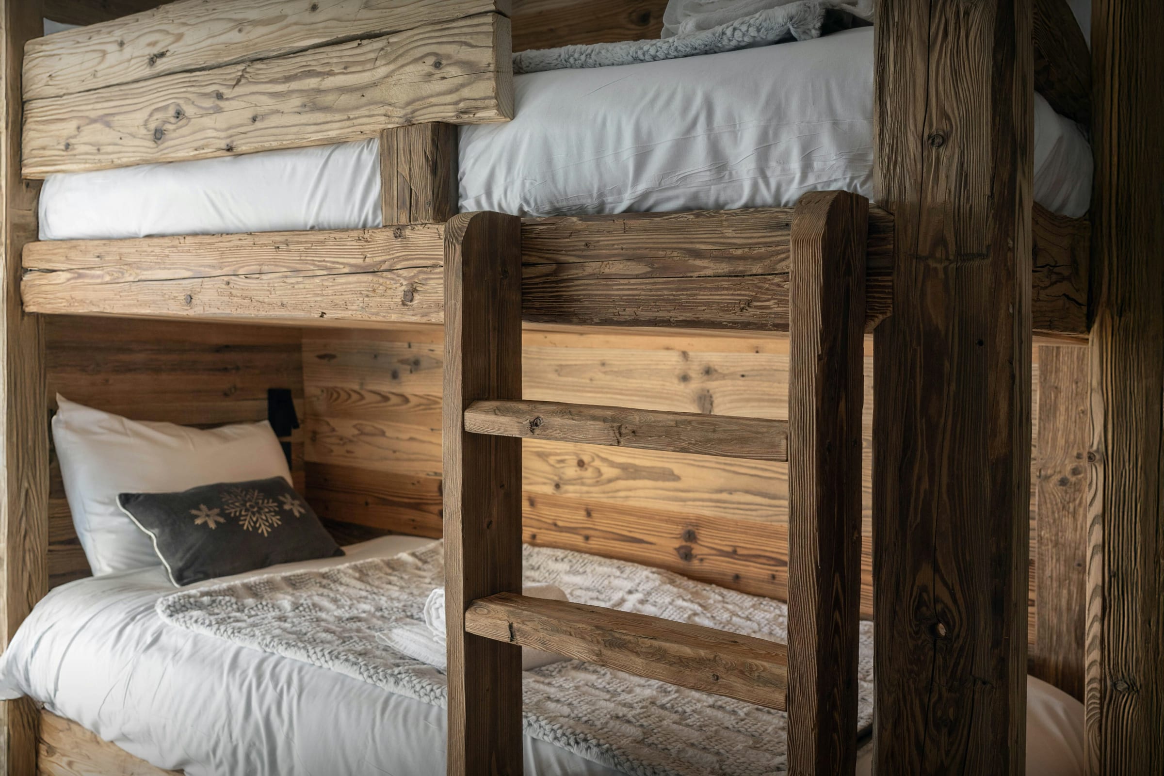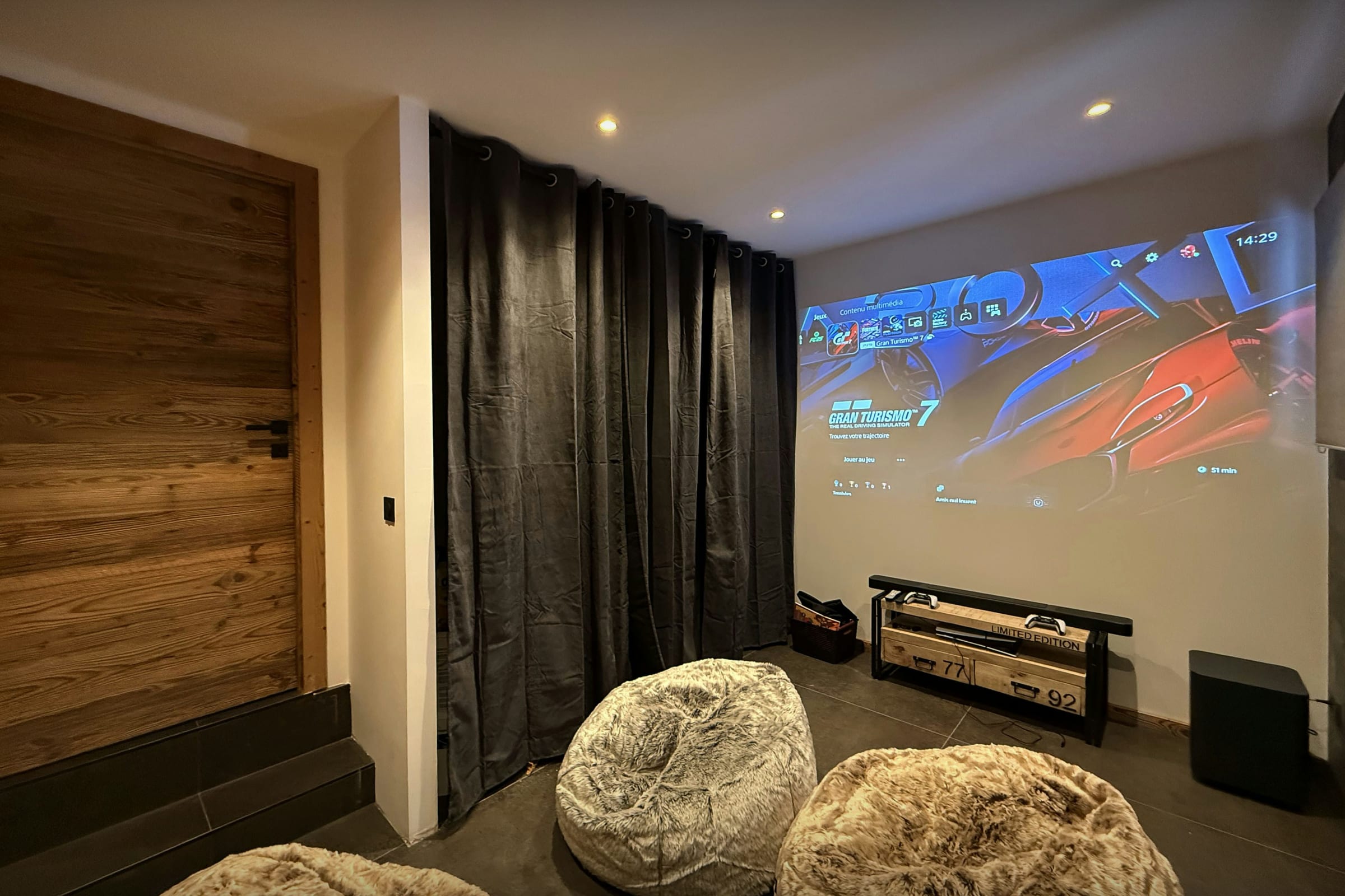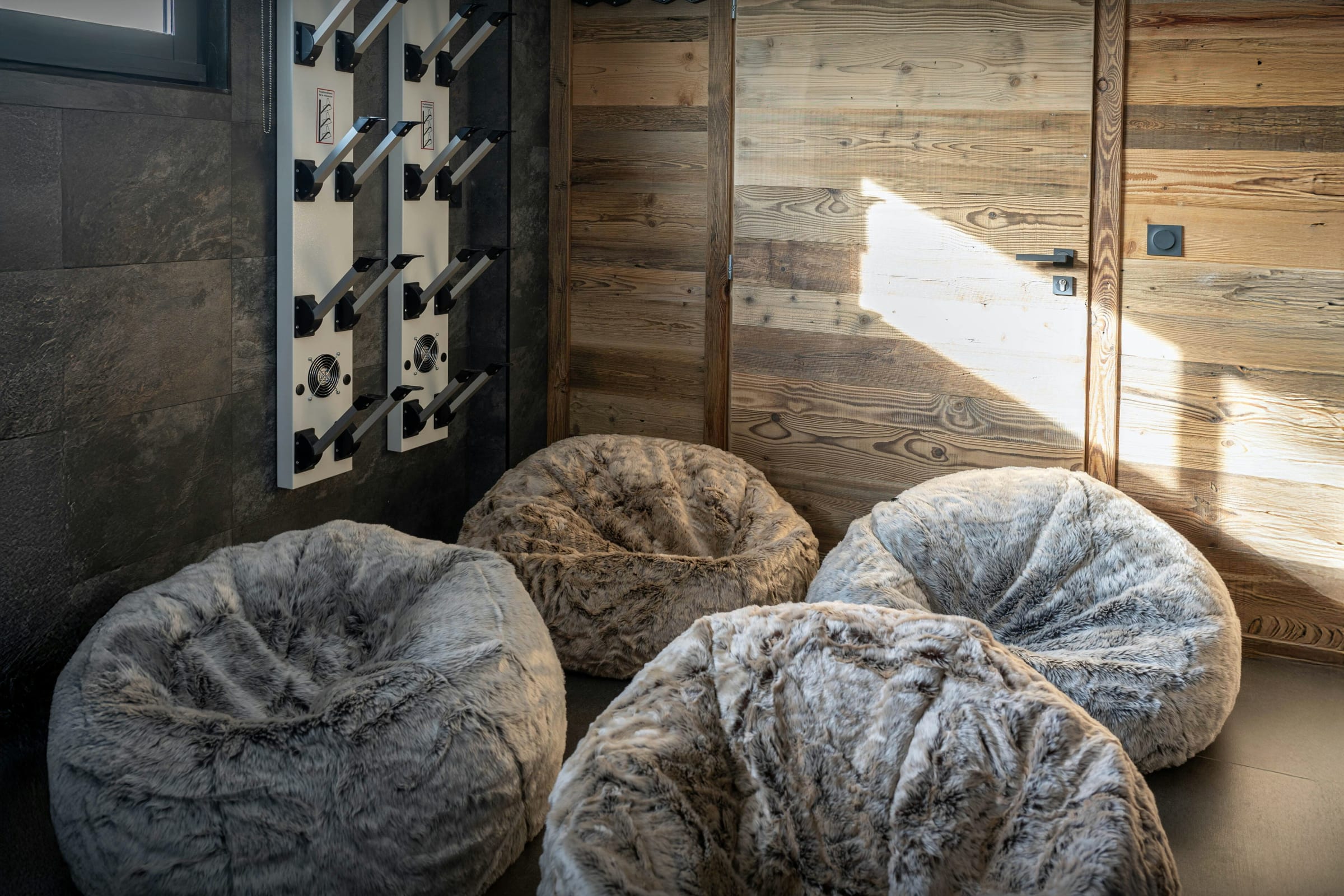 You'll find three of the bedrooms on the ground floor: two double bedrooms and a dormitory-style bedroom with two sets of bunk beds. Each of these bedrooms has a stylish en-suite shower room, and two of them open onto the terrace, where you'll find sunbeds and the hot tub. Children have their own playroom with a video projector, where they can play computer games or karaoke sessions without disturbing the adults. There's also a laundry and ski room on this floor with a heated boot rack.