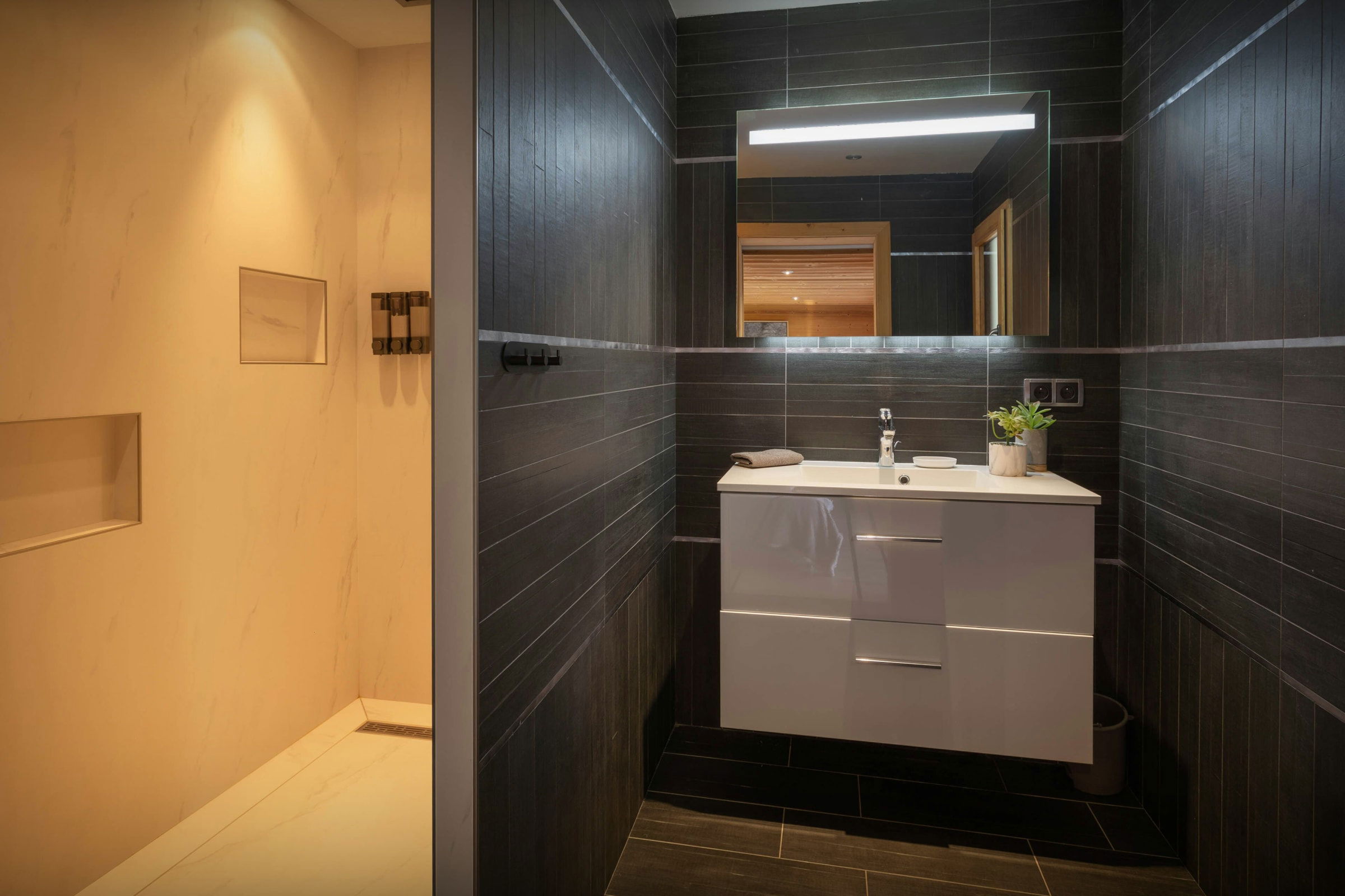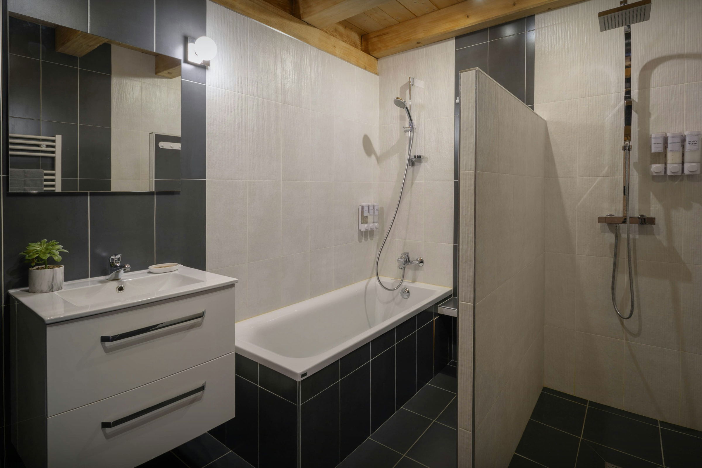 The four bedrooms of Chalet Wanderlust are on the lower floor. There are two double bedrooms, one of which has an en-suite shower room and doors to the garden. Another room has a double bed with a single bunk over it, and the final room has three single beds. There's a bathroom with a bath and walk-in shower, a separate WC and a laundry room with a washing machine and dryer.