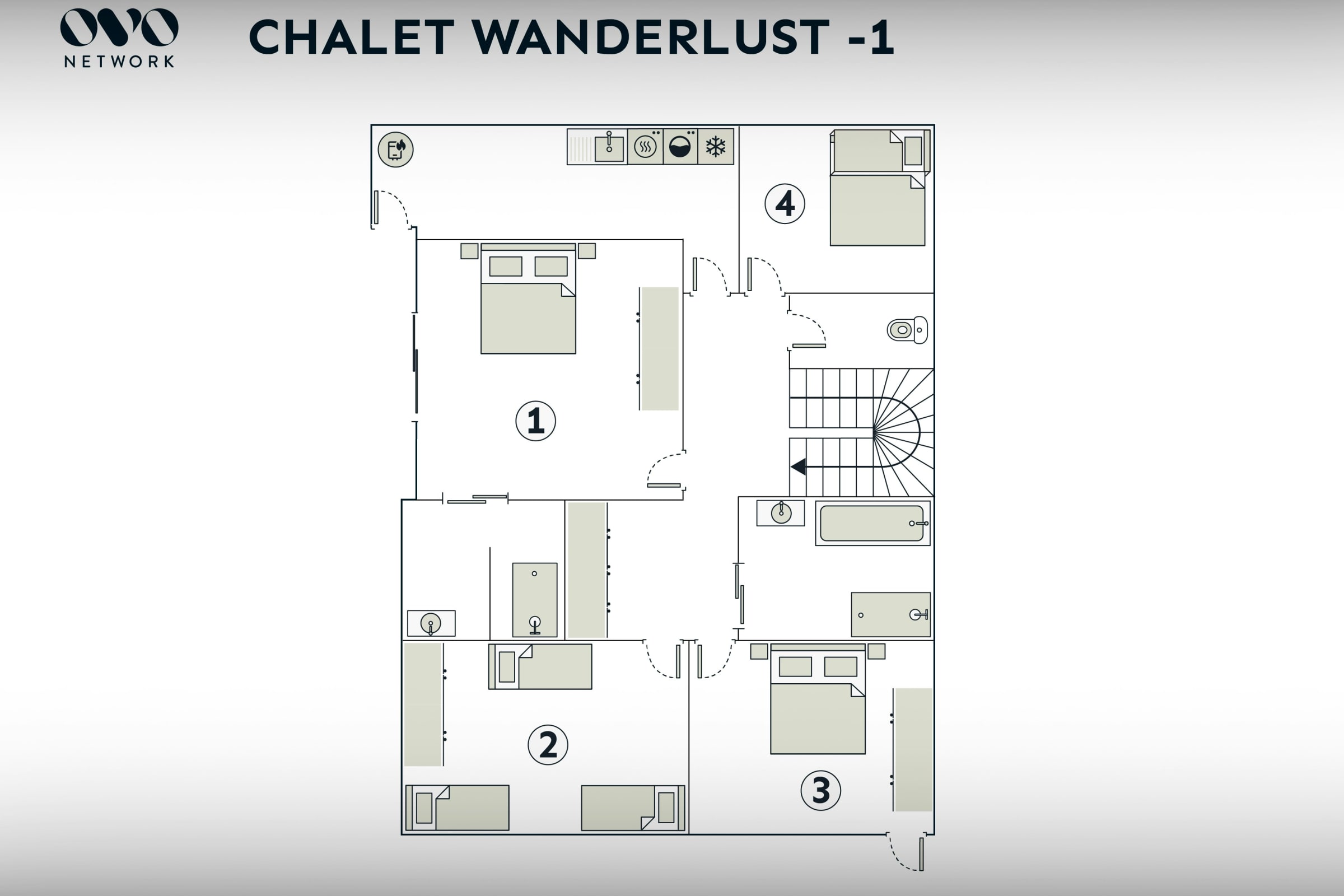 Chalet Wanderlust is a two-storey, semi-detached chalet for up to 10 guests, with four bedrooms and two bathrooms.