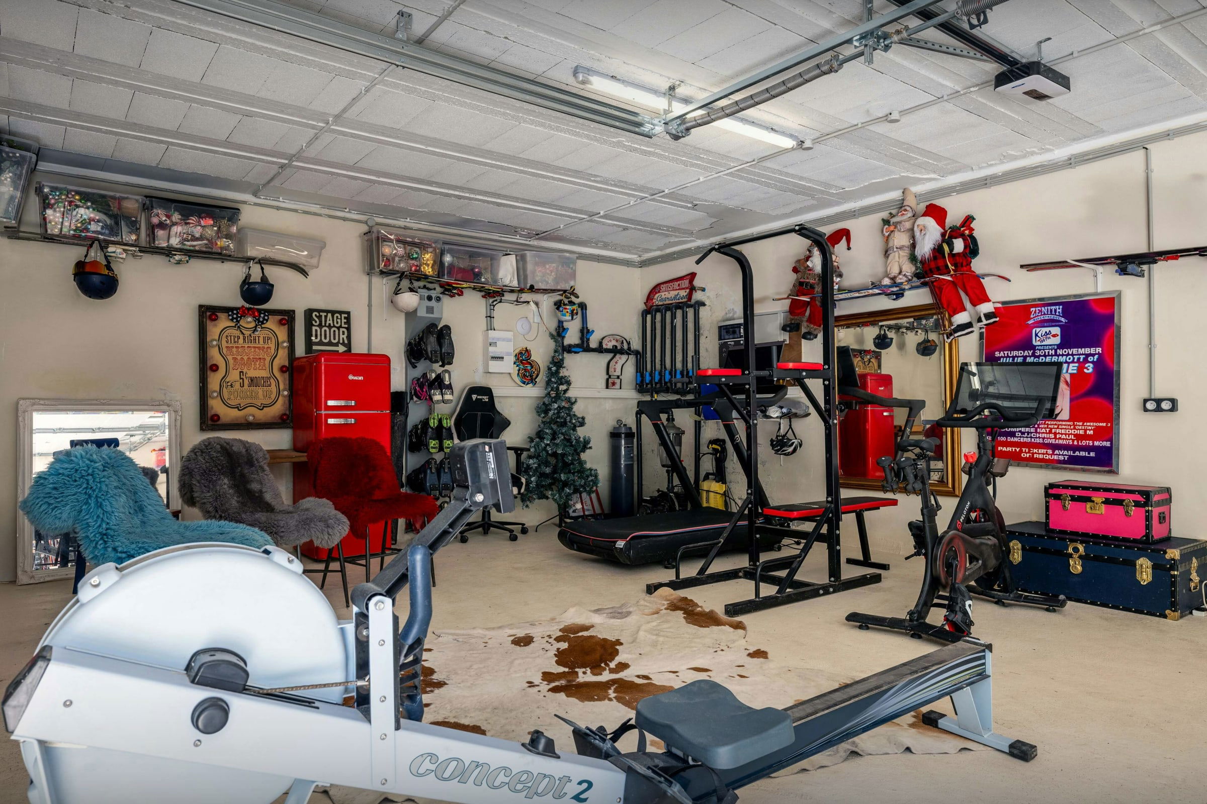 The garage has gym equipment and storage for bikes, and there's plenty of parking outside.