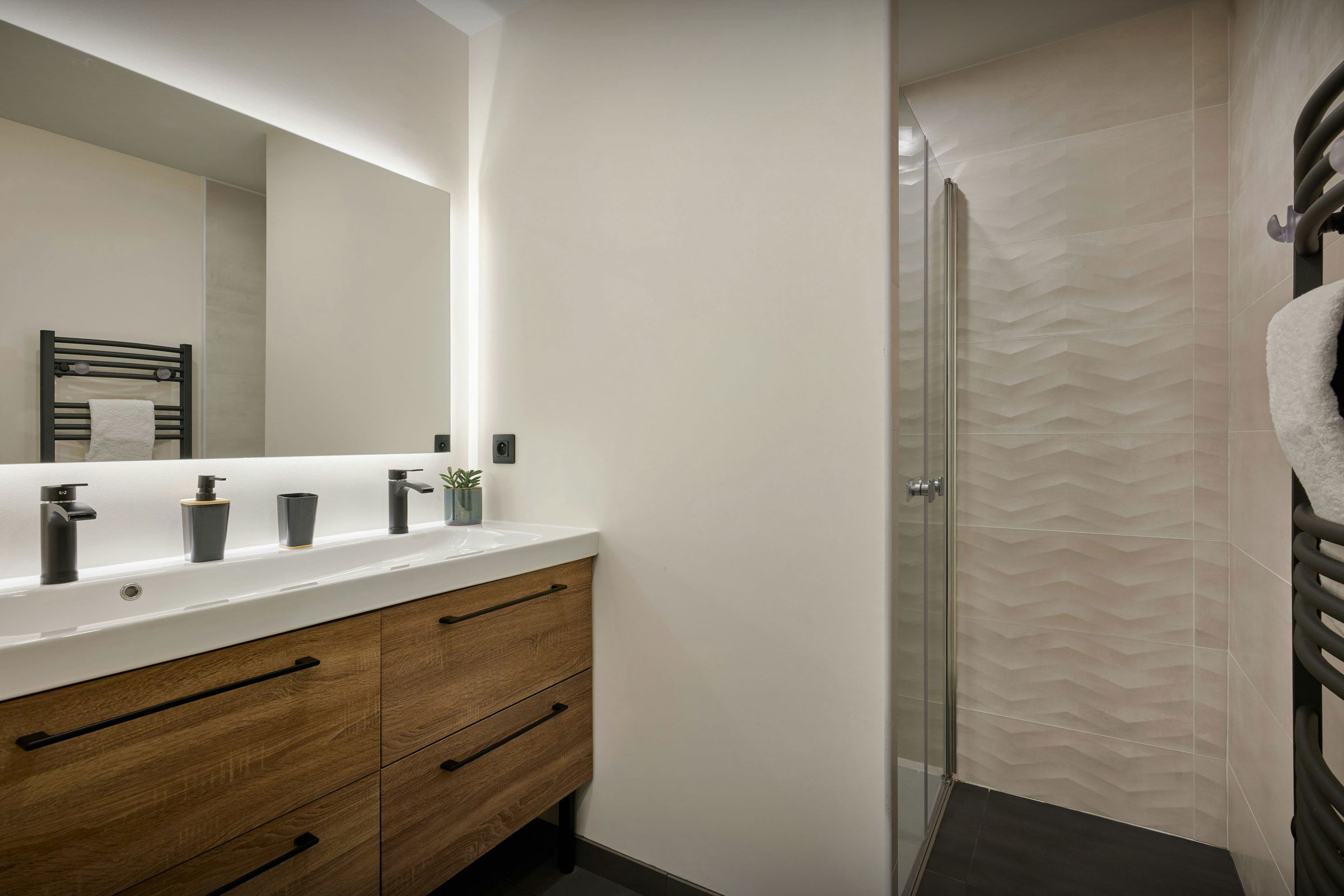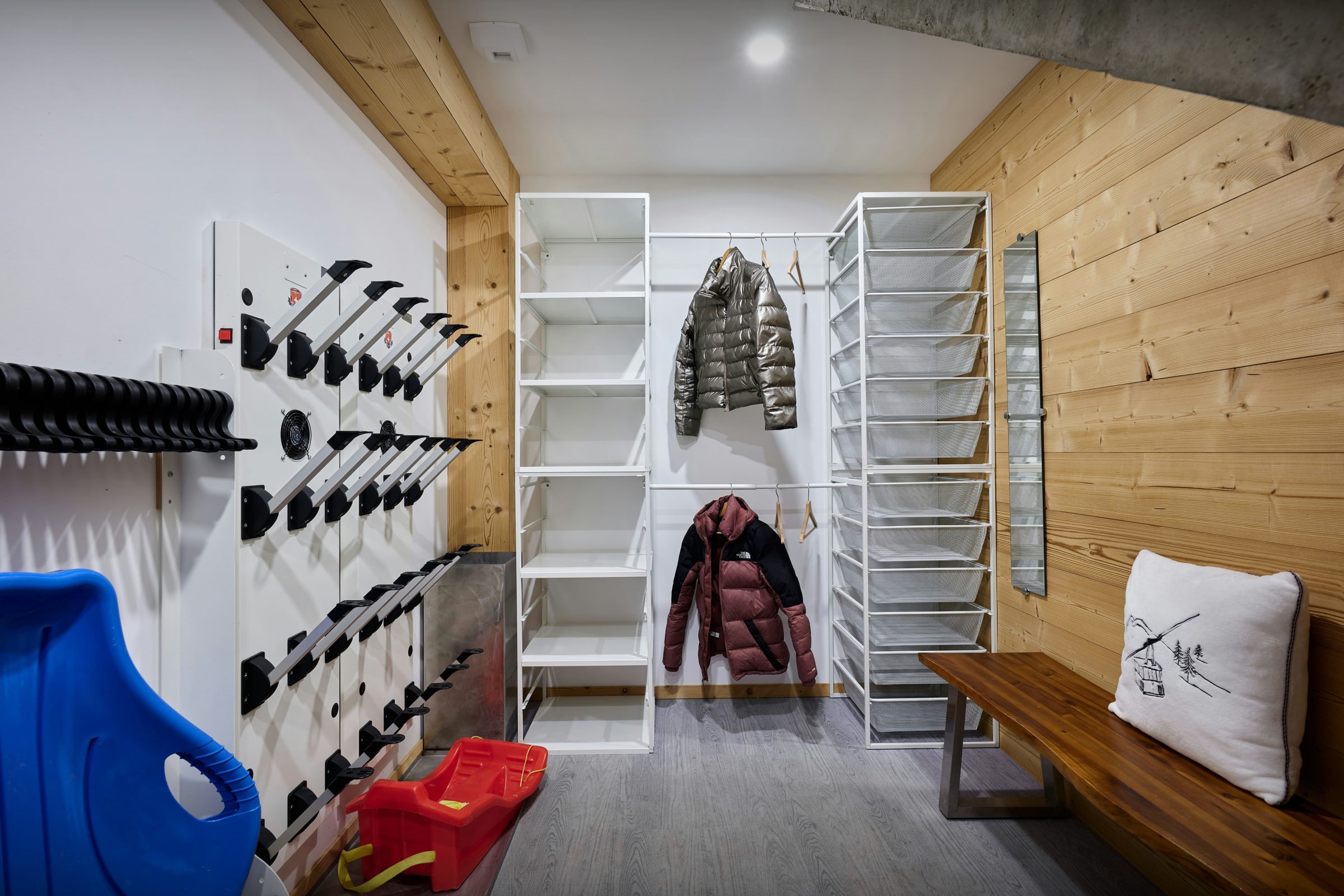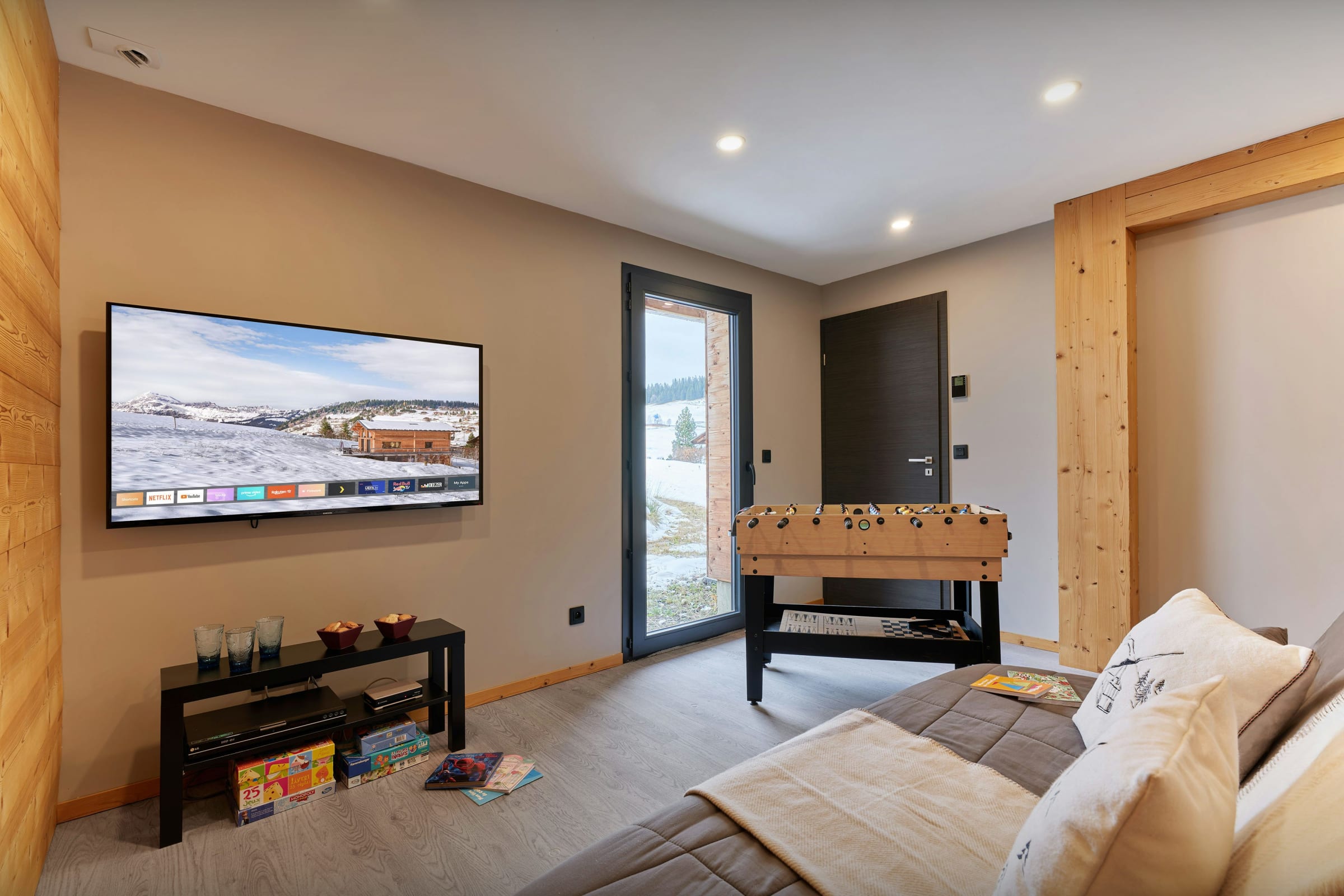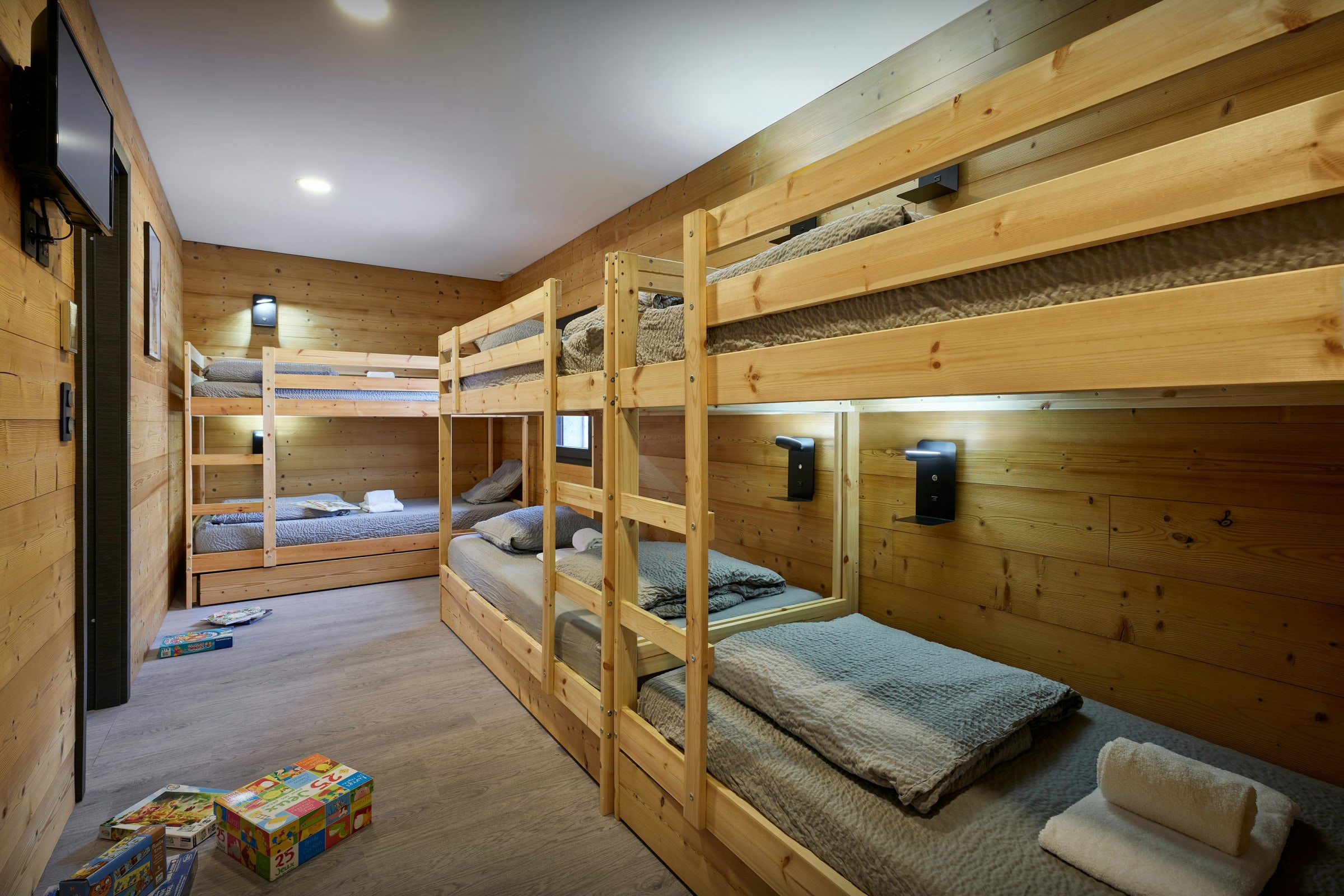 The ground floor has a garage, a ski room with a heated boot dryer, and a leisure room with a TV and table football. Six people can sleep in the neighbouring bunk room, which has a shower room with separate toilet.