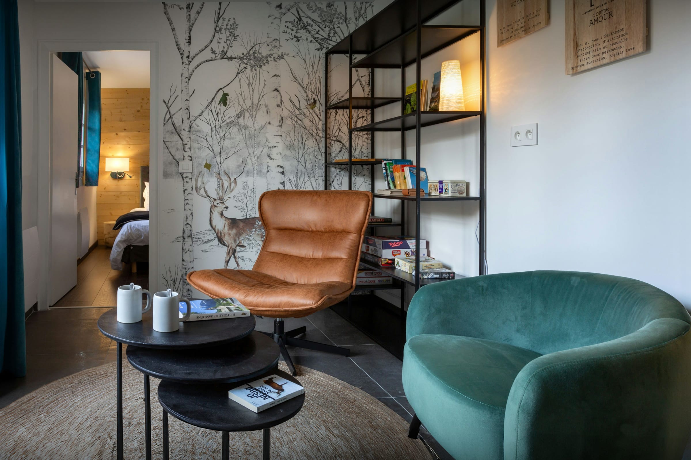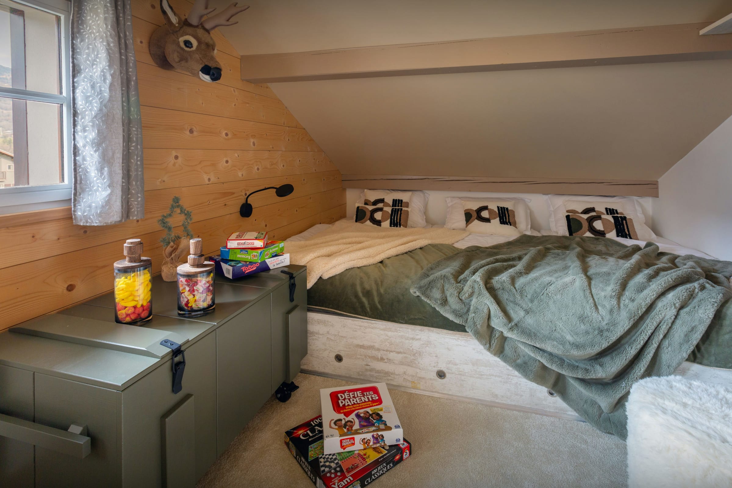 On the floor is the bright kitchen and living room, which is furnished with an L-shaped sofa, TV, dining table and wood-burning stove, creating a cosy atmosphere. This area opens onto a south-facing terrace with a small table and barbecue. The ground floor has a cosy reading room, equipped with board games and a fridge, providing an ideal space to relax after the day's activities.