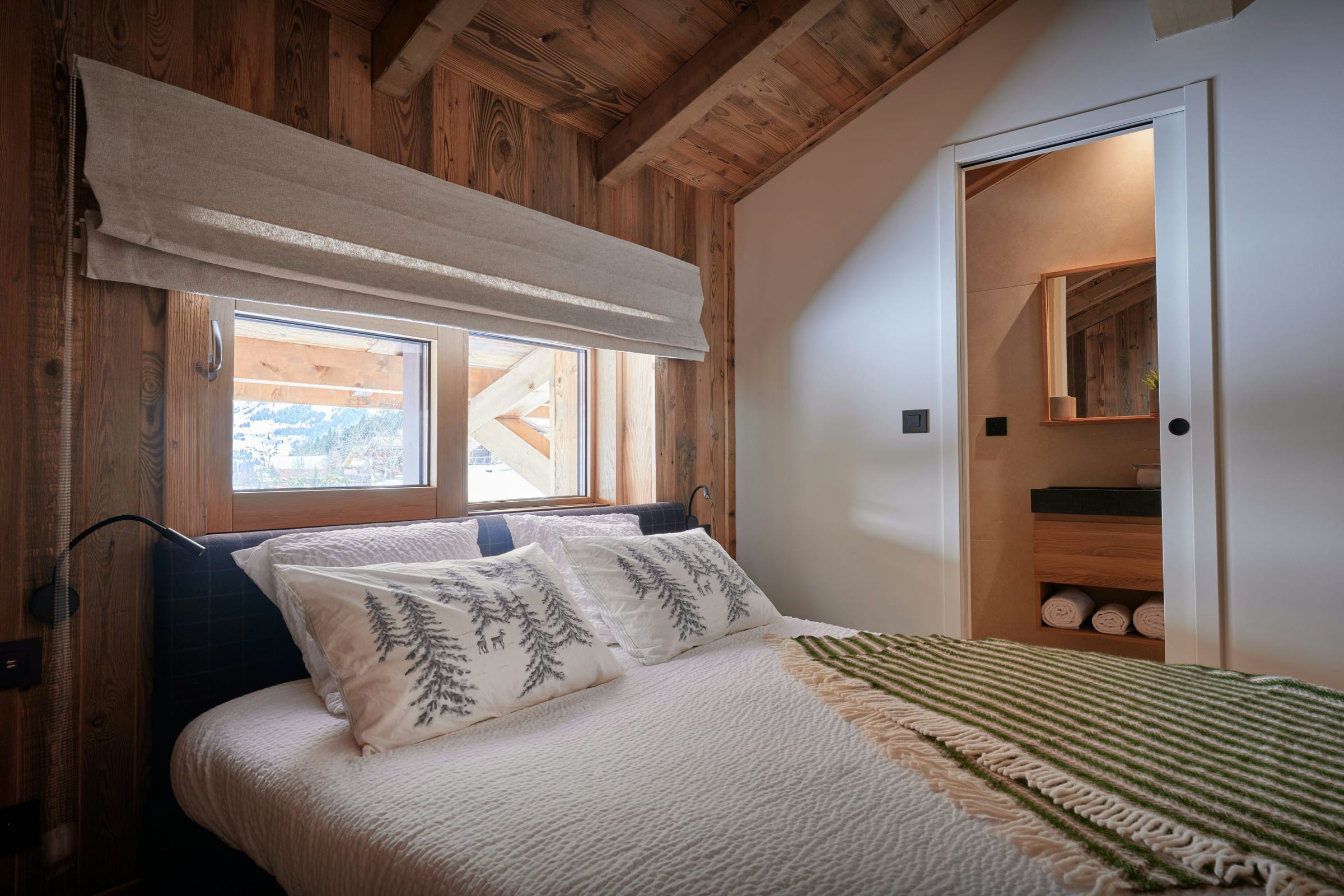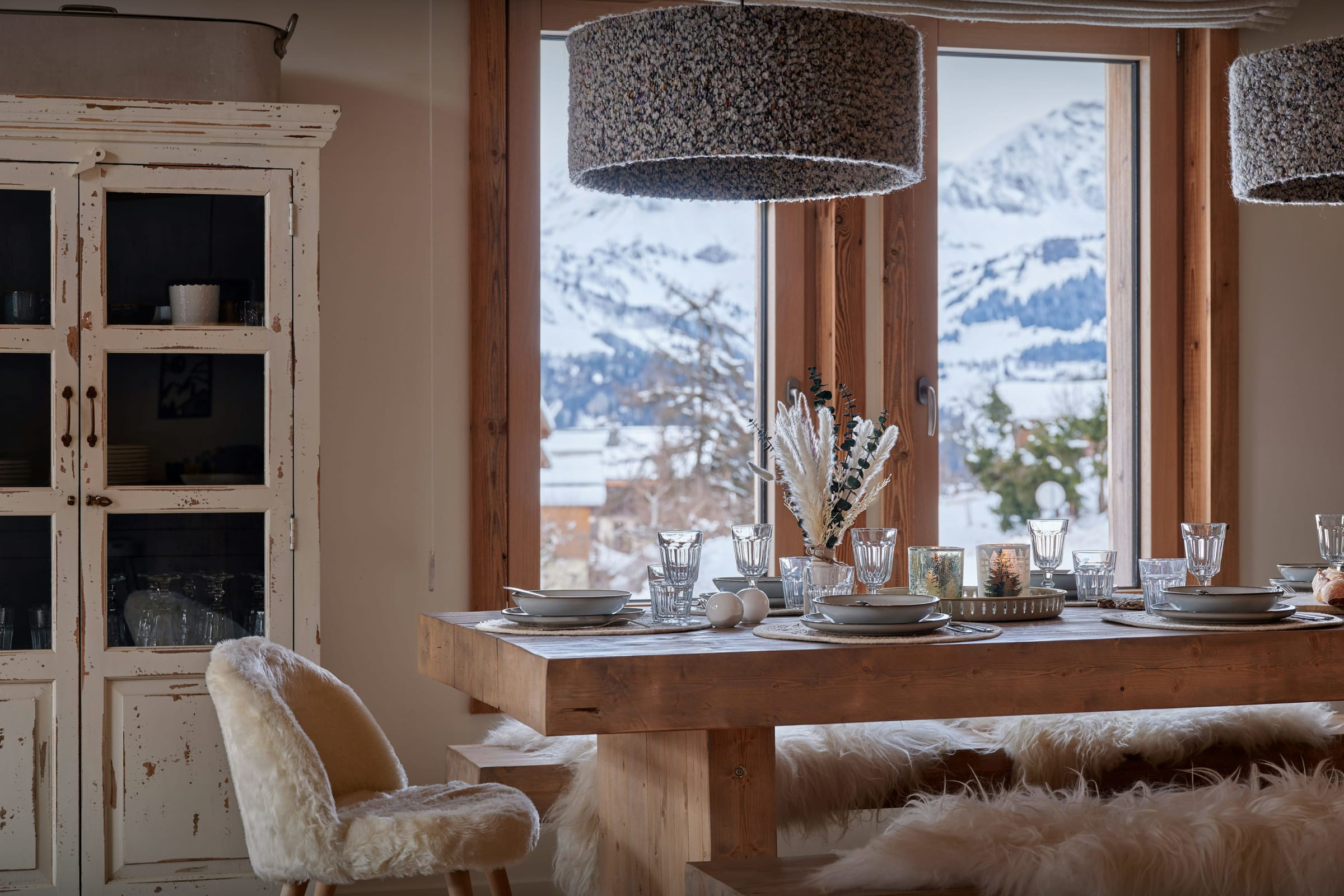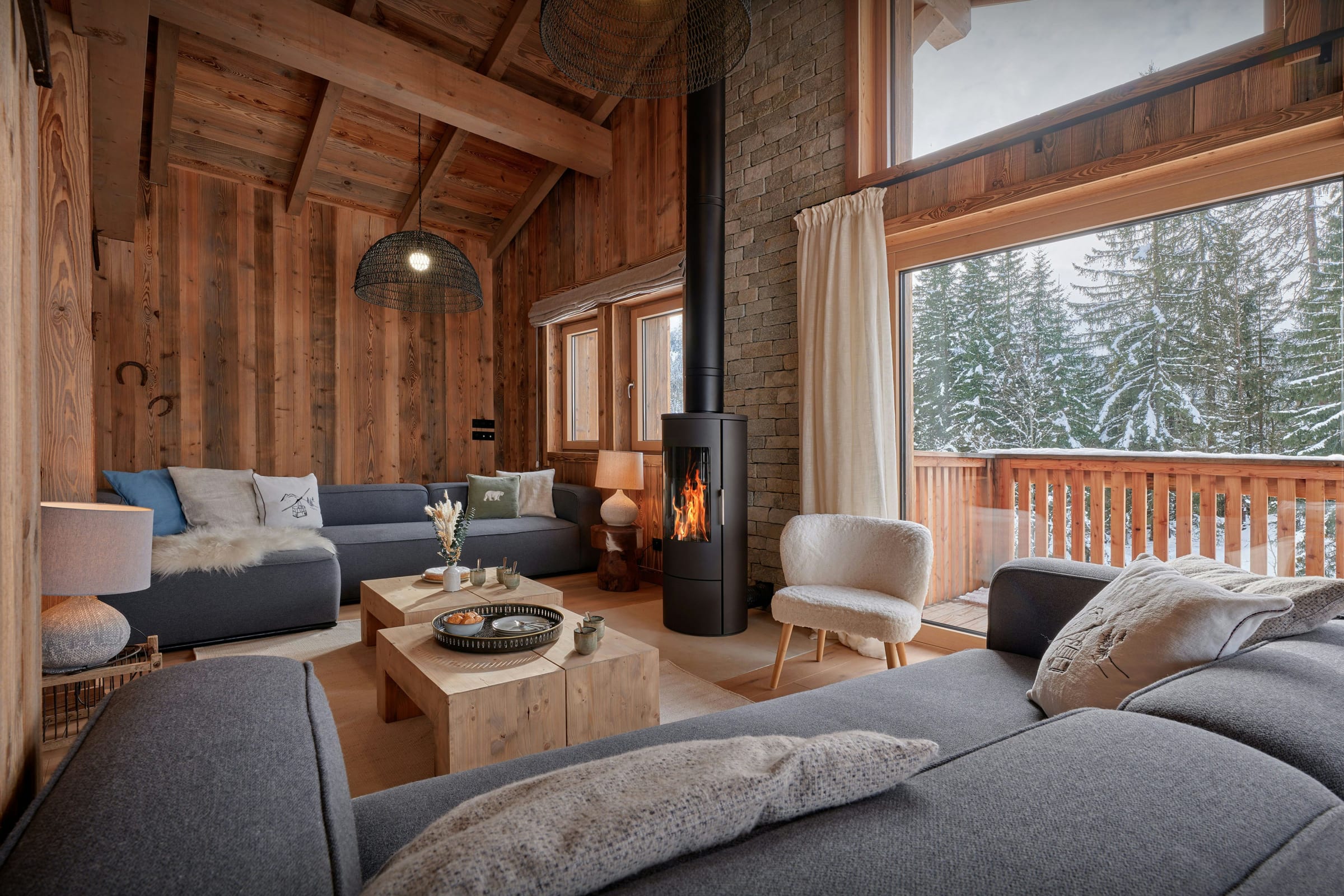 The living area on the second floor is bathed in light, thanks to floor-to-ceiling windows and French doors opening onto a delightful corner balcony. From here, you can admire the sensational view of Mont Charvin and the Aravis mountains. And at the end of an exciting day, the two large sofas are the perfect place to gather around the wood-burning stove and recount your adventures. You won't find a TV here, as Chalet Marmot'Inn is all about sharing good times with friends and family.