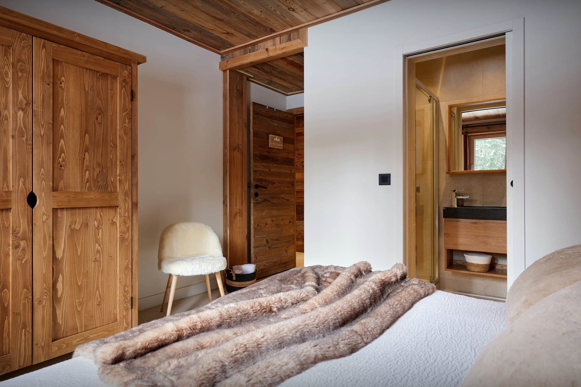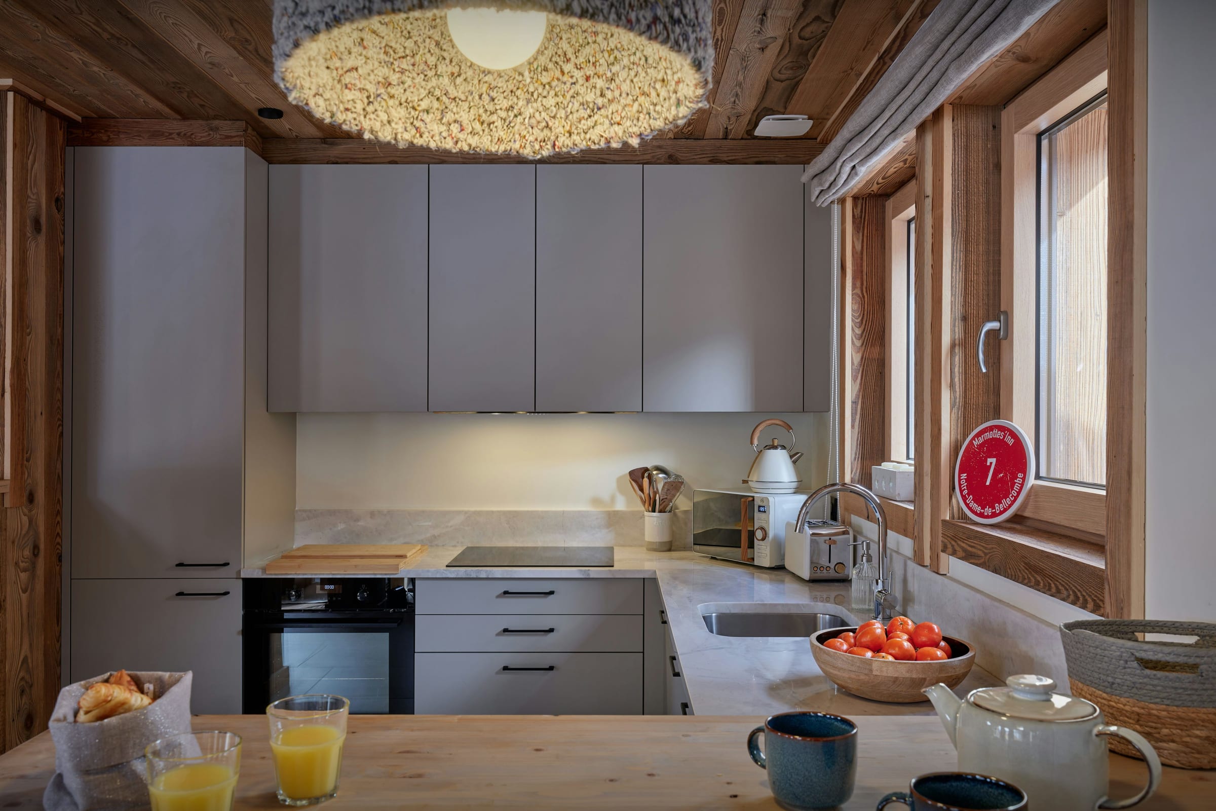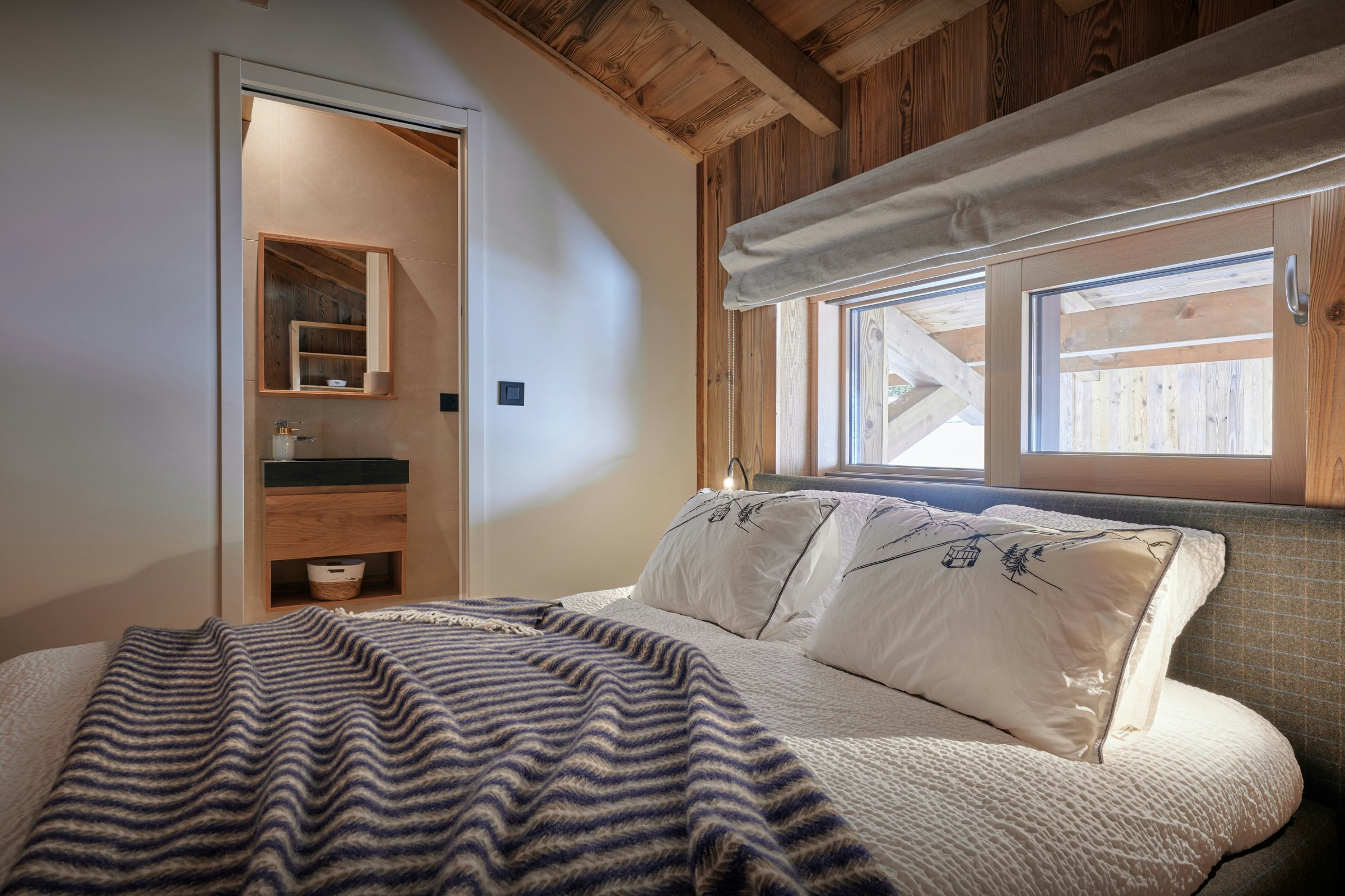 The living area on the second floor is bathed in light, thanks to floor-to-ceiling windows and French doors opening onto a delightful corner balcony. From here, you can admire the sensational view of Mont Charvin and the Aravis mountains. And at the end of an exciting day, the two large sofas are the perfect place to gather around the wood-burning stove and recount your adventures. You won't find a TV here, as Chalet Marmot'Inn is all about sharing good times with friends and family.