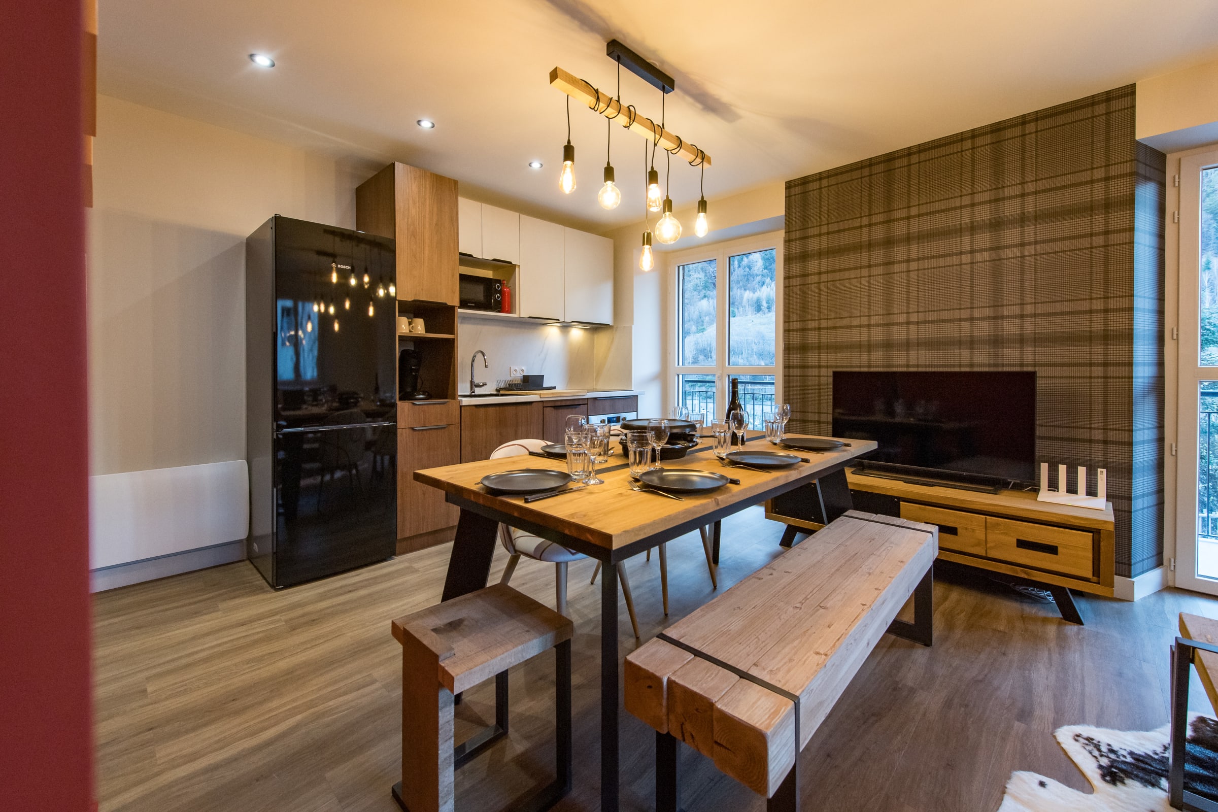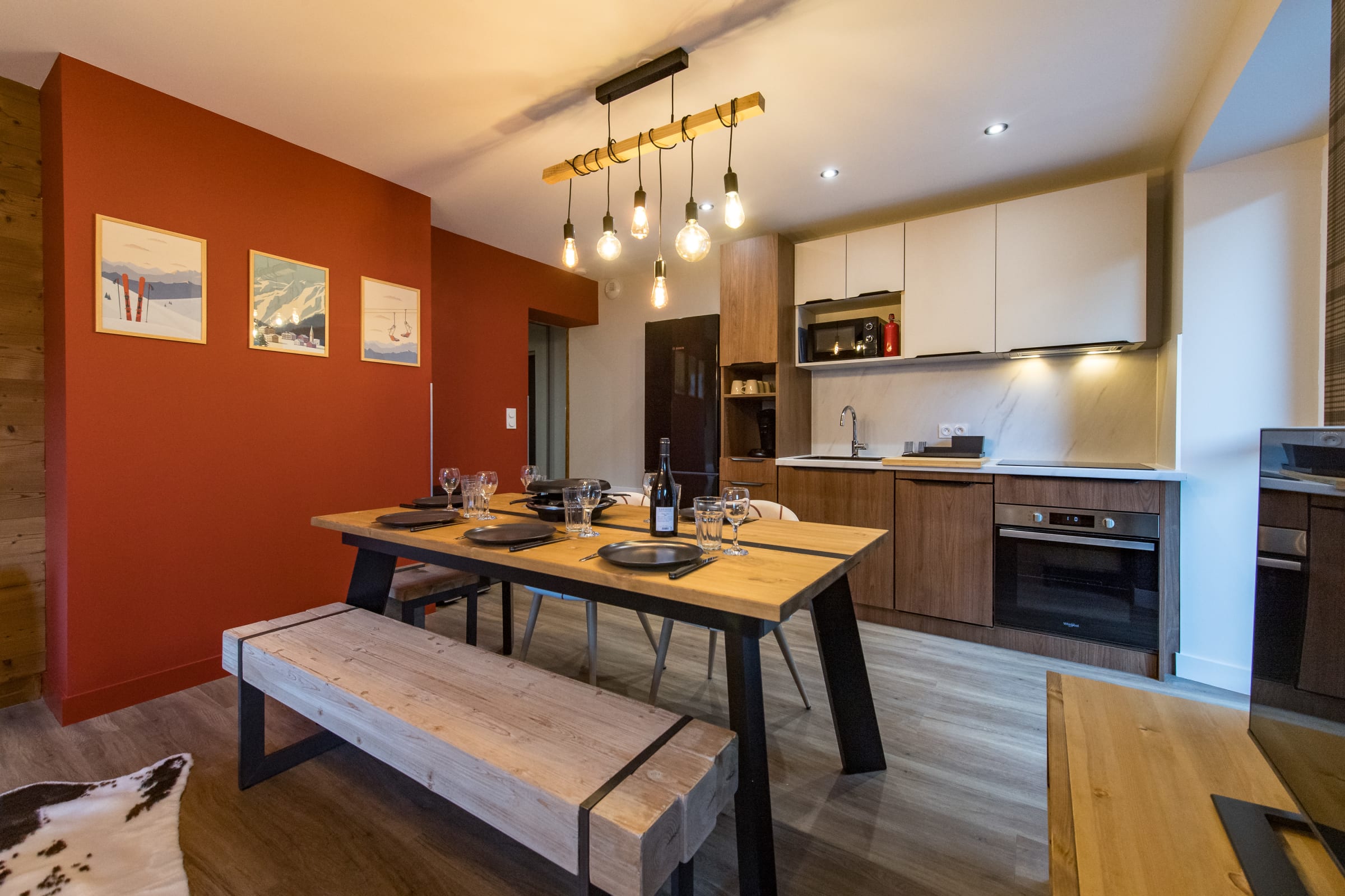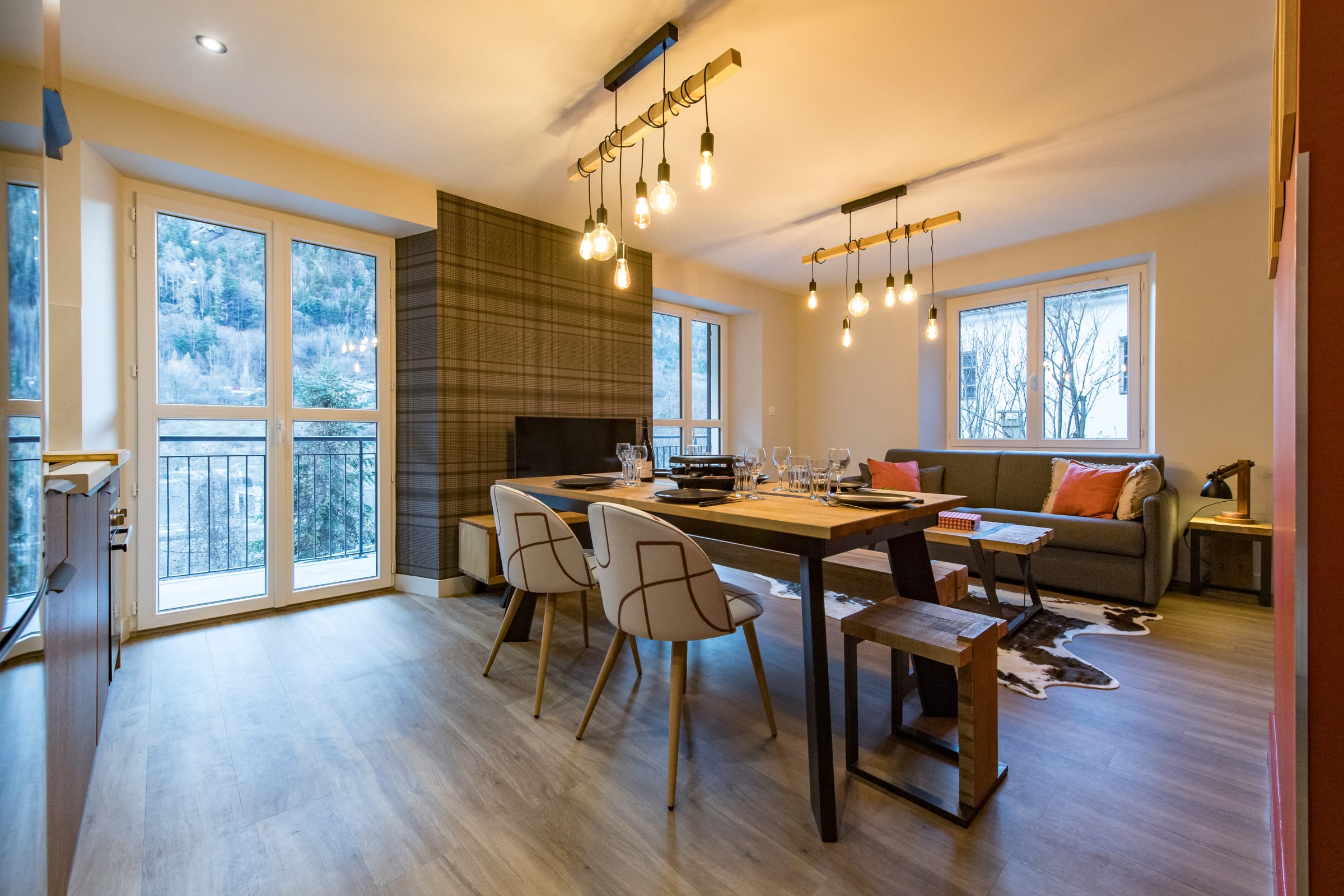 The living room features a comfortable queen-size sofa bed (160 x 200 cm), perfect for relaxing after a day on the slopes or bike rides. The open-plan kitchen is fully equipped with everything you need: fridge, oven, microwave, dishwasher, filter and pod coffee makers, raclette set, kettle, and toaster. A Smart TV is also provided for watching the news or streaming your favorite shows. A small balcony offers a quiet spot to unwind.