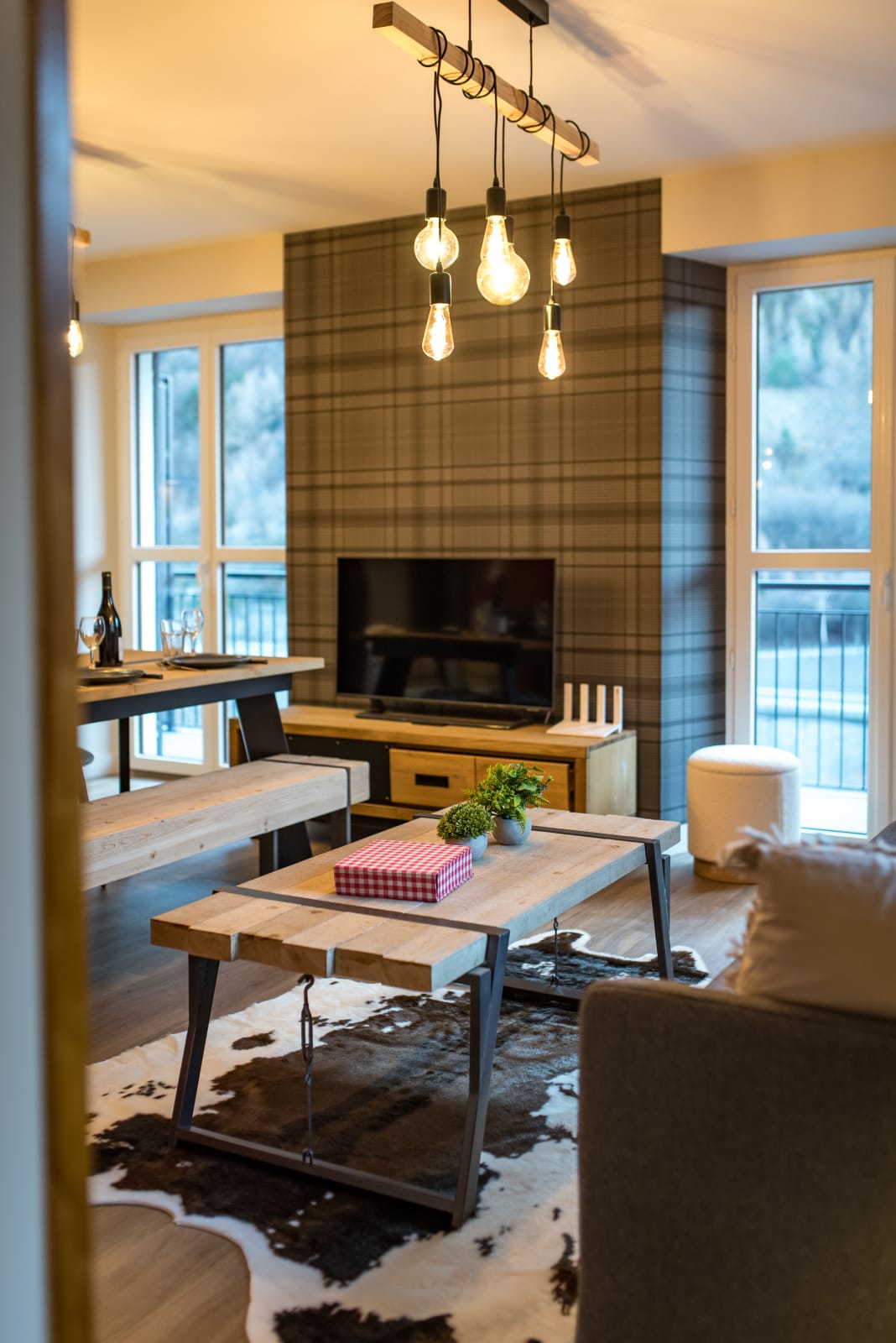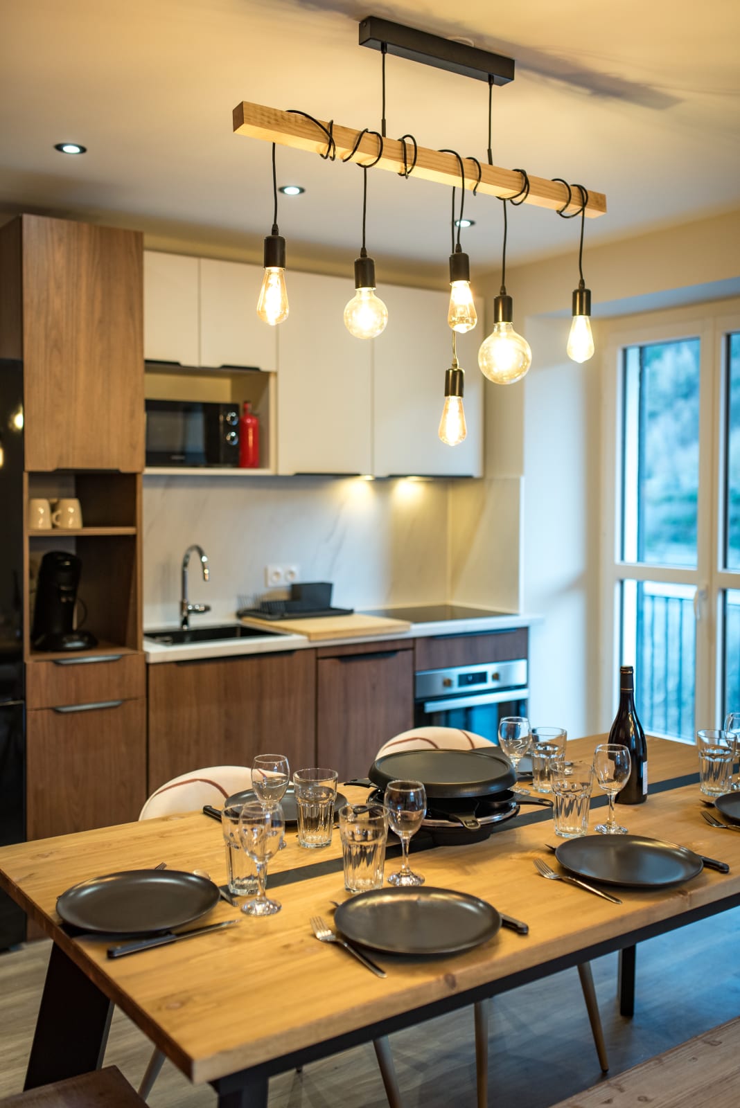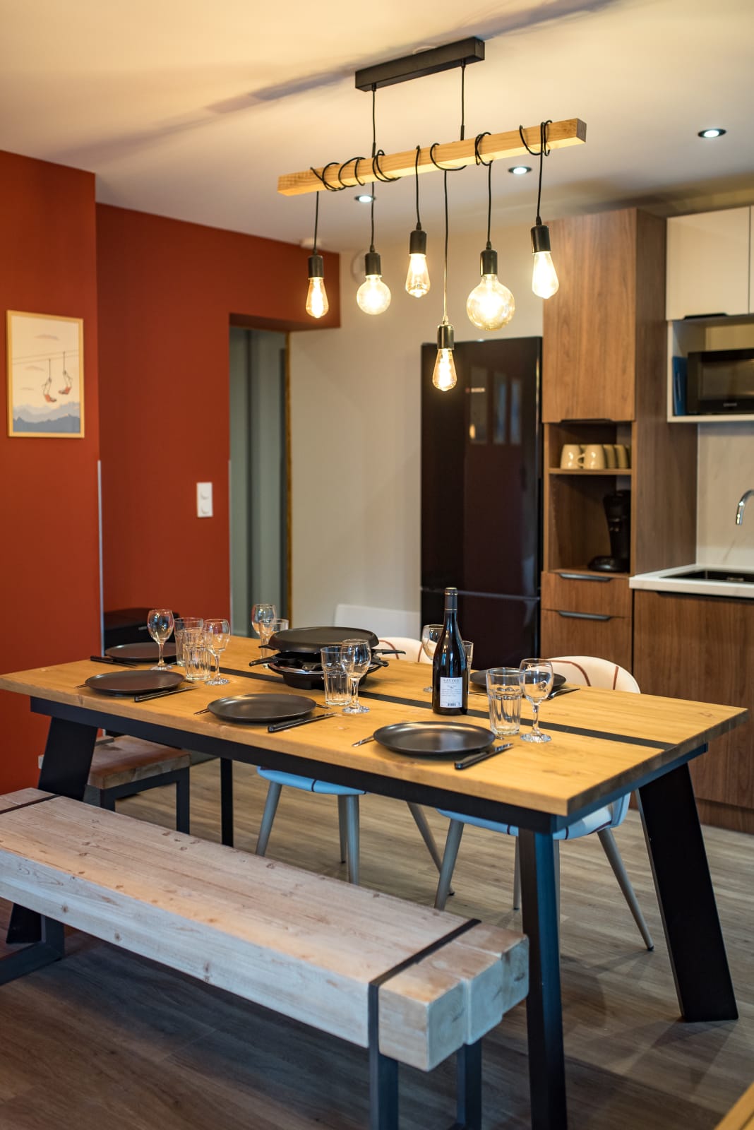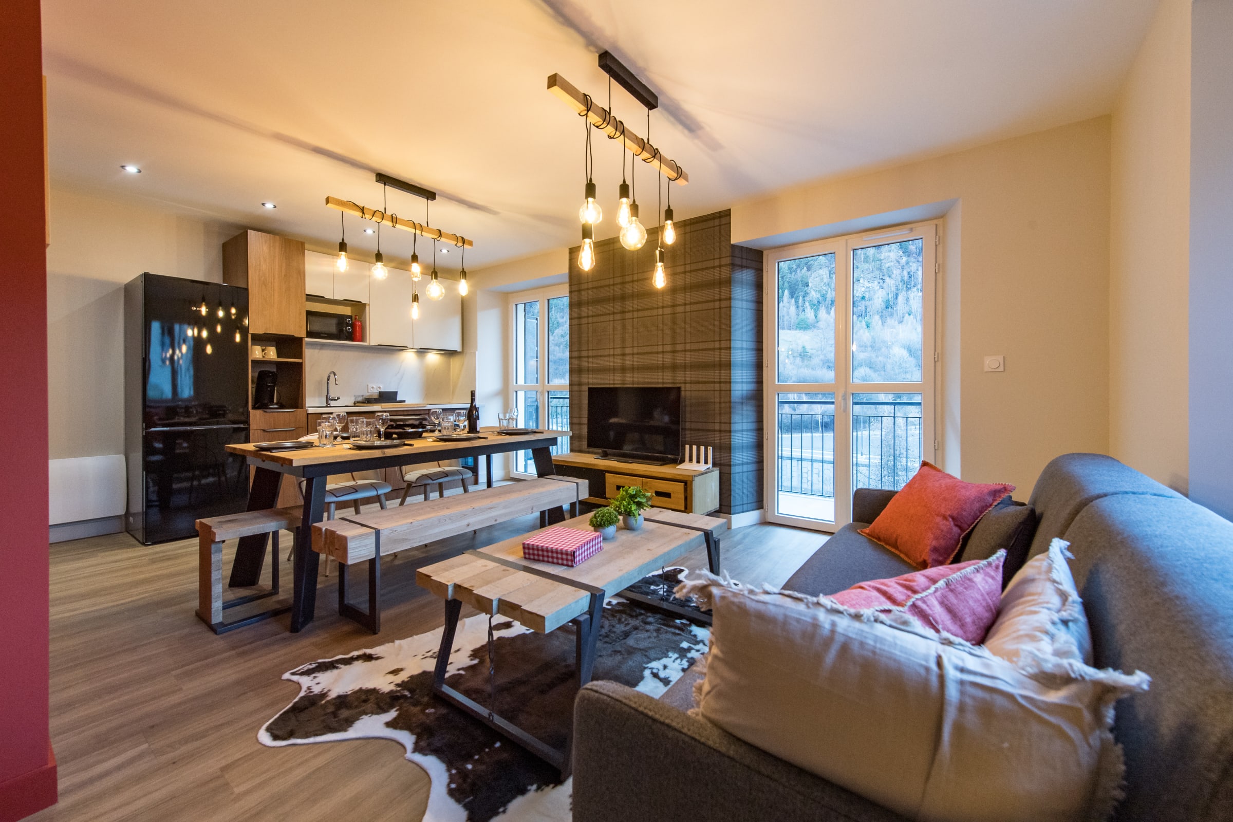 The living room features a comfortable queen-size sofa bed (160 x 200 cm), perfect for relaxing after a day on the slopes or bike rides. The open-plan kitchen is fully equipped with everything you need: fridge, oven, microwave, dishwasher, filter and pod coffee makers, raclette set, kettle, and toaster. A Smart TV is also provided for watching the news or streaming your favorite shows. A small balcony offers a quiet spot to unwind.