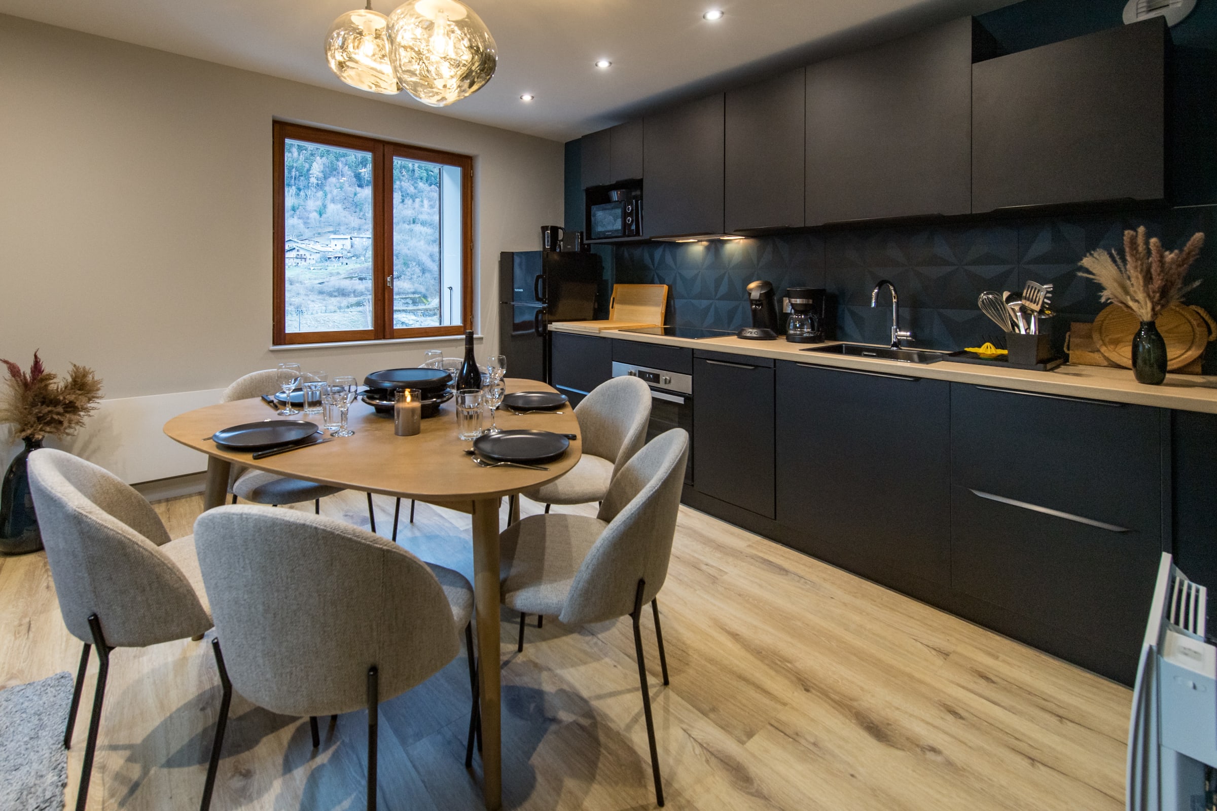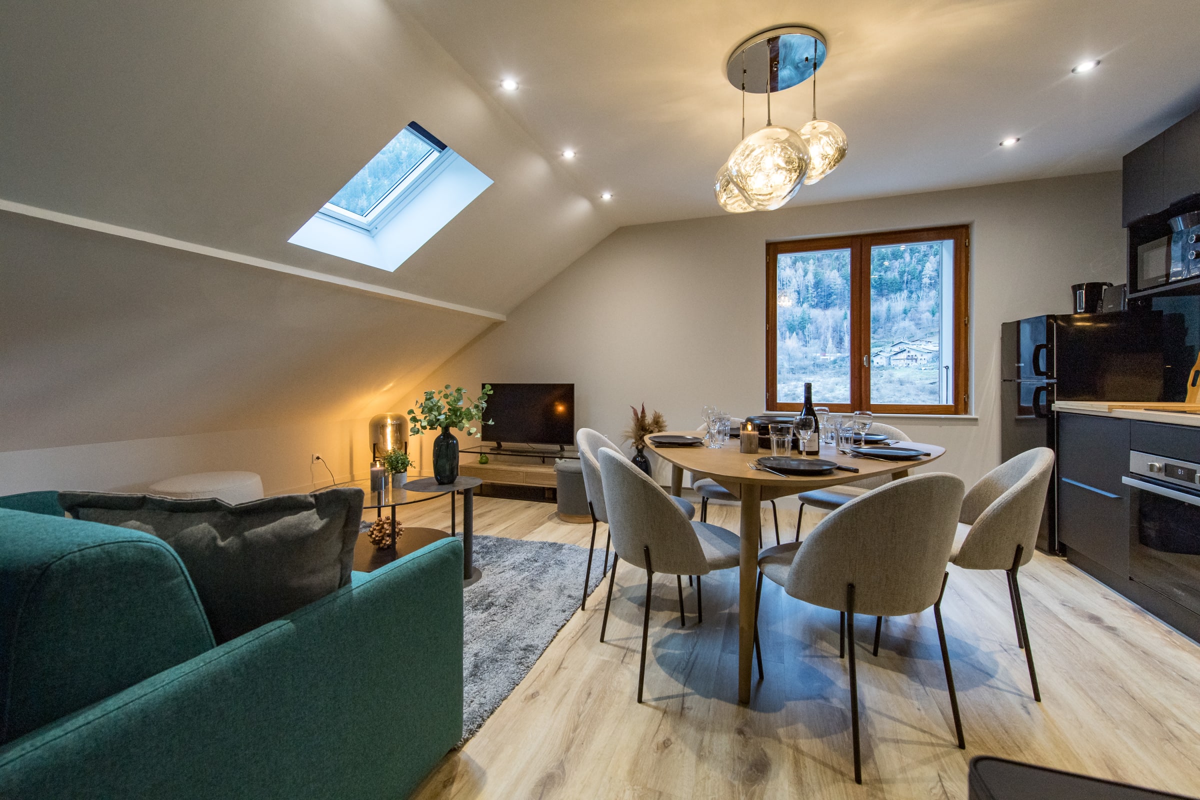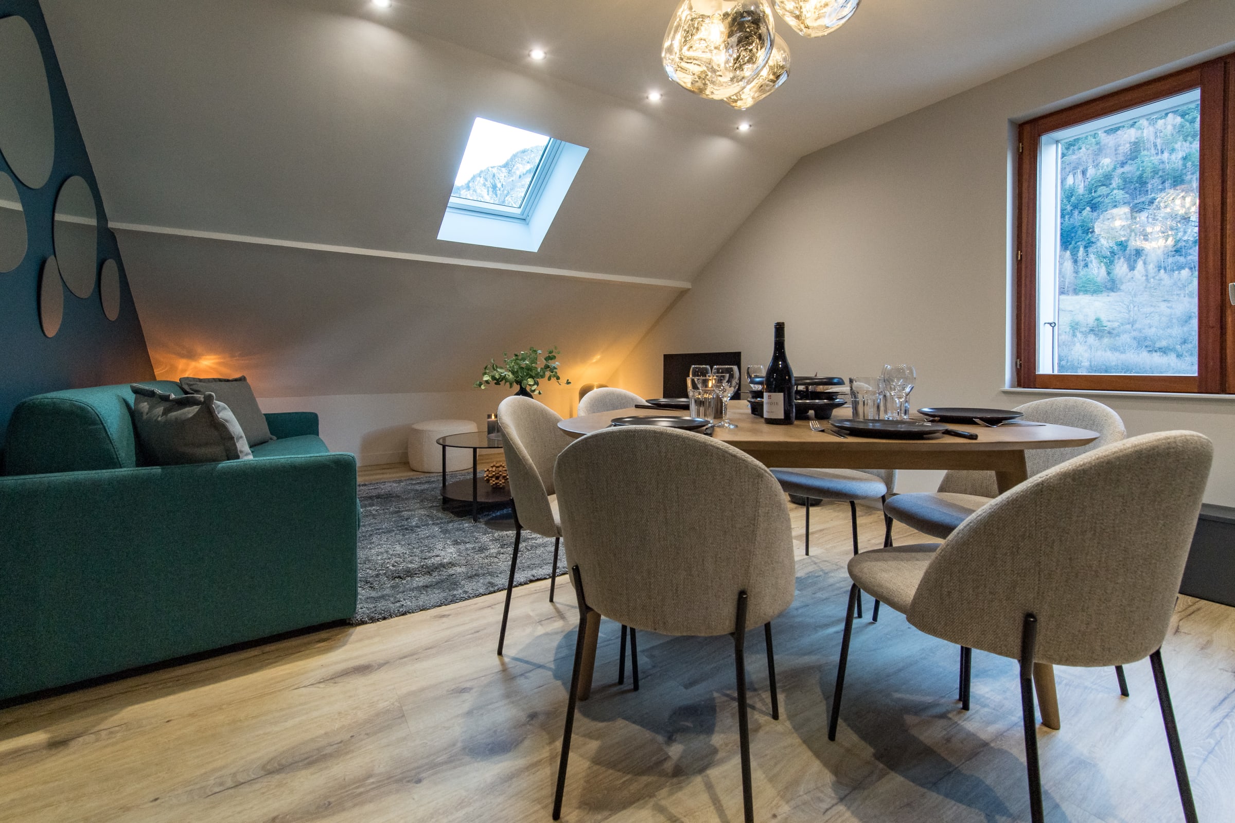 The living room includes a comfortable queen-size sofa bed (160 x 200 cm), perfect after a day on the slopes or riding through the mountains. The open-plan kitchen is fully equipped: fridge, oven, microwave, dishwasher, filter and pod coffee machines, raclette set, kettle, and toaster. A Smart TV is available for watching the news or streaming content.